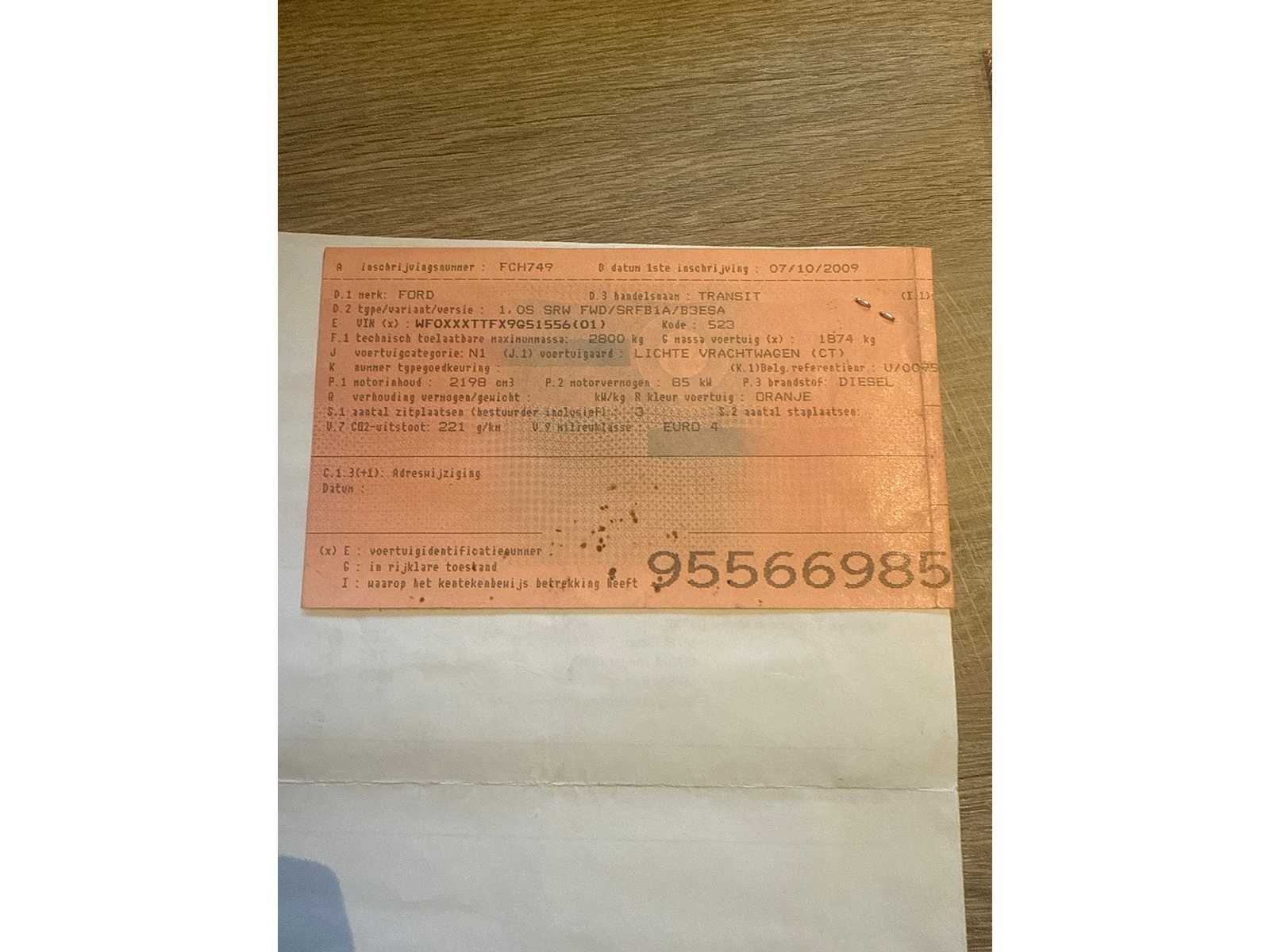START NIET WILT WEL STARTEN OP STARTPILOT DENK PROBLEEM MET INJECTOR OF DIESELPOMP 1 STE EIGENAAR Nee Merk: FORD Model: TRANSIT Bouwjaar: 2009 Afgelezen kilometerstand: 76000km Cilinderinhoud: 2198cc Vermogen (kW): 85kW Brandstof: DIESEL Chassisnummer: WF0XXXTTFX9G51556 Datum eerste toelating: 07-10-2009 Kleur: ORANJE Transmissie: MANUEEL Emissieklasse: 4 Aantal deuren: 4 Aantal sleutels: 1 Onderhoudshistorie: JA Gelijkvormigheidsattest aanwezig: true Carpass: true Start en rijdt: NEEN Andere boorddocumenten: COMPLEET startinformatie : NEEN Inschrijvingsbewijs - deel 1 : AANWEZIG Inschrijvingsbewijs - deel 2: AANWEZIG