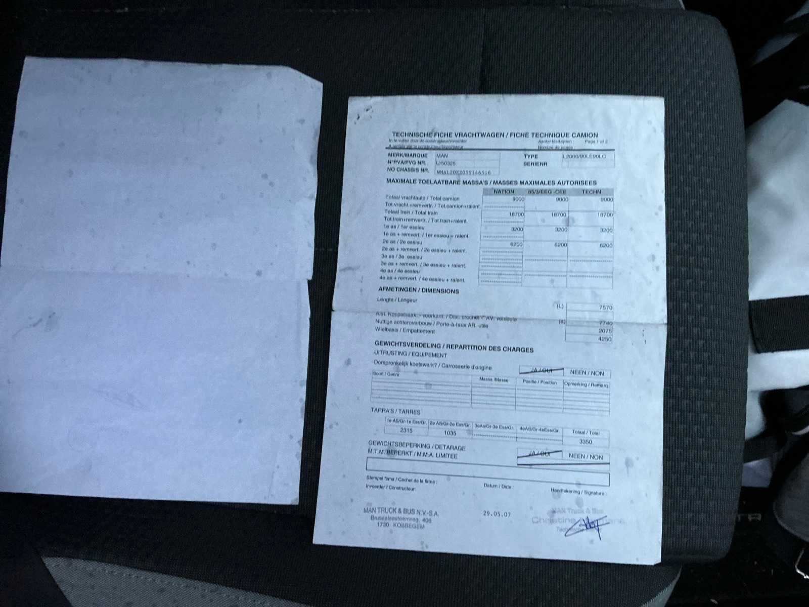 Aanwezig boorddocumenten; inschrijvingsbewijs deel 1 en 2, gelijkvormigheidsattest en identificatieverslag Nee Merk: MAN Bouwjaar: 2005 Chassisnummer VIN: WMAL20ZZ05Y146516 Cilinderinhoud: 4580cc Datum eerste toelating: 03/05/2005 Type transmissie: Handmatig Aantal assen: 2 Aantal sleutels: 2 Hydraulische laadklep: true Startinformatie: Start mits boosten Afgelezen kilometerstand: 272200km Nationaliteit documenten: Belgisch Aantal zitplaatsen: 3 Handgeschakelde versnellingsbak: true Diesel: true