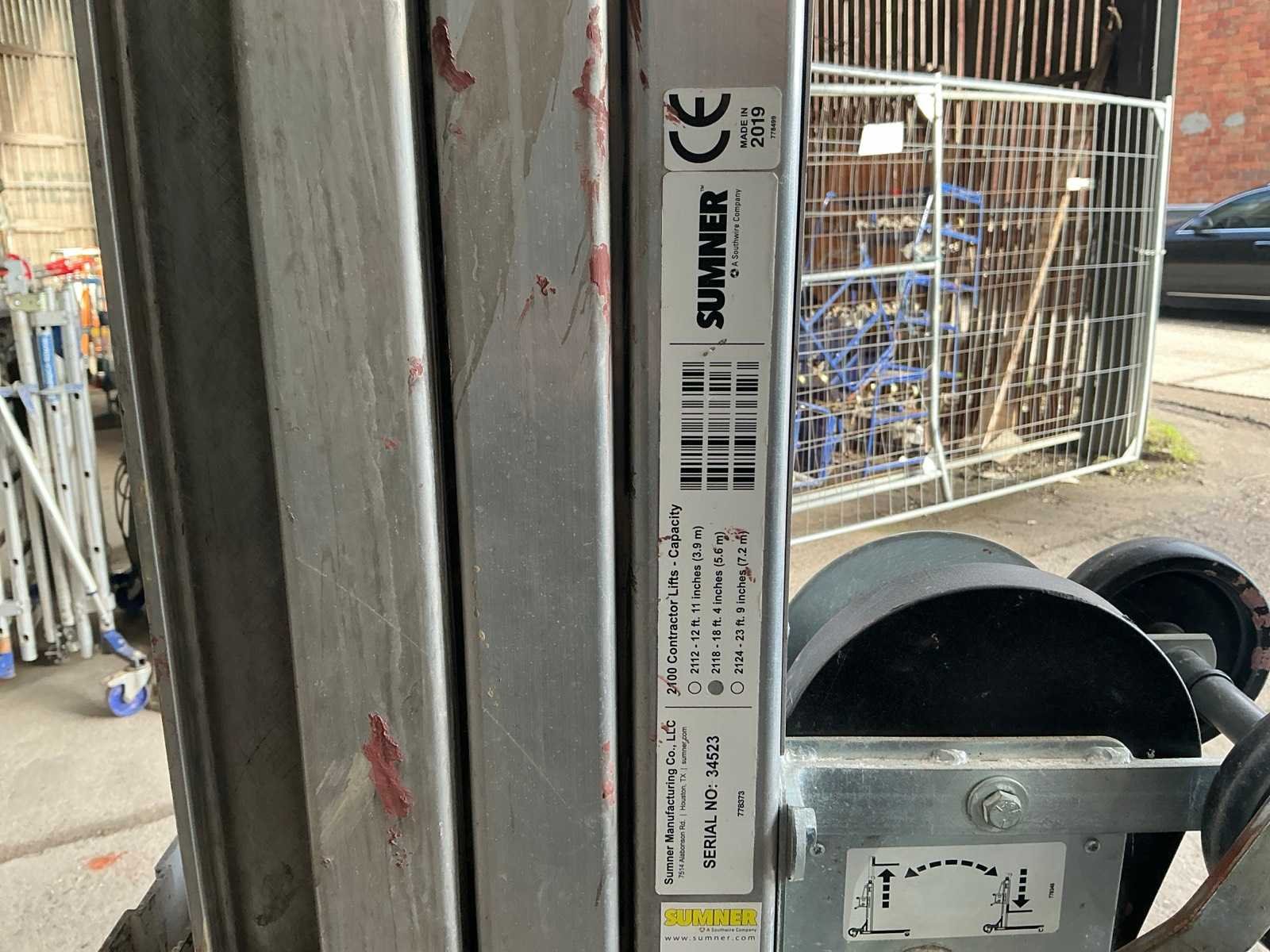 Wiel te herstellen Nee Merk: Sumner Type: Model 2118 Bouwjaar: 2019 Serienummer: 34523 Max. hefhoogte: 5600mm Max. hefcapaciteit: 300kg Totale afmeting L: 1850mm Totale afmeting Breedte: 770mm Totale afmeting Hoogte: 2250mm
