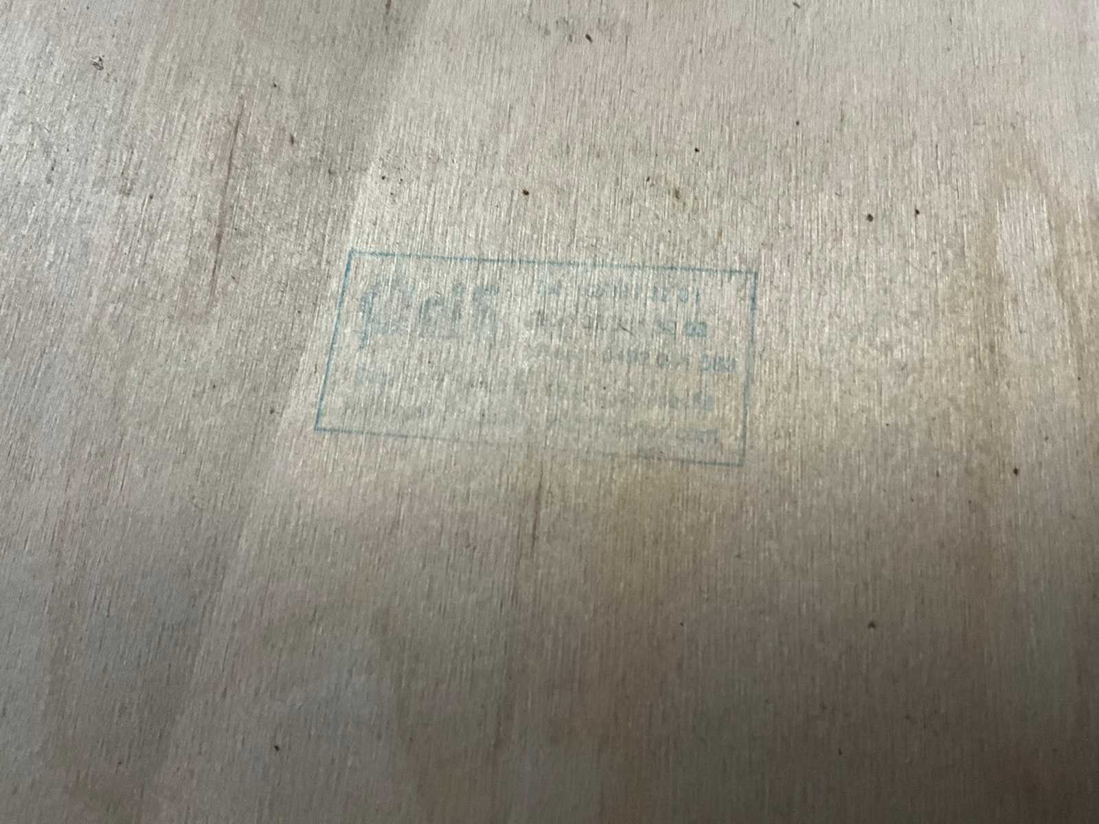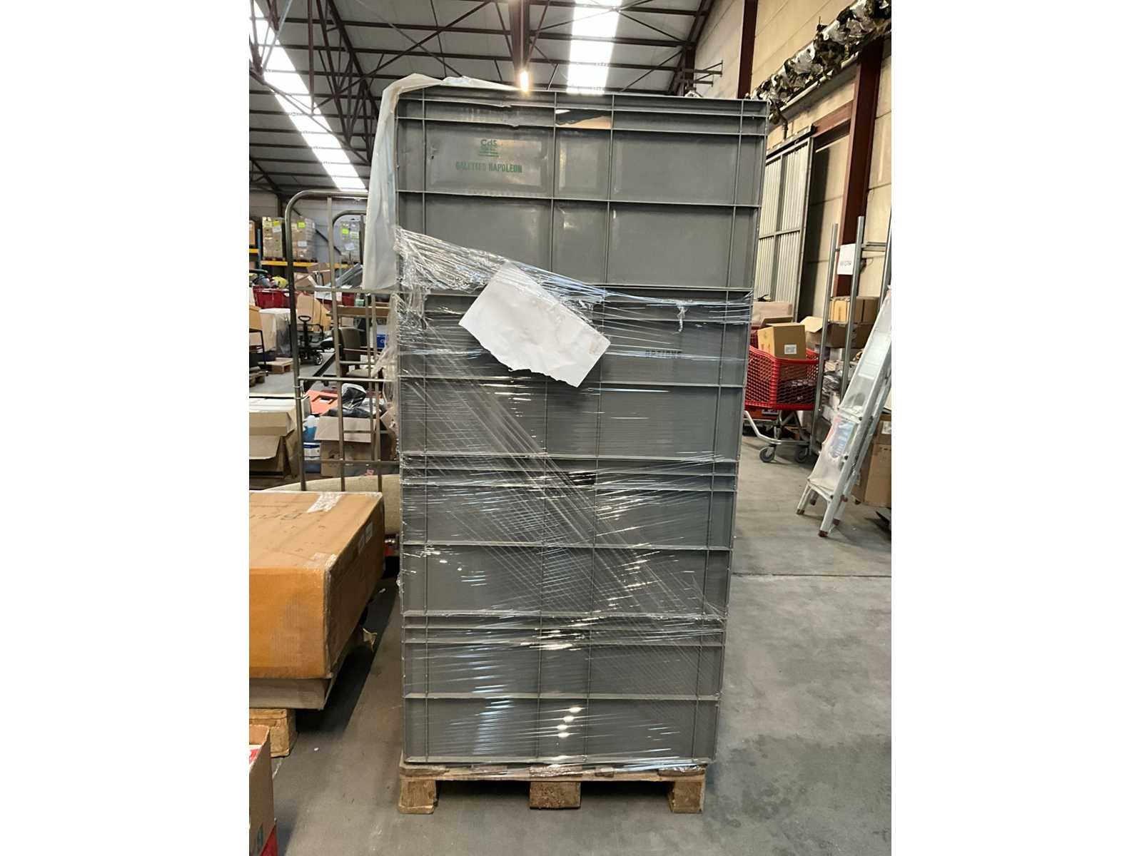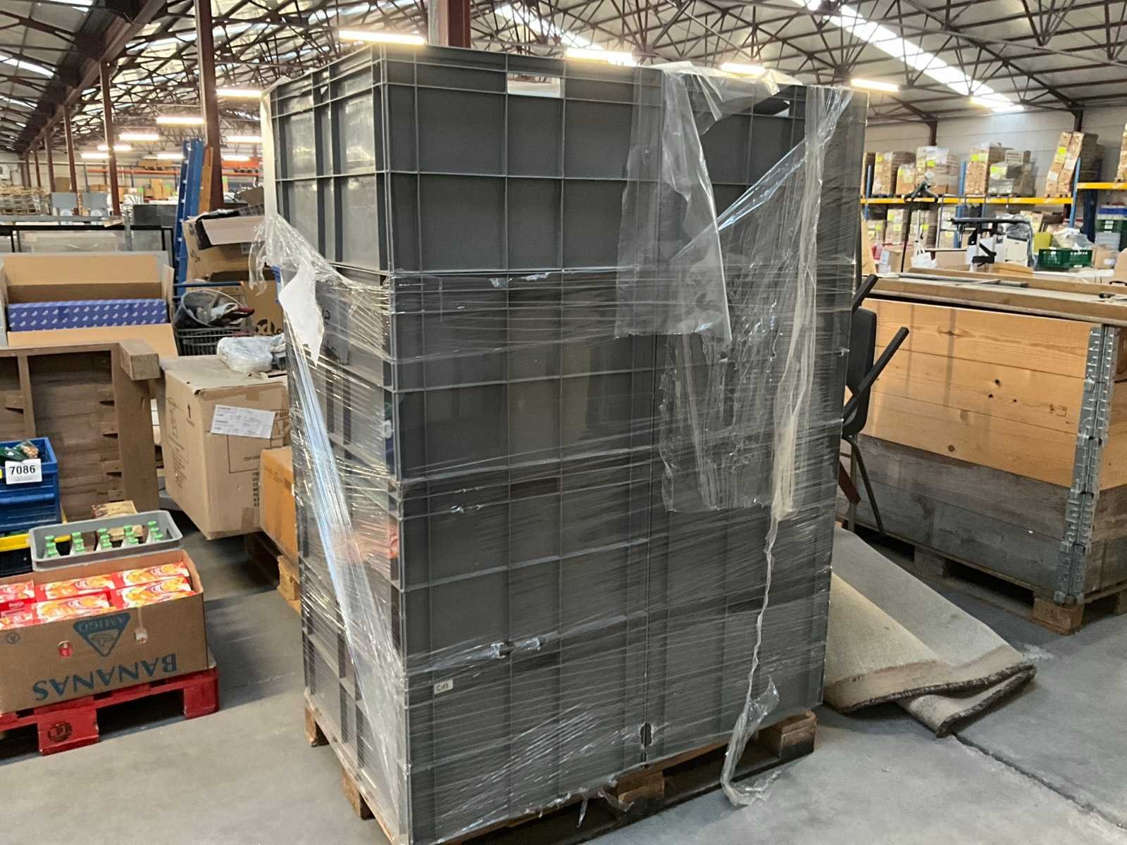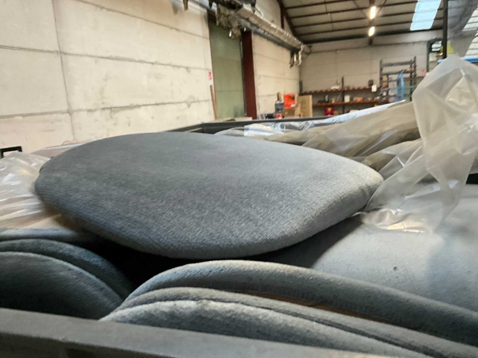 Elke opberg/stapelbak met afmeting 80 x 60 x 40 cm hoog, compleet met inhoud zijnde partij diverse houten stoelzitjes met stoffen bekleding CDS. Nee