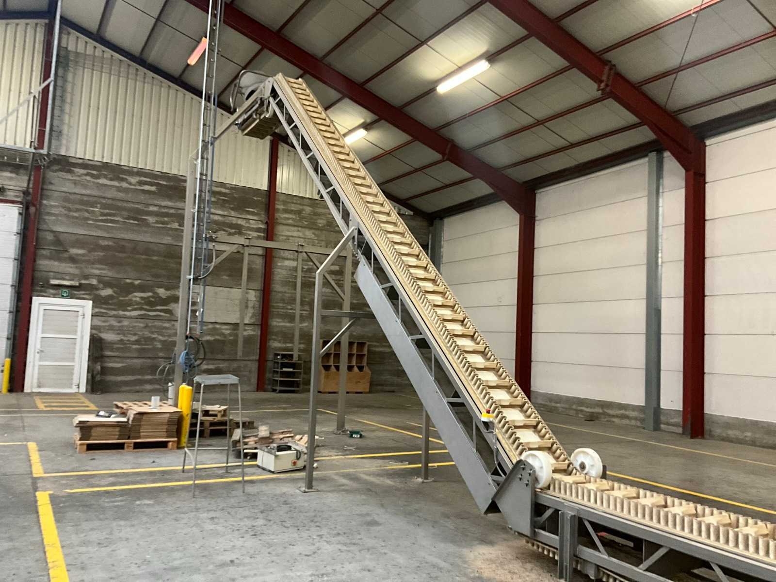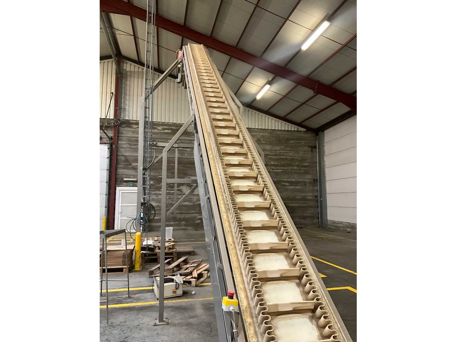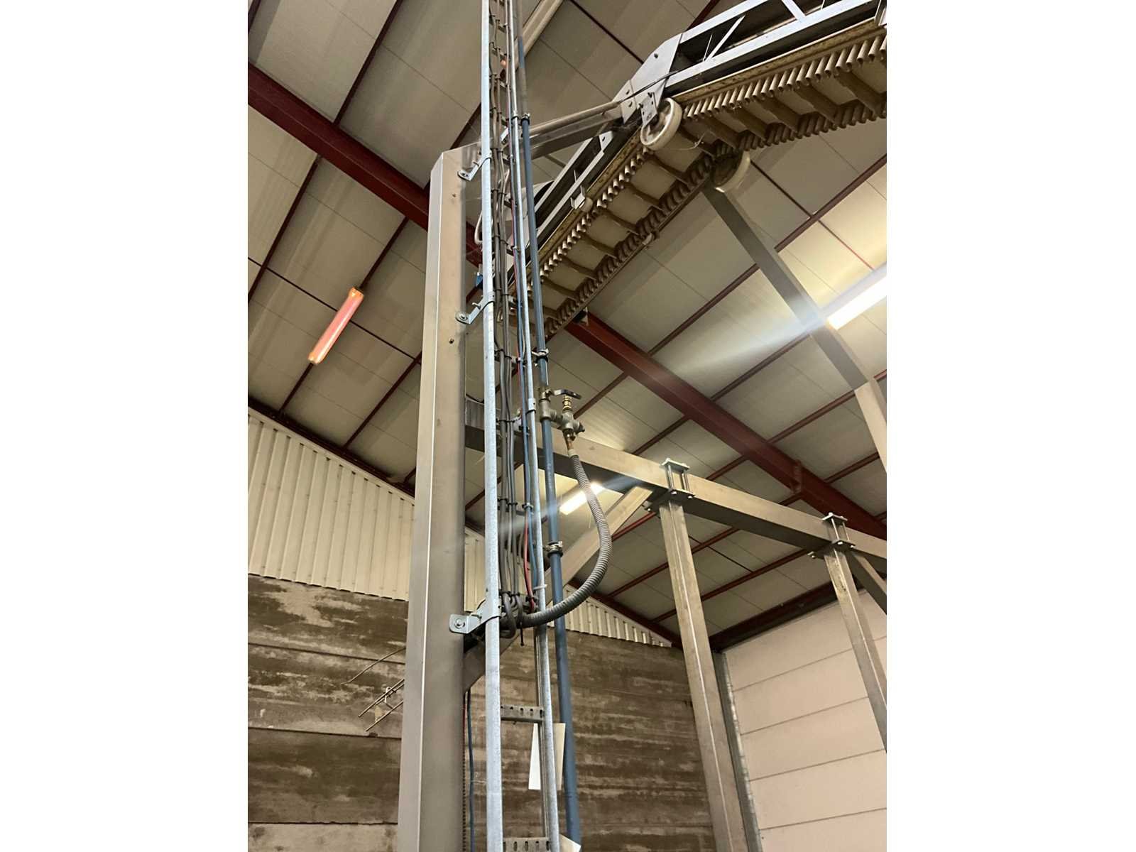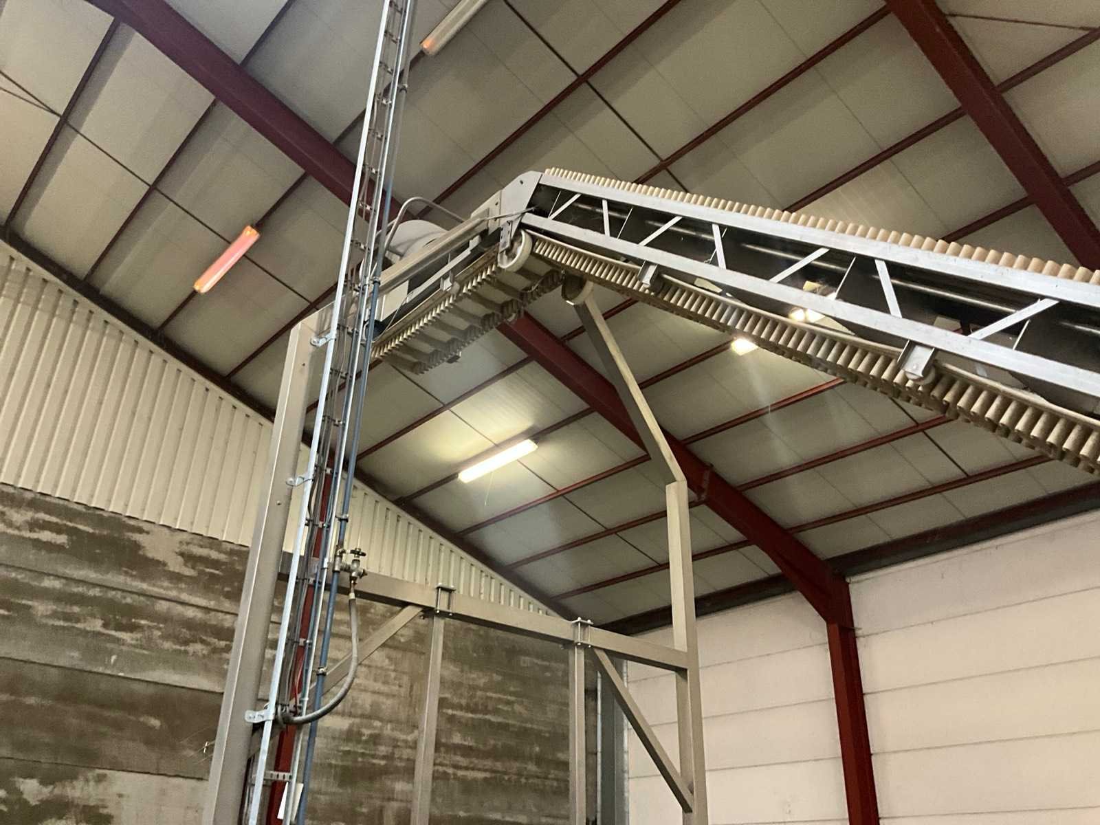 Kunststoffen Z-transportband waarvan met een breedte van 55 cm, circa 6 meter hoog en totaal 16 meter lang, band voorzien van diverse vakken elk van ongeveer 30 x 20 cm. Constructie voorzien van dubbel metalen frame met een maximale breedte van 3 meter en compleet met rvs vultrechterbak 132 x 112 cm en 260 cm hoog met aangebouwde ladder. Nee Merk: IC-S Band afm. l: 32000mm Band afm. b: 600mm Totale afmeting L: 16000mm Totale afmeting Breedte: 3000mm