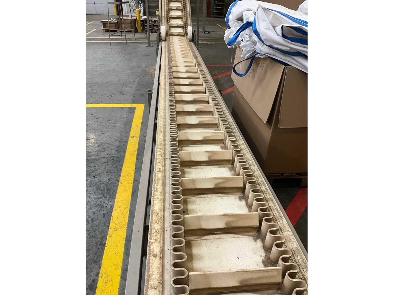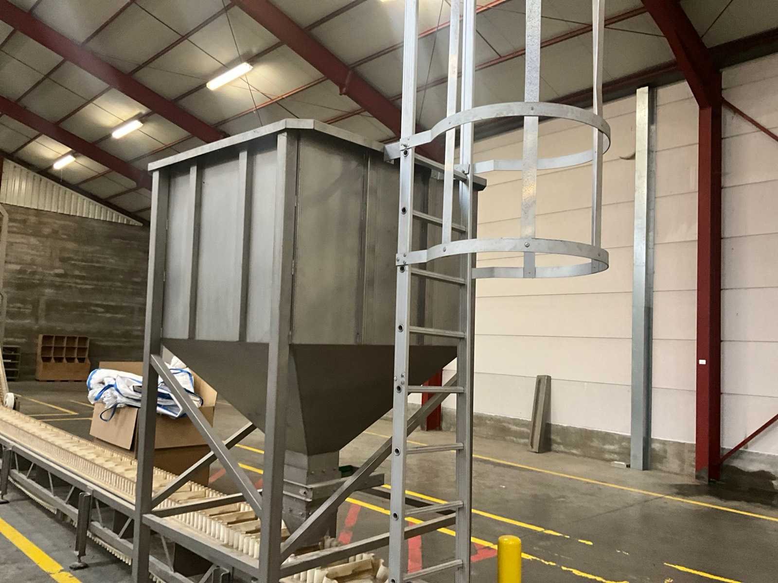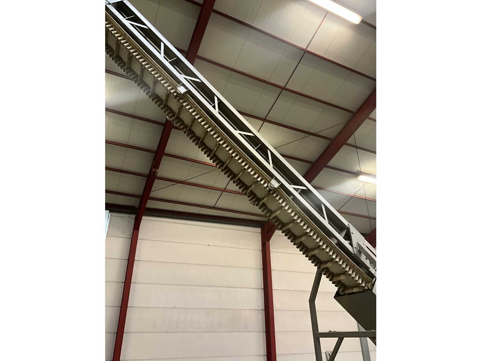 Kunststoffen Z-transportband waarvan met een breedte van 55 cm, circa 6 meter hoog en totaal 16 meter lang, band voorzien van diverse vakken elk van ongeveer 30 x 20 cm. Constructie voorzien van dubbel metalen frame met een maximale breedte van 3 meter en compleet met rvs vultrechterbak 132 x 112 cm en 260 cm hoog met aangebouwde ladder. Nee Merk: IC-S Band afm. l: 32000mm Band afm. b: 600mm Totale afmeting L: 16000mm Totale afmeting Breedte: 3000mm