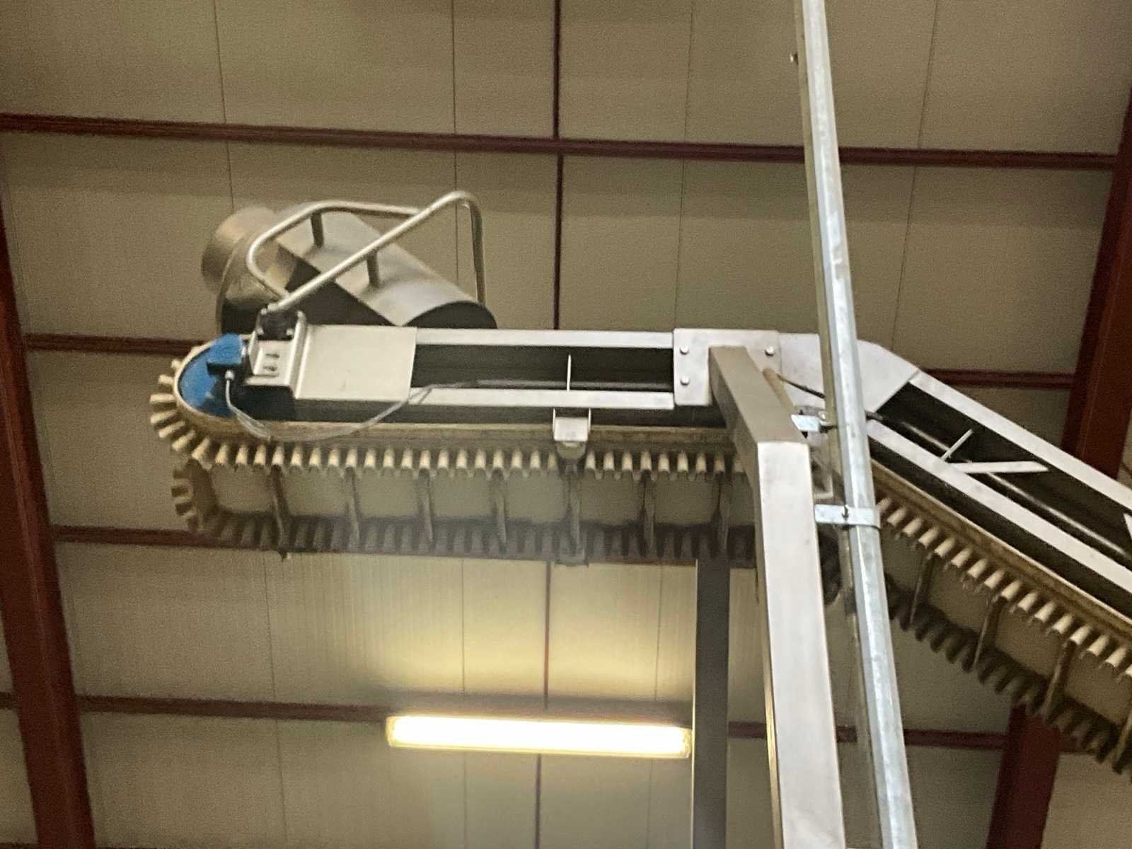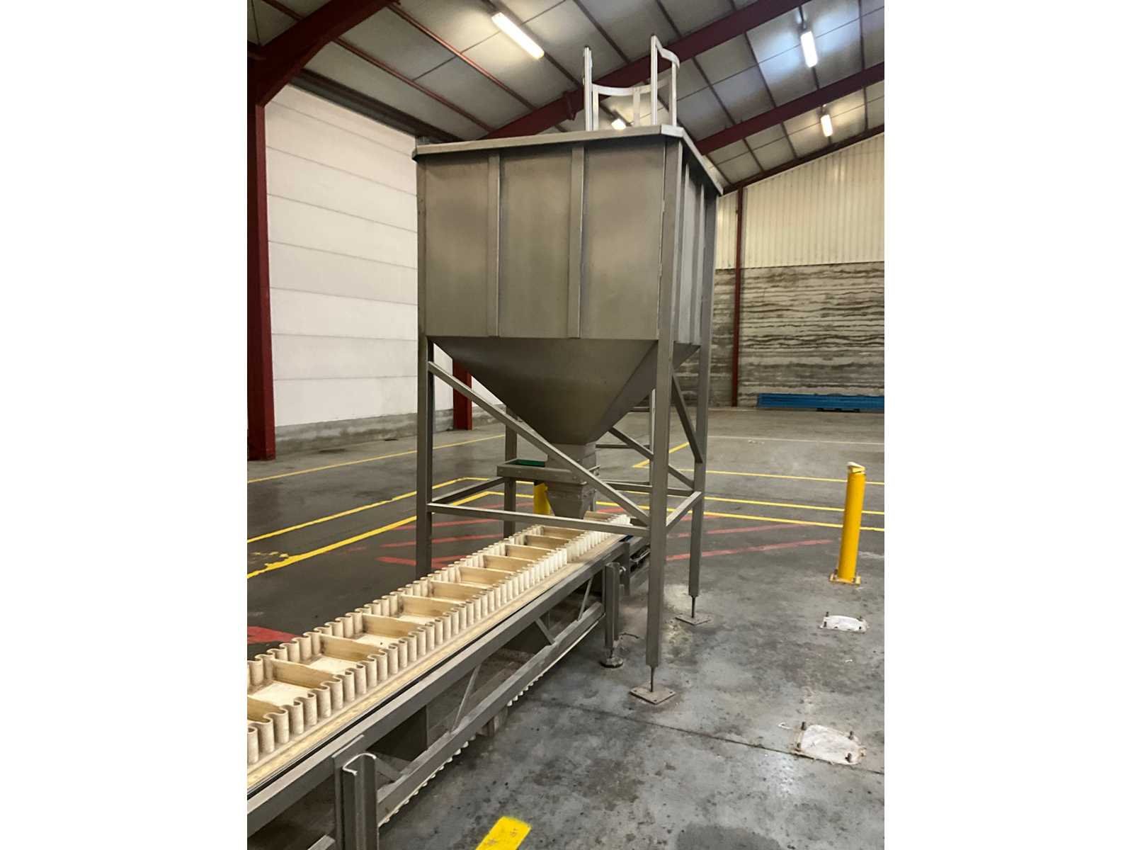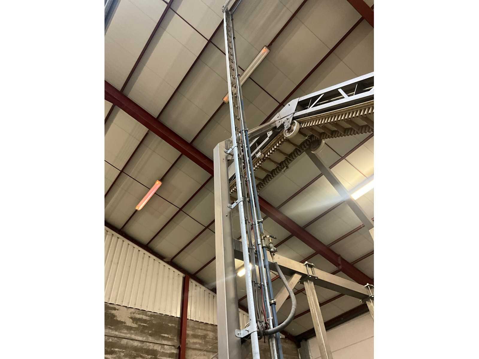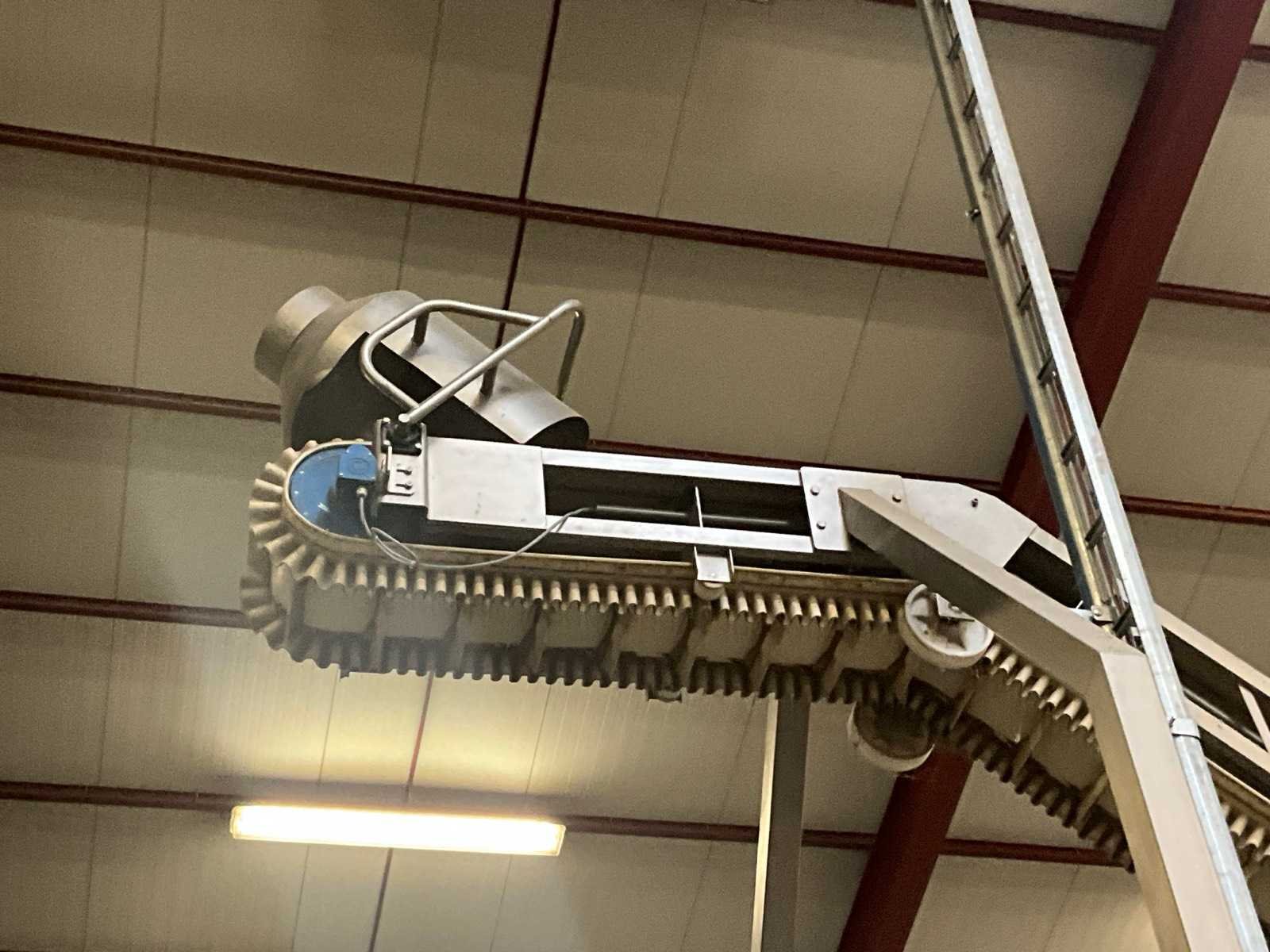 Kunststoffen Z-transportband waarvan met een breedte van 55 cm, circa 6 meter hoog en totaal 16 meter lang, band voorzien van diverse vakken elk van ongeveer 30 x 20 cm. Constructie voorzien van dubbel metalen frame met een maximale breedte van 3 meter en compleet met rvs vultrechterbak 132 x 112 cm en 260 cm hoog met aangebouwde ladder. Nee Merk: IC-S Band afm. l: 32000mm Band afm. b: 600mm Totale afmeting L: 16000mm Totale afmeting Breedte: 3000mm