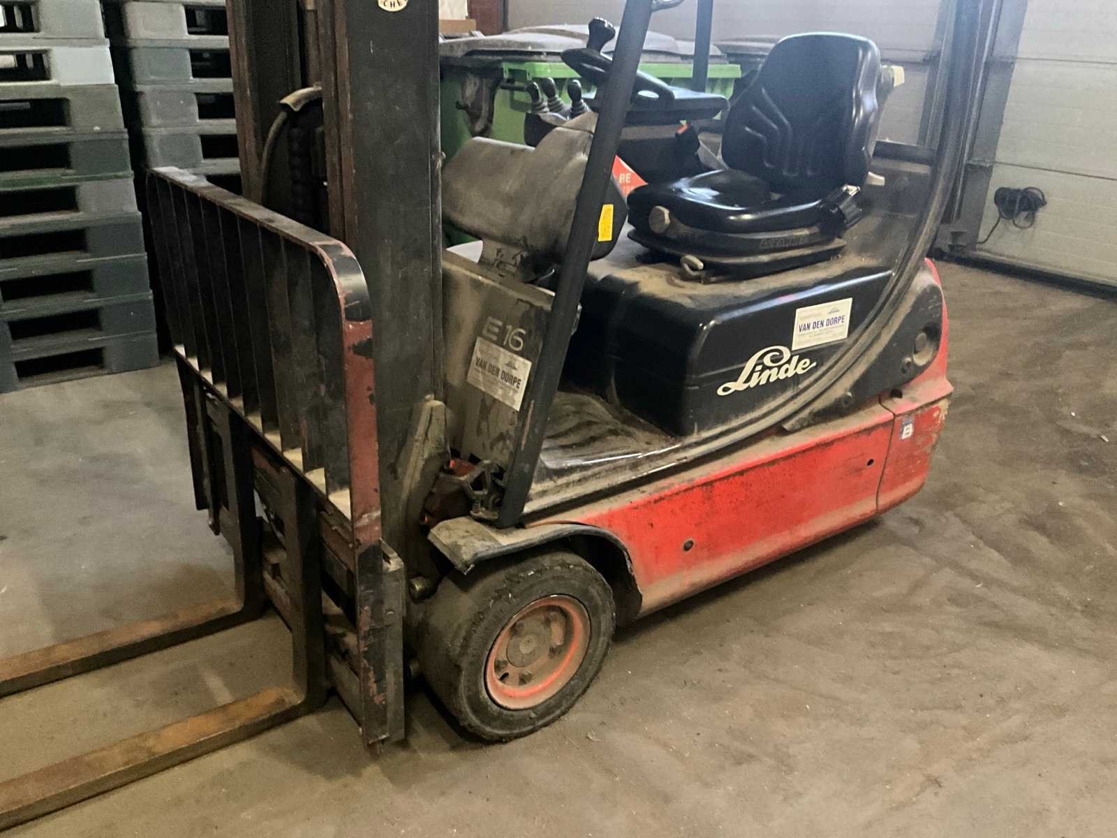 Compleet met lader A.T.I.B. Elettronica Nee Merk: Linde Type: E16C-02 Bouwjaar: 2002 Serienummer: H2X335N00521 Aantal wielen: 4 Afgelezen urenstand: 8361 Accu lader: true Eigen gewicht: 2300kg Hefvermogen: 1600kg Lepellengte: 1100mm Max. hefhoogte: 3070mm Vol rubber banden: true Minimale doorrijhoogte: 2200mm Totale afmeting L: 3000mm Totale afmeting Breedte: 1000mm Totale afmeting Hoogte: 2180mm