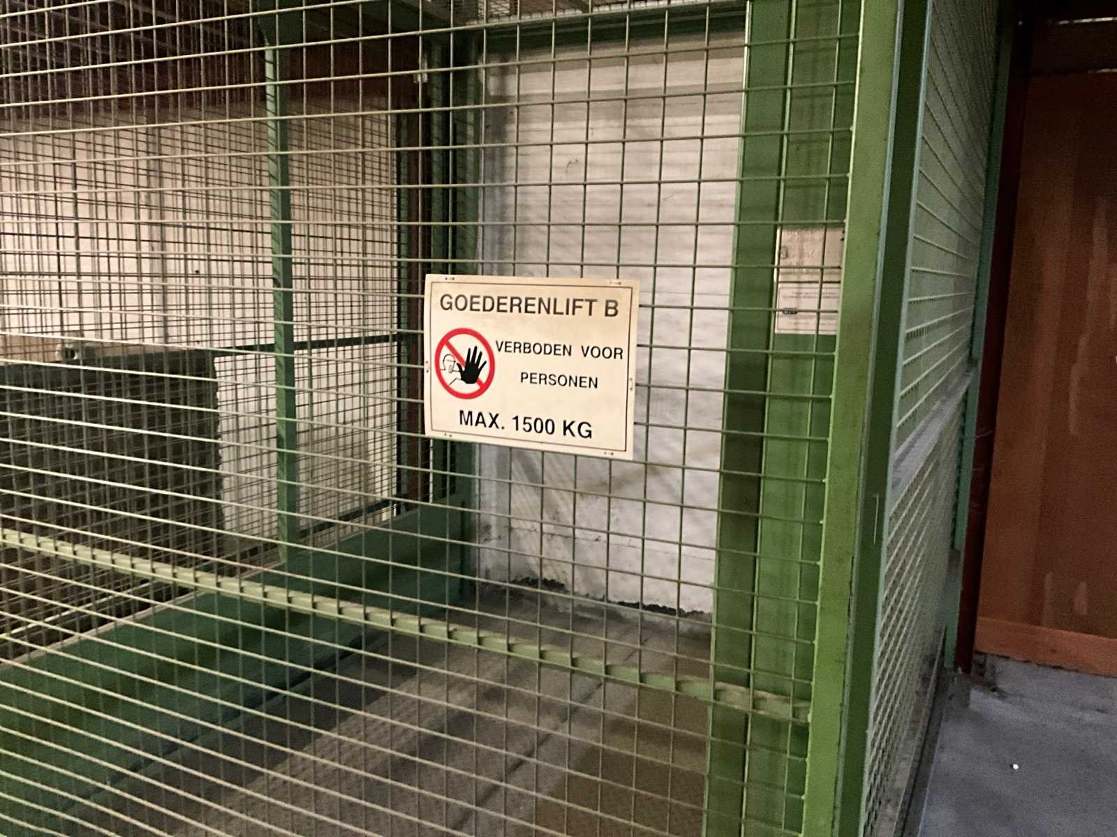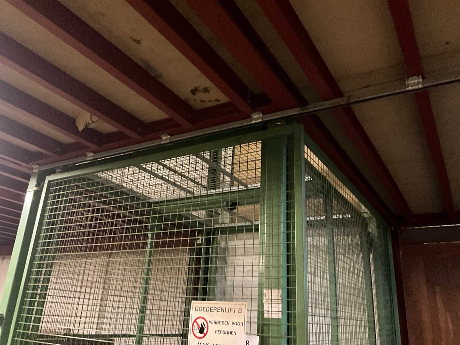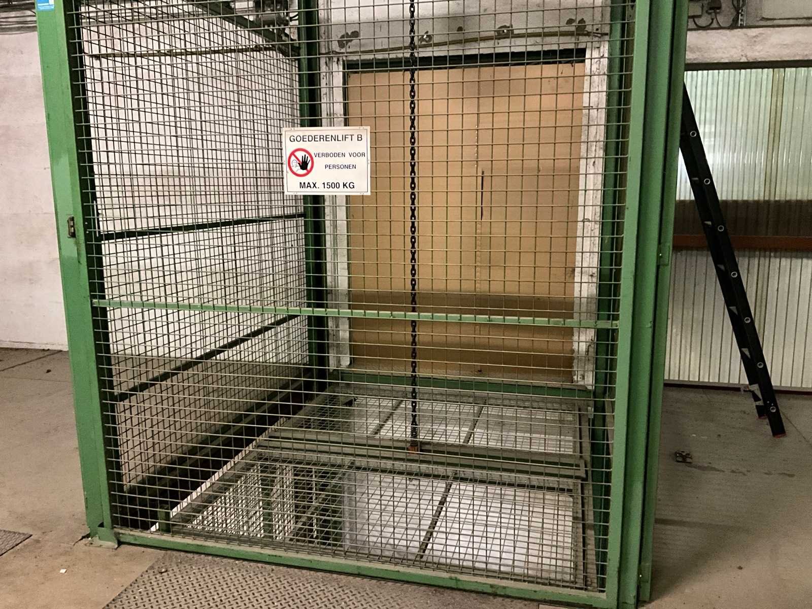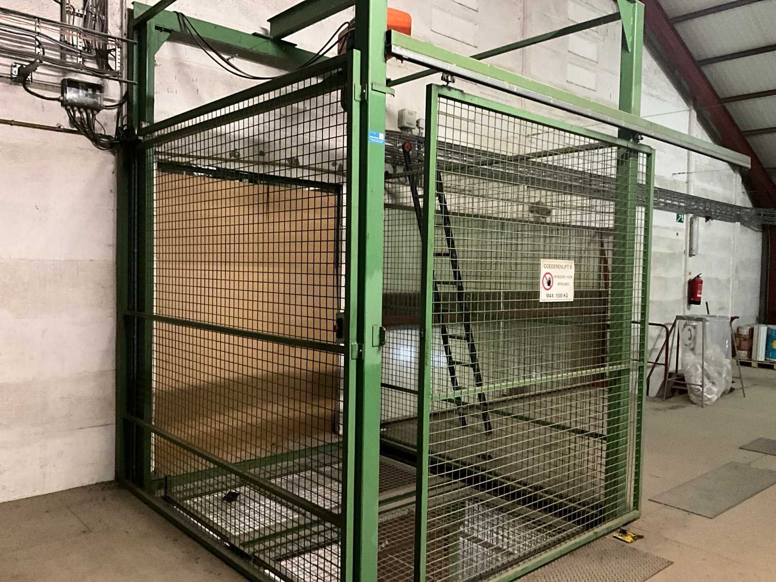 Voorzien van schuifdeur onderaan en bovenaan, lift in metalen traliewerk, voorzien van platform, en bovenaan met kettingtakel Hitachi 2 ton voorzien van haak. Achterwand is open, staat tegen muur. Nee Max. platformhoogte: 2.5m Max. belasting: 1500kg Plateau afm. l: 2500mm Plateau afm. b: 1900mm Totale afmeting L: 2800mm Totale afmeting Breedte: 2500mm Totale afmeting Hoogte: 6300mm