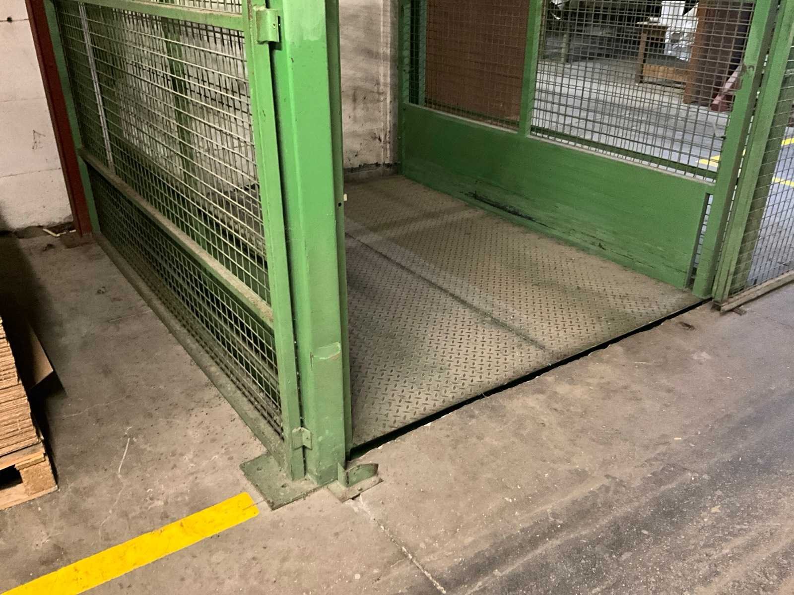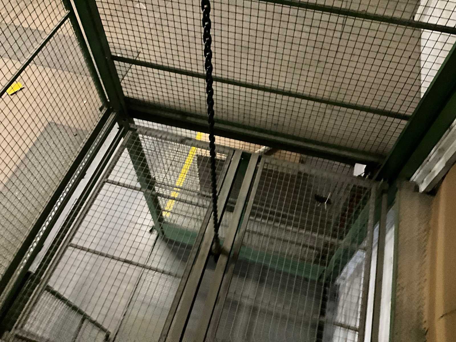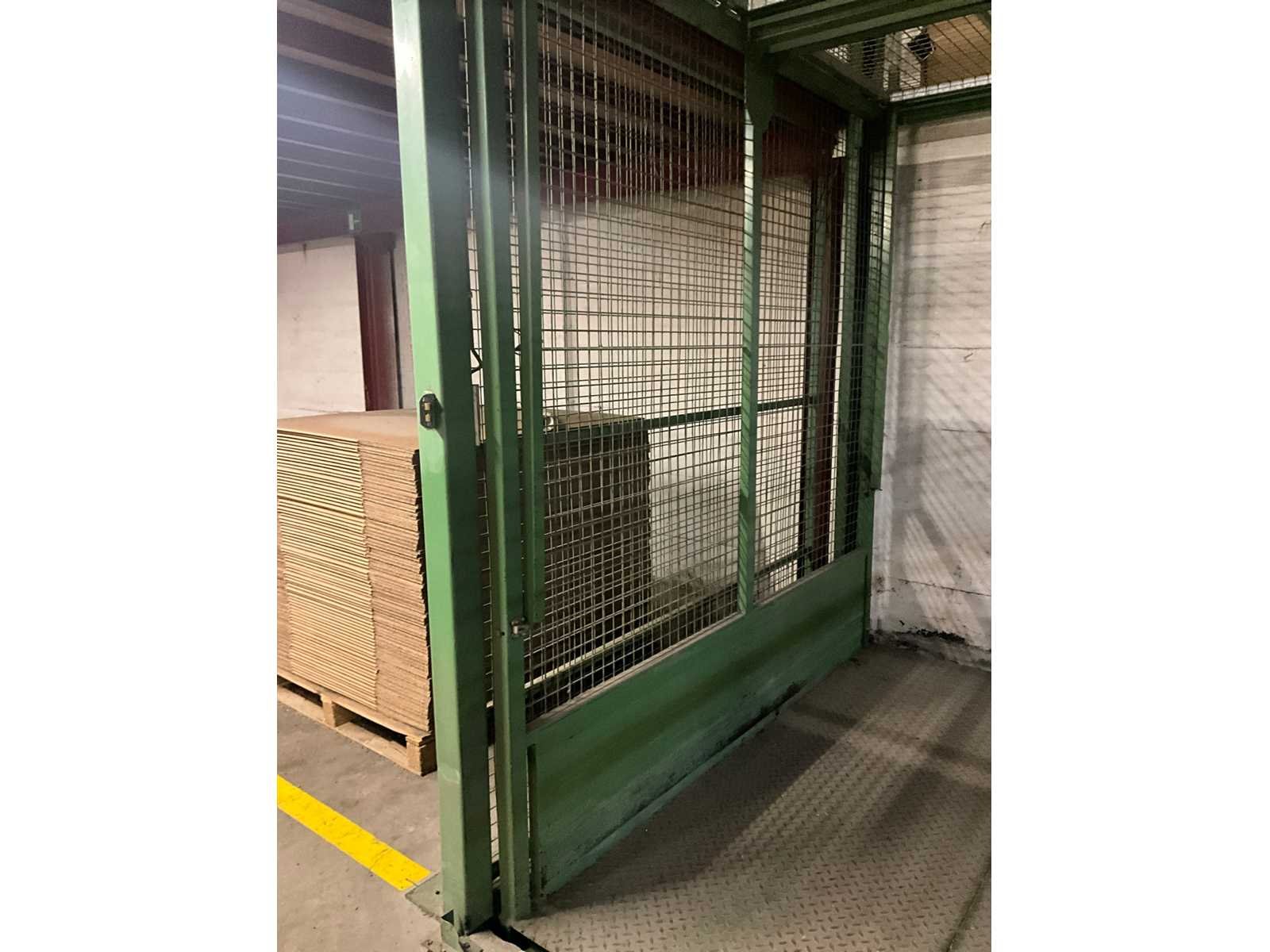 Voorzien van schuifdeur onderaan en bovenaan, lift in metalen traliewerk, voorzien van platform, en bovenaan met kettingtakel Hitachi 2 ton voorzien van haak. Achterwand is open, staat tegen muur. Nee Max. platformhoogte: 2.5m Max. belasting: 1500kg Plateau afm. l: 2500mm Plateau afm. b: 1900mm Totale afmeting L: 2800mm Totale afmeting Breedte: 2500mm Totale afmeting Hoogte: 6300mm