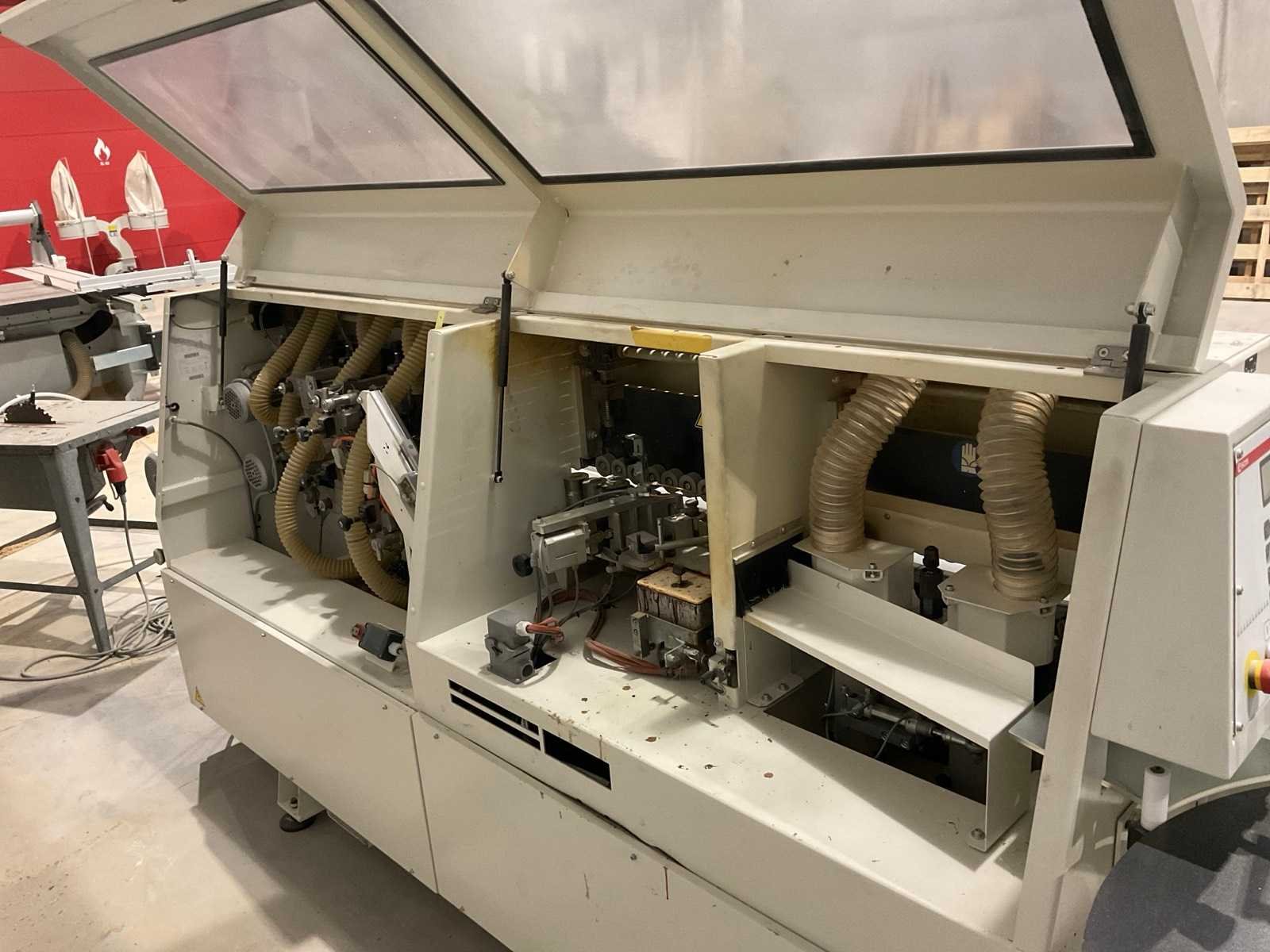 Kenmerk Specificatie Paneeldikte 8 - 60 mm Dikte van kantenband (rollen) 0,4 - 3 mm (tot 6 mm mogelijk met optionele kit/instellingen) Dikte van kantenband (strips) Tot 6 mm Minimale paneellengte 140 mm (bij een breedte van 100 mm) Minimale paneelbreedte 90 mm (bij een lengte van 210 mm) Doorvoersnelheid 11 m/min Perslucht 6 bar Lijmsysteem Lijmpot voor EVA (hot-melt), gecoat met teflon Nee Merk: SCM Type: OLIMPIC K360 Bouwjaar: 2015 Serienummer: AB/224226 Gewicht: 912kg Aansluiting: 400V Afmeting l: 3800mm Afmeting b: 1500mm Afmeting h: 1500mm