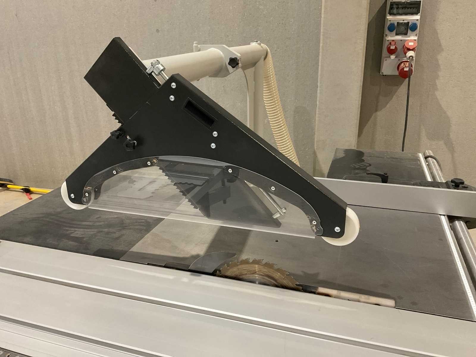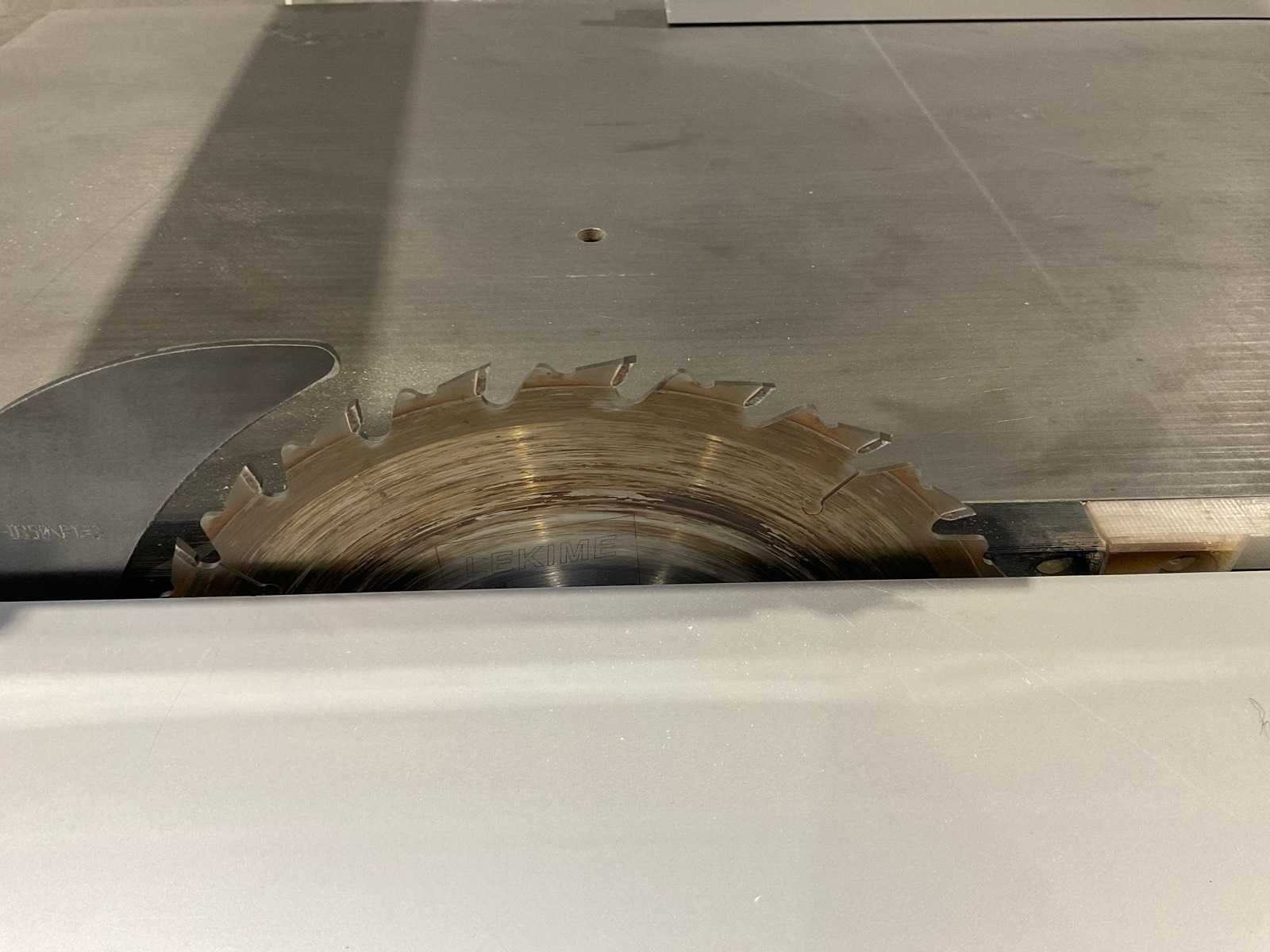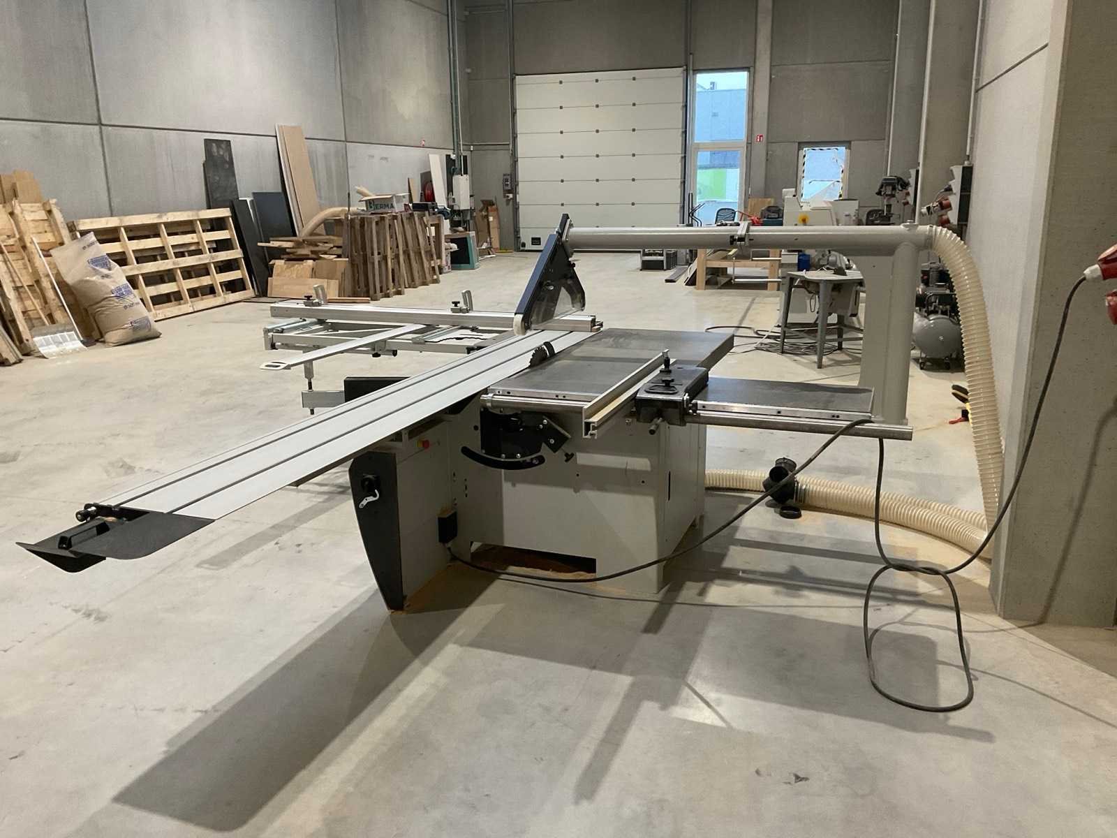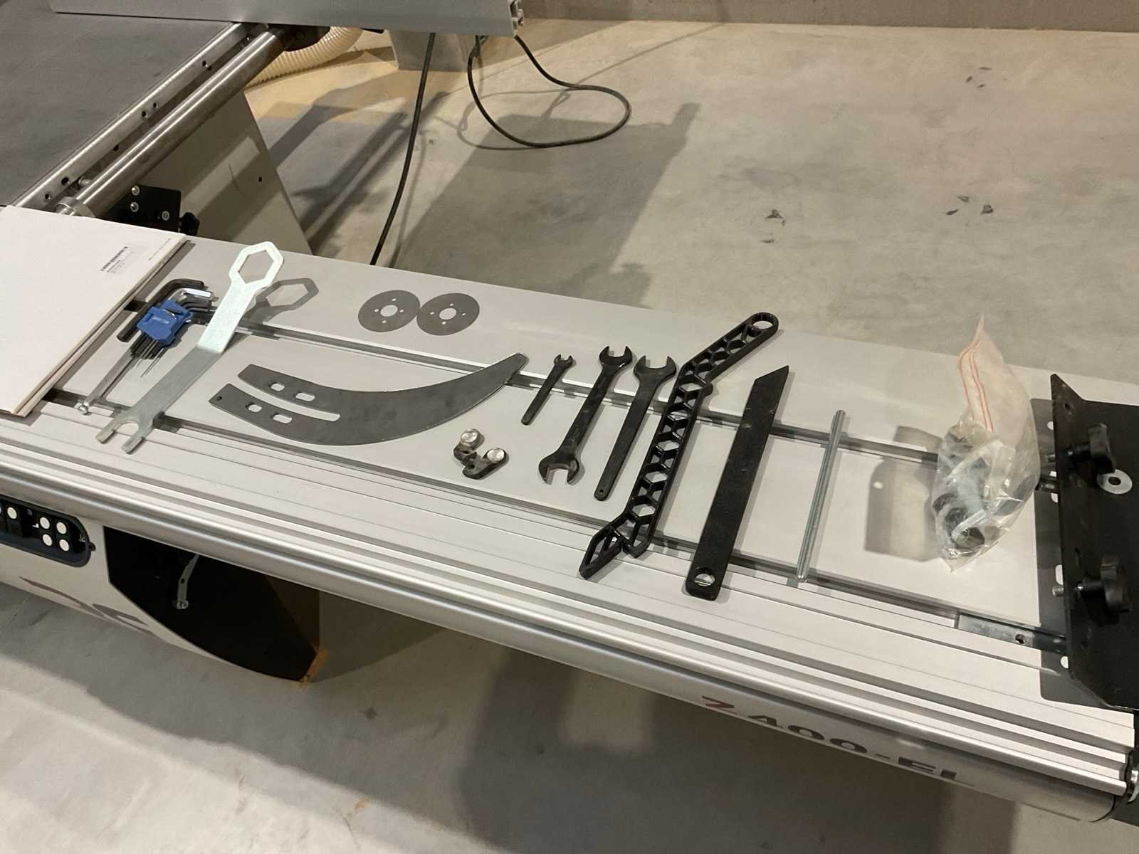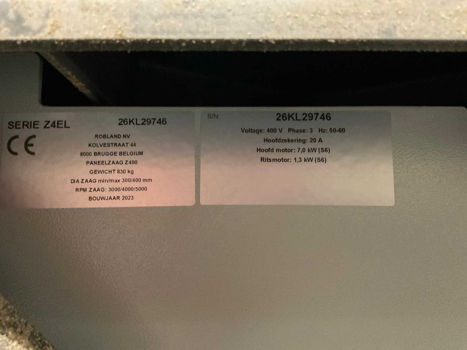 Gewicht 850 kg (Z400 – 3200) – 1080 kg (Z400 X3- 3800) Voltage (3 fase) 400 V (optie 230 V) Motorvermogen (3 fase) 7 kW / 9,5 pk (S6), optie 9,2 kW / 14 pk (S6) Diameter stofafzuiging 120 mm in frame + 100 mm in overhangende zaagkap Hoofdzaagblad Rotatiesnelheid hoofdzaagblad 3000 / 4000 / 5000 TPM Diameter zaagblad en asgat 300 – 400 x 30 mm Schuinstelling zaagblad 90° – 45° Zaaghoogte aan 90° / 45° 125 mm / 90 mm Zaagbreedte versie Z400 M, Z400 EL 1350 mm (optie 1000 / 1525 mm) Zaagbreedte versie Z400 X1, Z400 X3 1250 mm (optie 1500 mm) Zaaglengte 3500 mm (optie 2500 / 4100 mm) Afmetingen zaagtafel 985 mm x 710 mm Afmetingen loopwagen 3200 mm (optie 2200 / 3800 mm) x 420 mm Afmetingen afkorttafel 1440 mm x 540 mm Lengte van de aanslagbalk 2295 mm (telescopisch tot 3000 mm) Voorritser Diameter voorrits zaagblad en asgat 120 mm, 20 mm Zaaghoogte met 120 mm diameter zaagblad 3,5 mm Rotatiesnelheid voorritser 8200 TPM Motorvermogen voorritser 1,3 kW / 2 pk (S6) Nee Merk: Robland Type: Z400-EL Bouwjaar: 2023 Serienummer: 26KL29746 Zaagblad Ø: 400mm Tafel afmeting l: 985mm Tafel afmeting b: 710mm Aansluiting: 400V