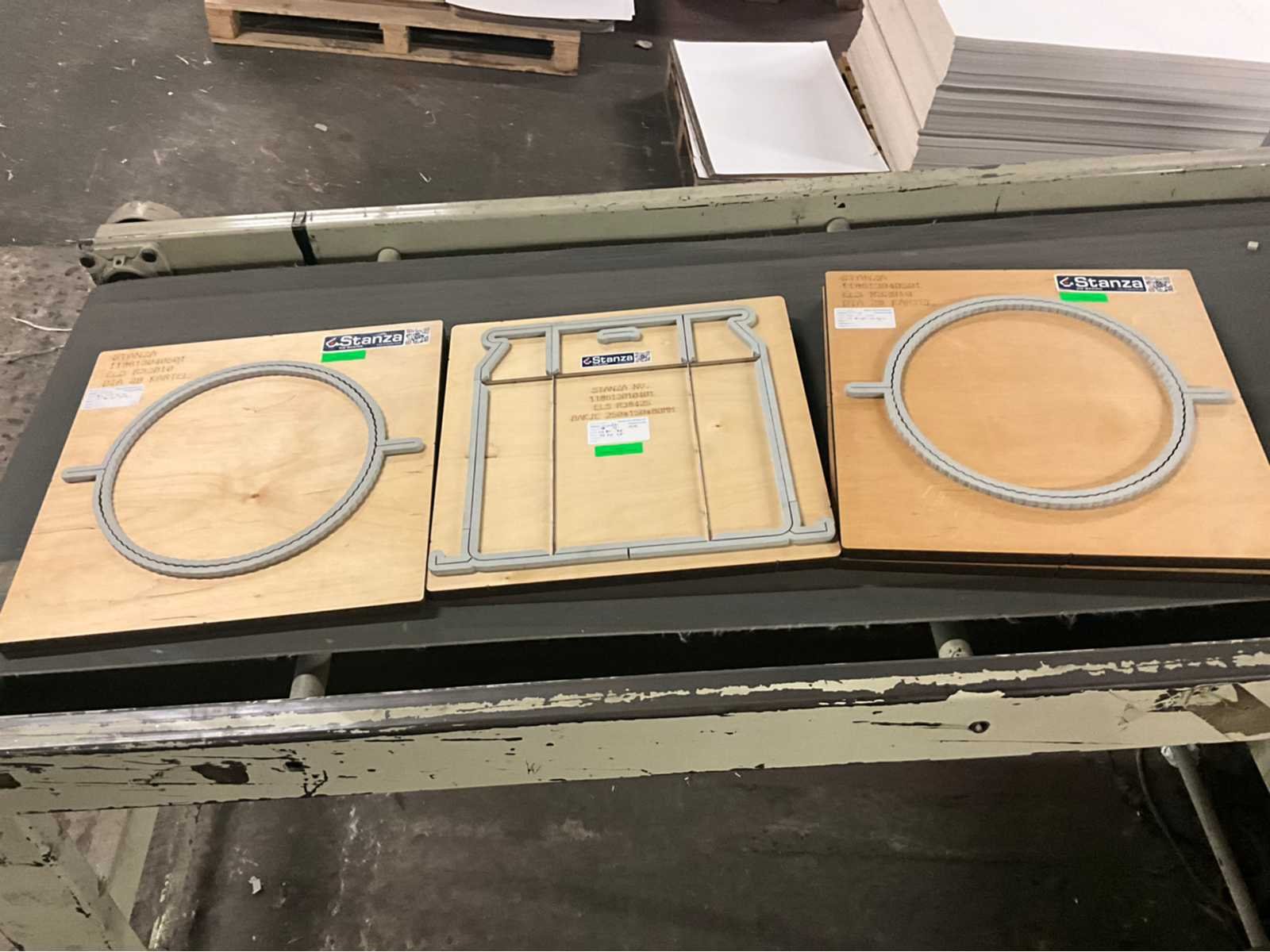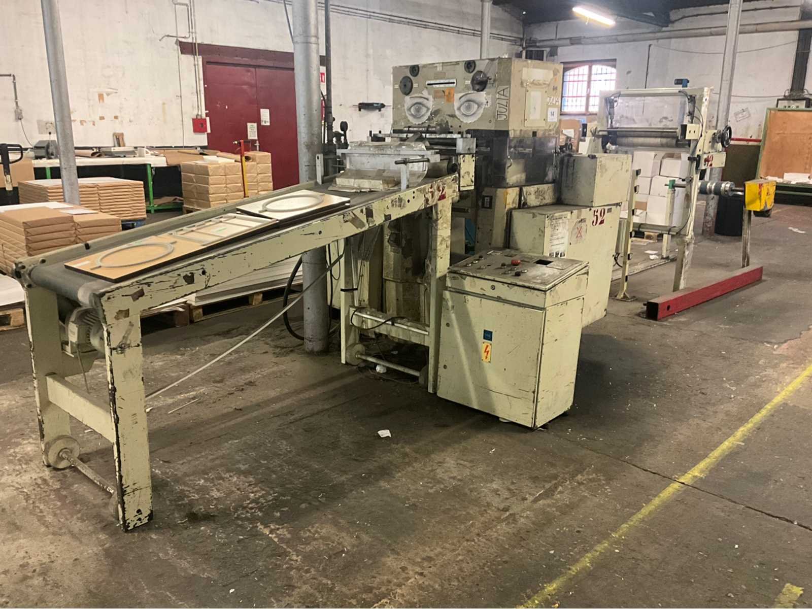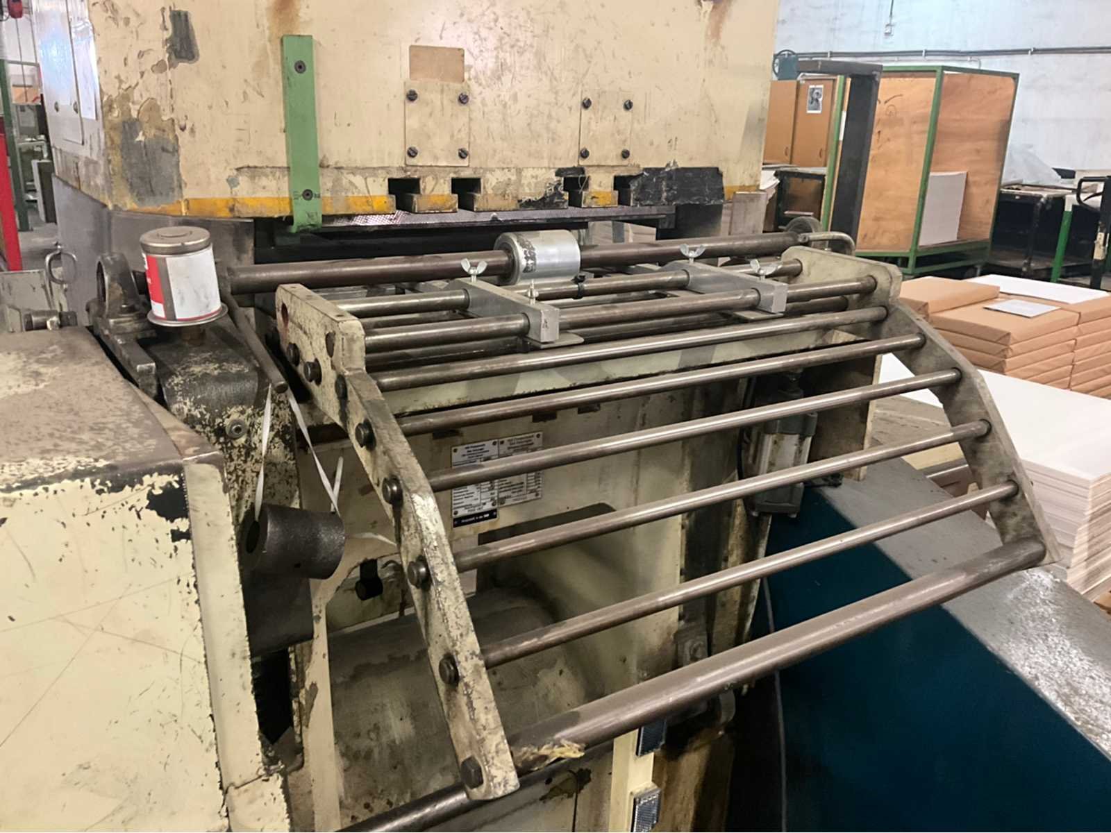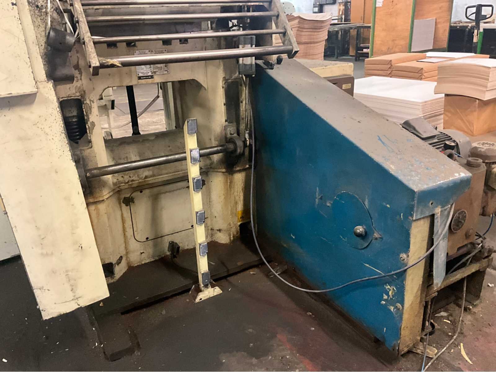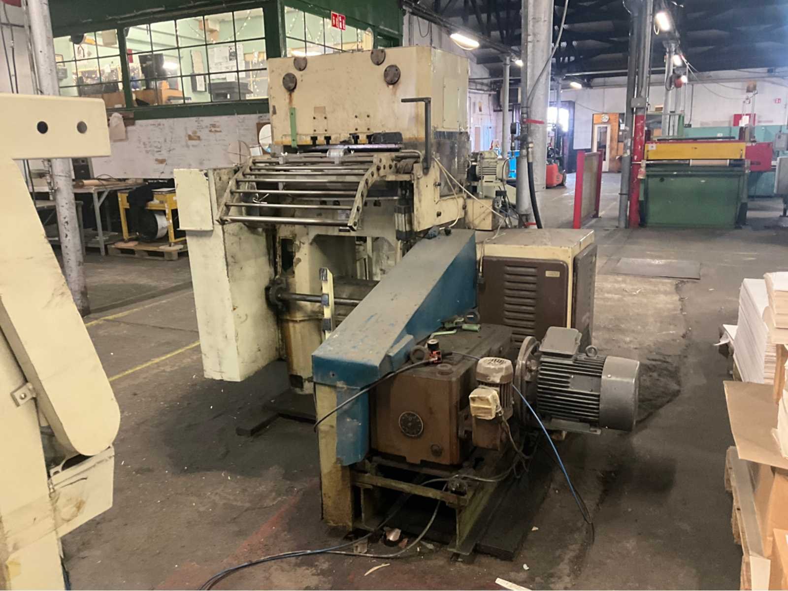Stansmachine voor rollen karton naar vorm. Alle bijhorende vormen inclusief No Merk: VEB Type: PASU 40/2 Totale afmeting L: 4000mm Totale afmeting Breedte: 2200mm