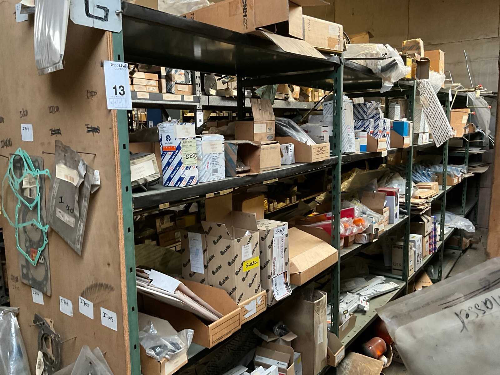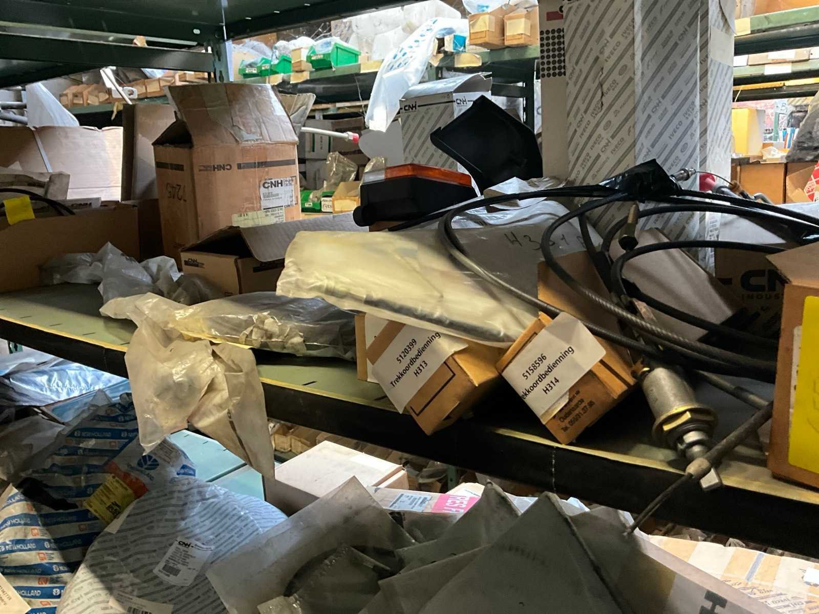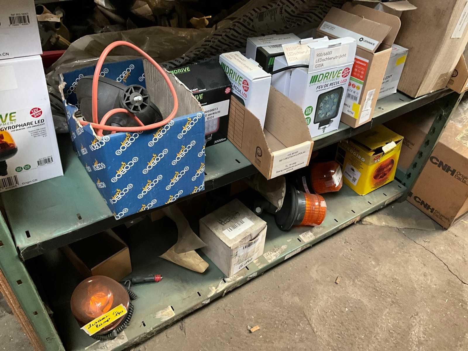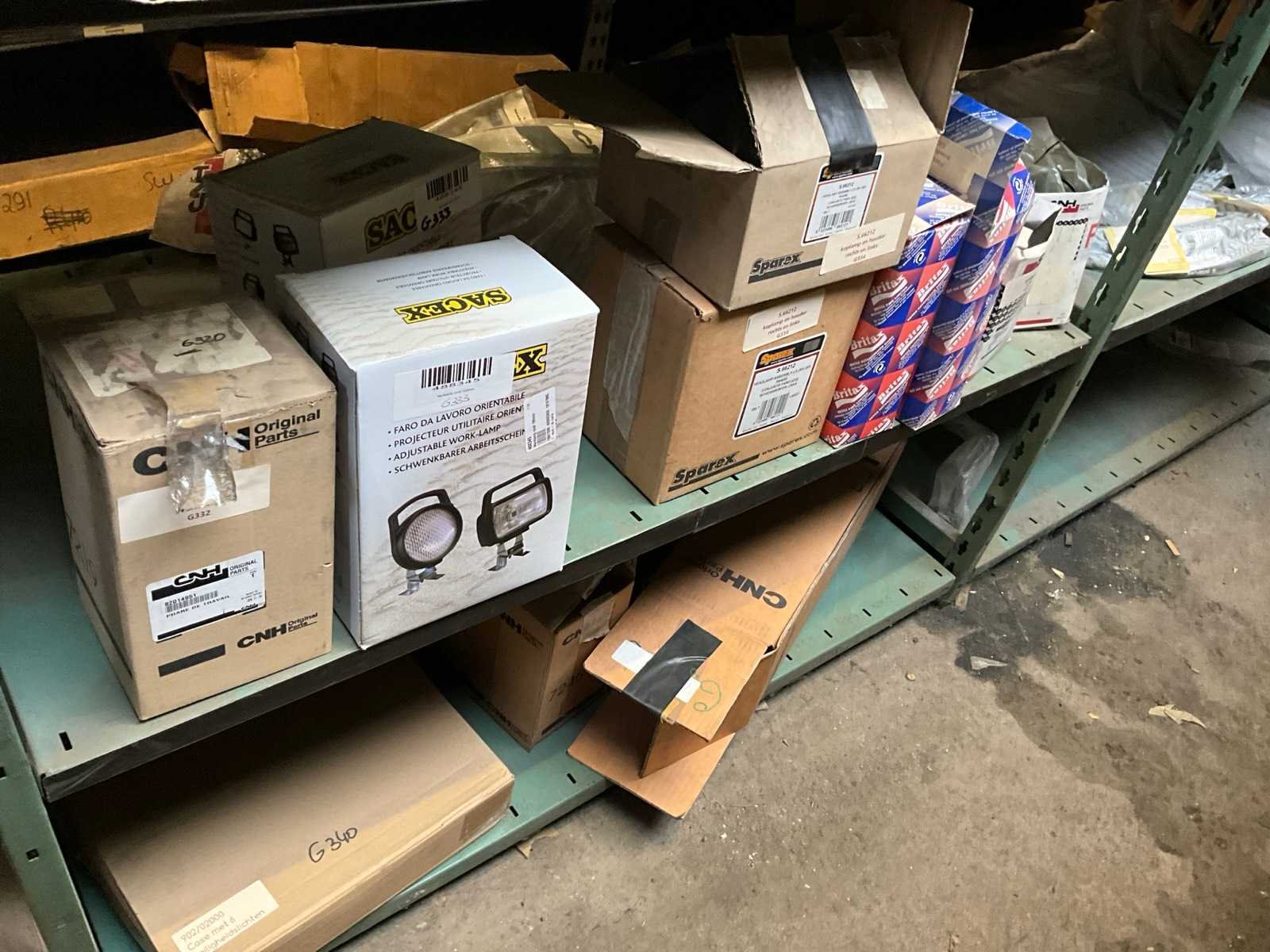 Bestaand uit inhoud 3x rek (12x sectie) waaronder originele verlichting-zwaailichten en spiegels (glas), werklichten, ruitenwisser bladen, gasveren, doorsteekkabels, vaste leidingen, enz.., ALLES BOVENOP REK NIET INCLUSIEF!!! Nee Merk: New Holland
