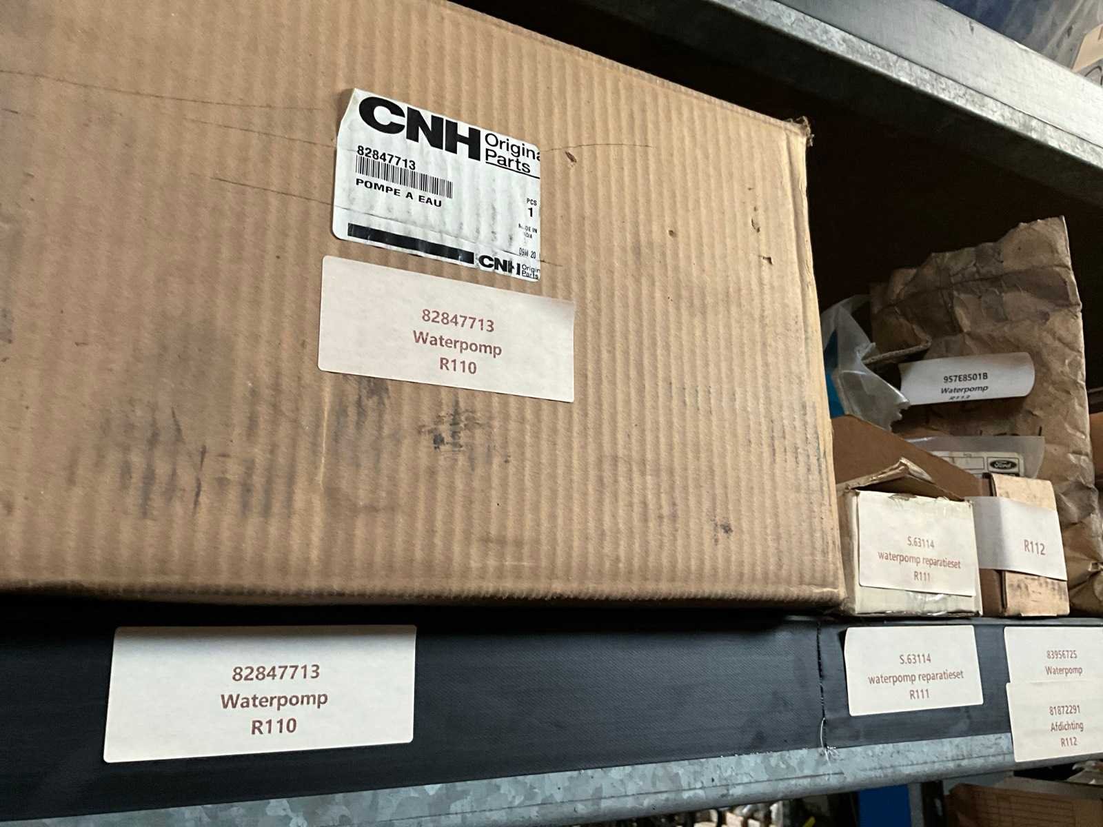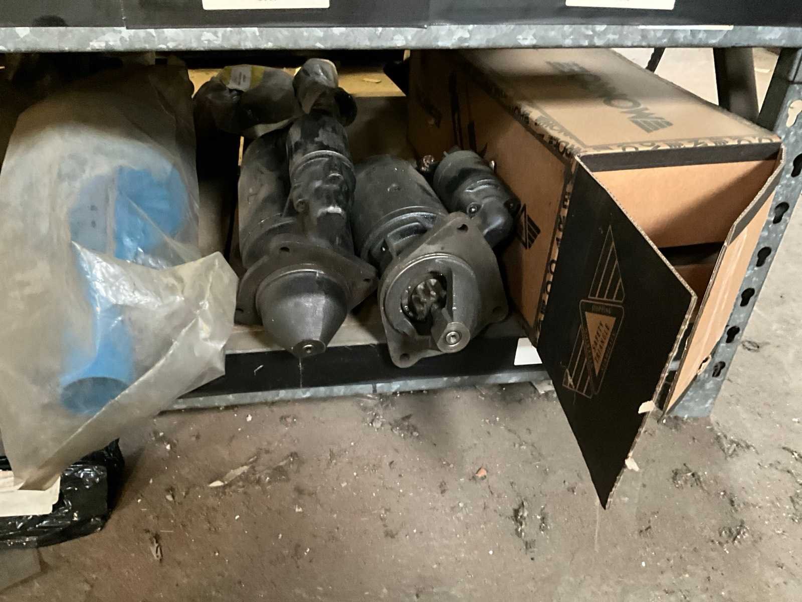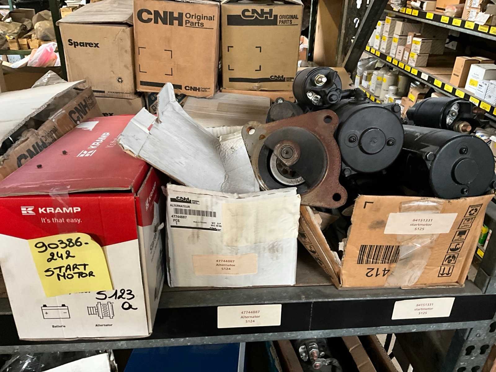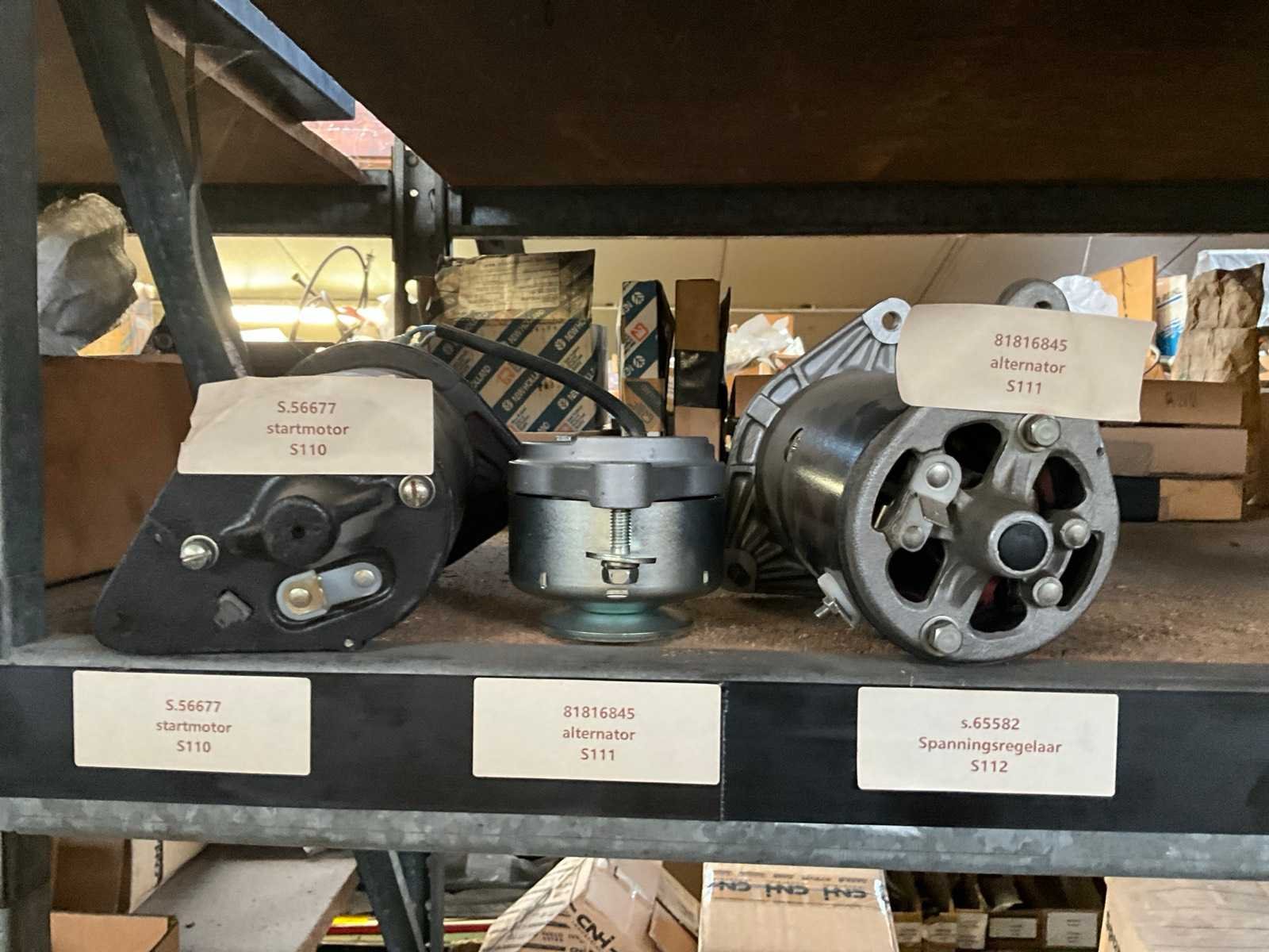 Bestaand uit inhoud rek 6x sectie waaronder startmotoren-dynamo’s-alternatoren-waterpompen met toebehoren zoals pakkingen-koppelstukken-v-snaar span en loopwielen, +v-snaren op kop van rek enz.. Nee Merk: New Holland