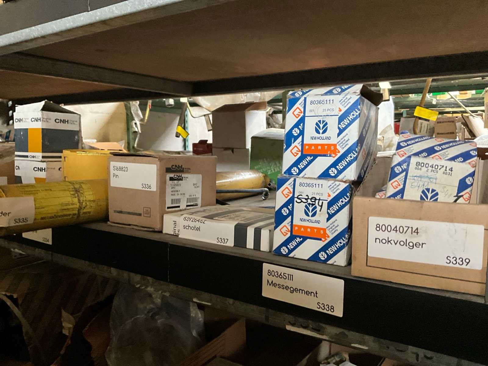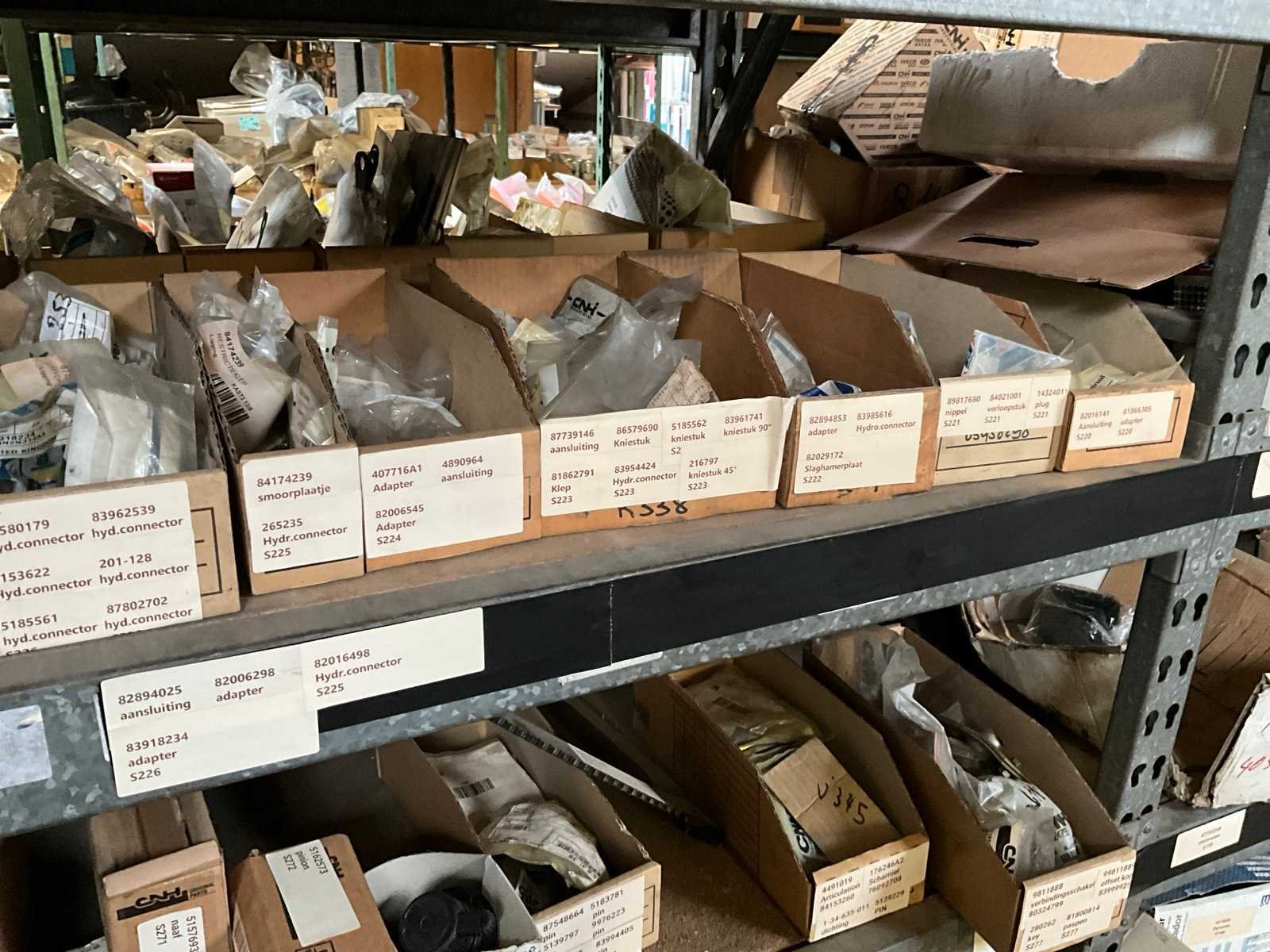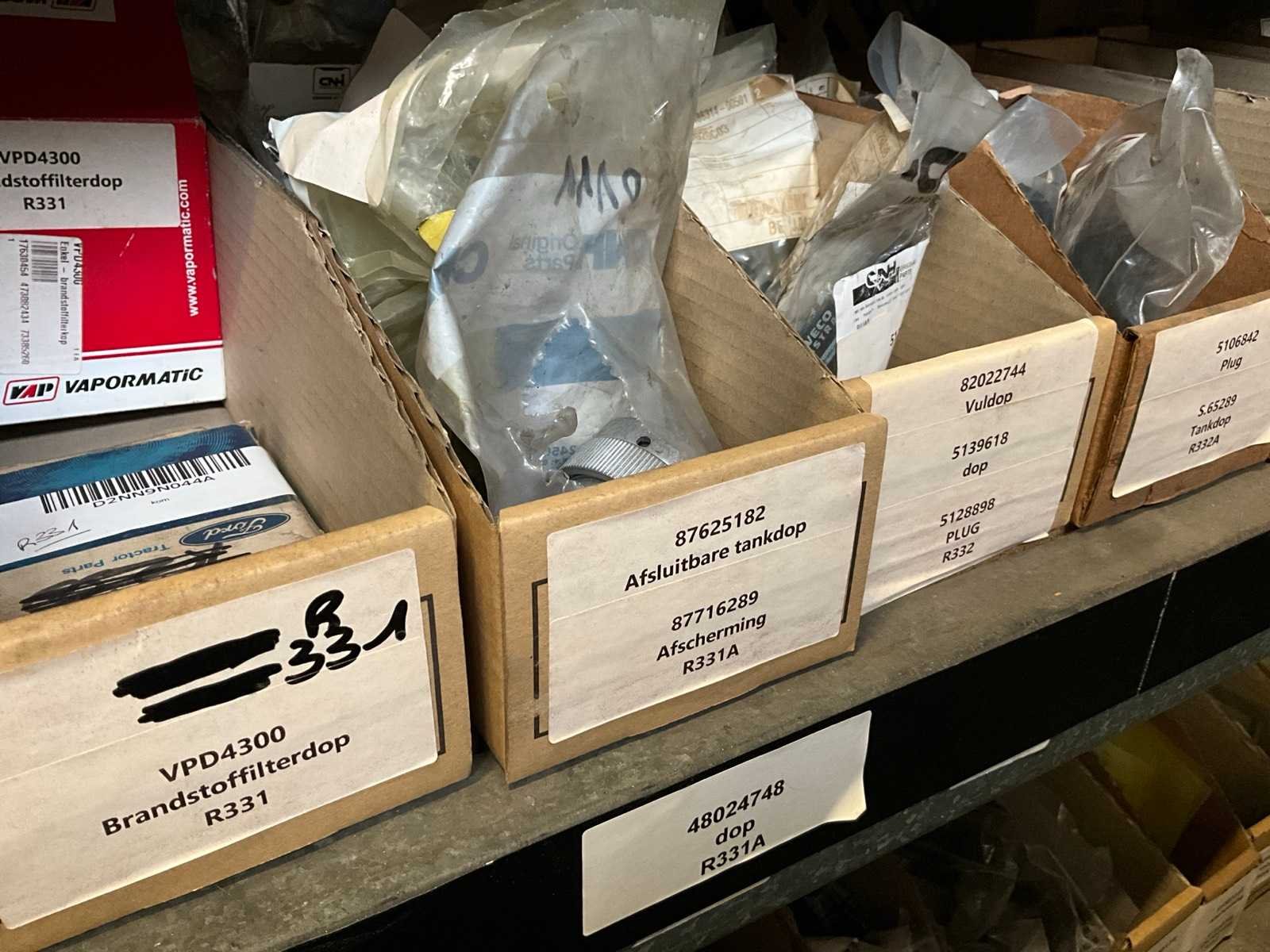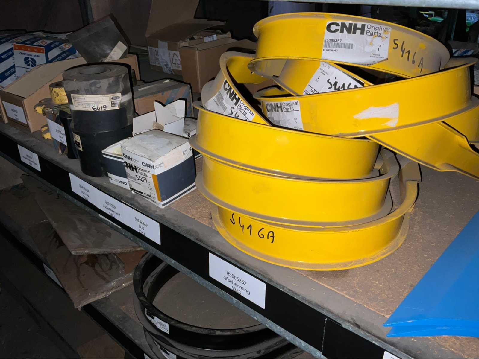 Bestaand uit inhoud 2-delig rek met 15 secties waaronder onderdelen voor brandstof en watercircuit, opvoerpompen, tankdoppen, flenzen, pakkingen, circa 5 radiatoren, naafdoppen, stofkappen, injectiomp, onderdelen voor pakkenpers, hydraulische cilinder enz.. Nee Merk: New Holland