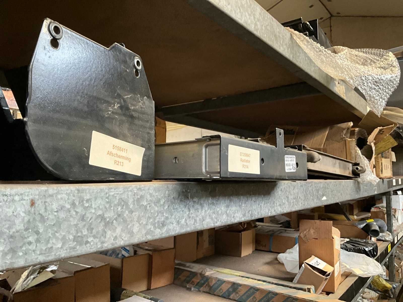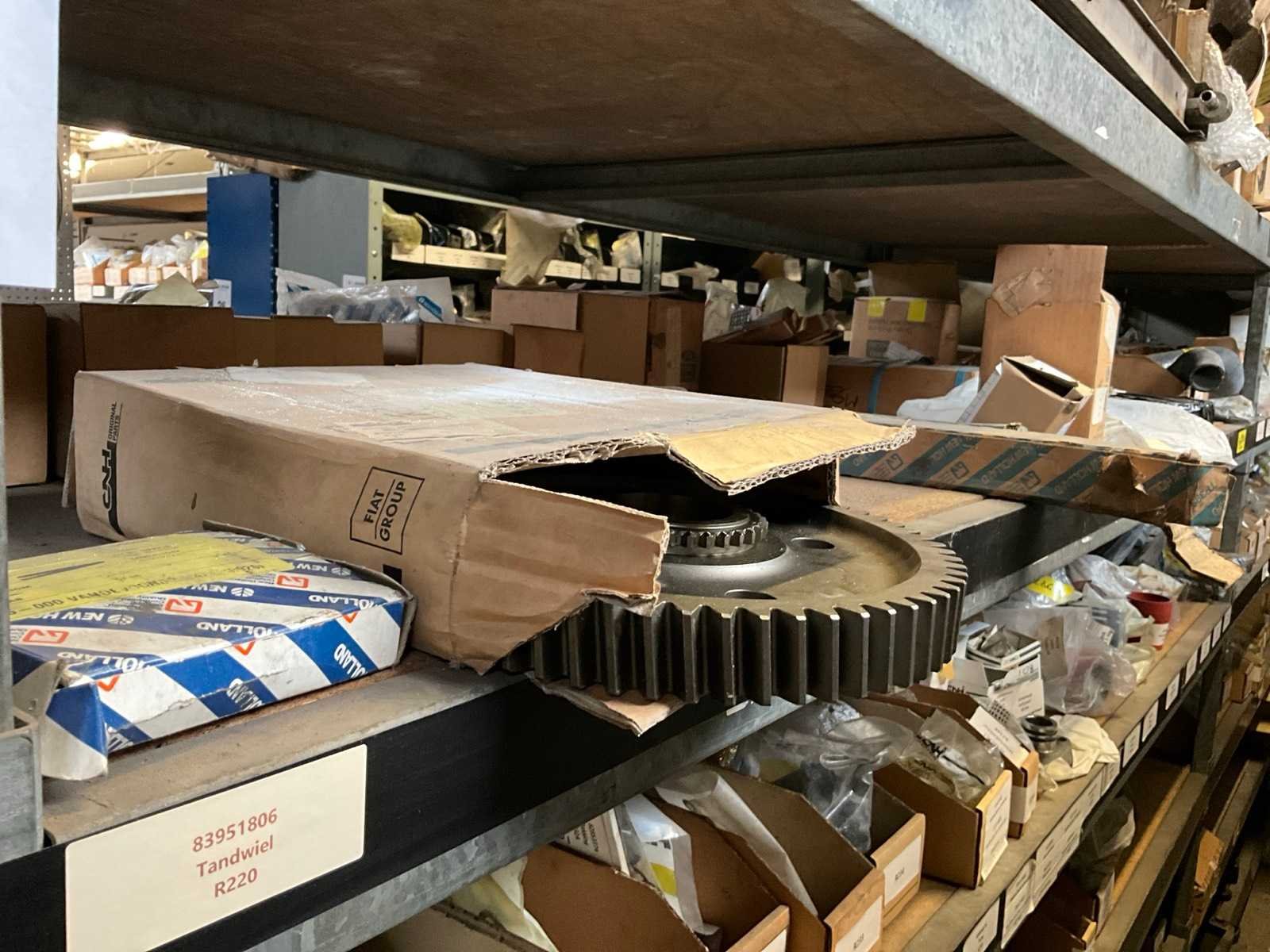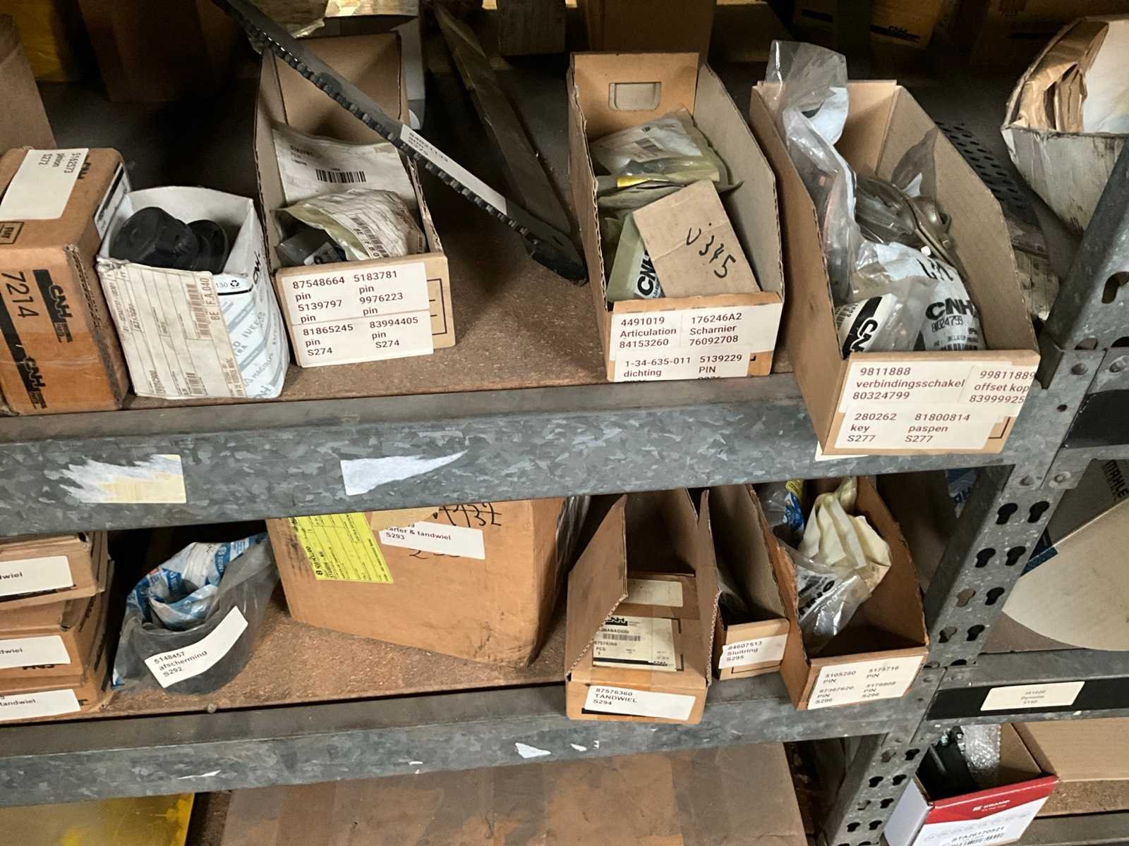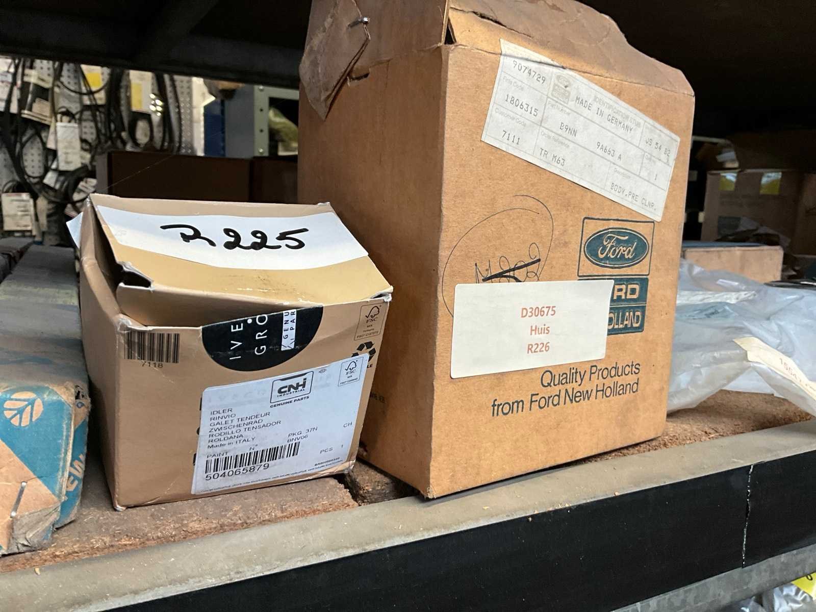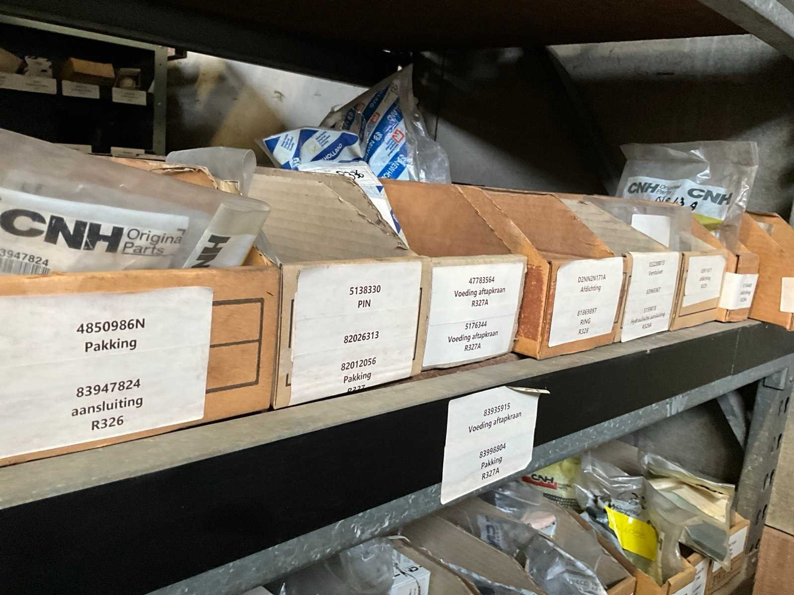 Bestaand uit inhoud 2-delig rek met 15 secties waaronder onderdelen voor brandstof en watercircuit, opvoerpompen, tankdoppen, flenzen, pakkingen, circa 5 radiatoren, naafdoppen, stofkappen, injectiomp, onderdelen voor pakkenpers, hydraulische cilinder enz.. Nee Merk: New Holland