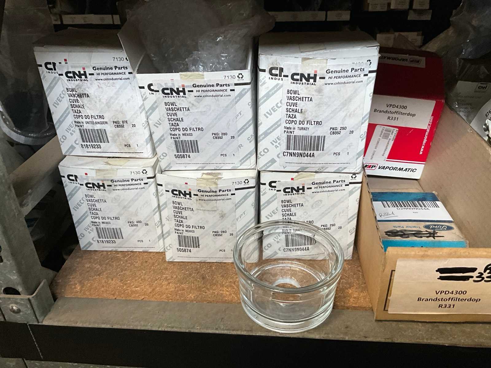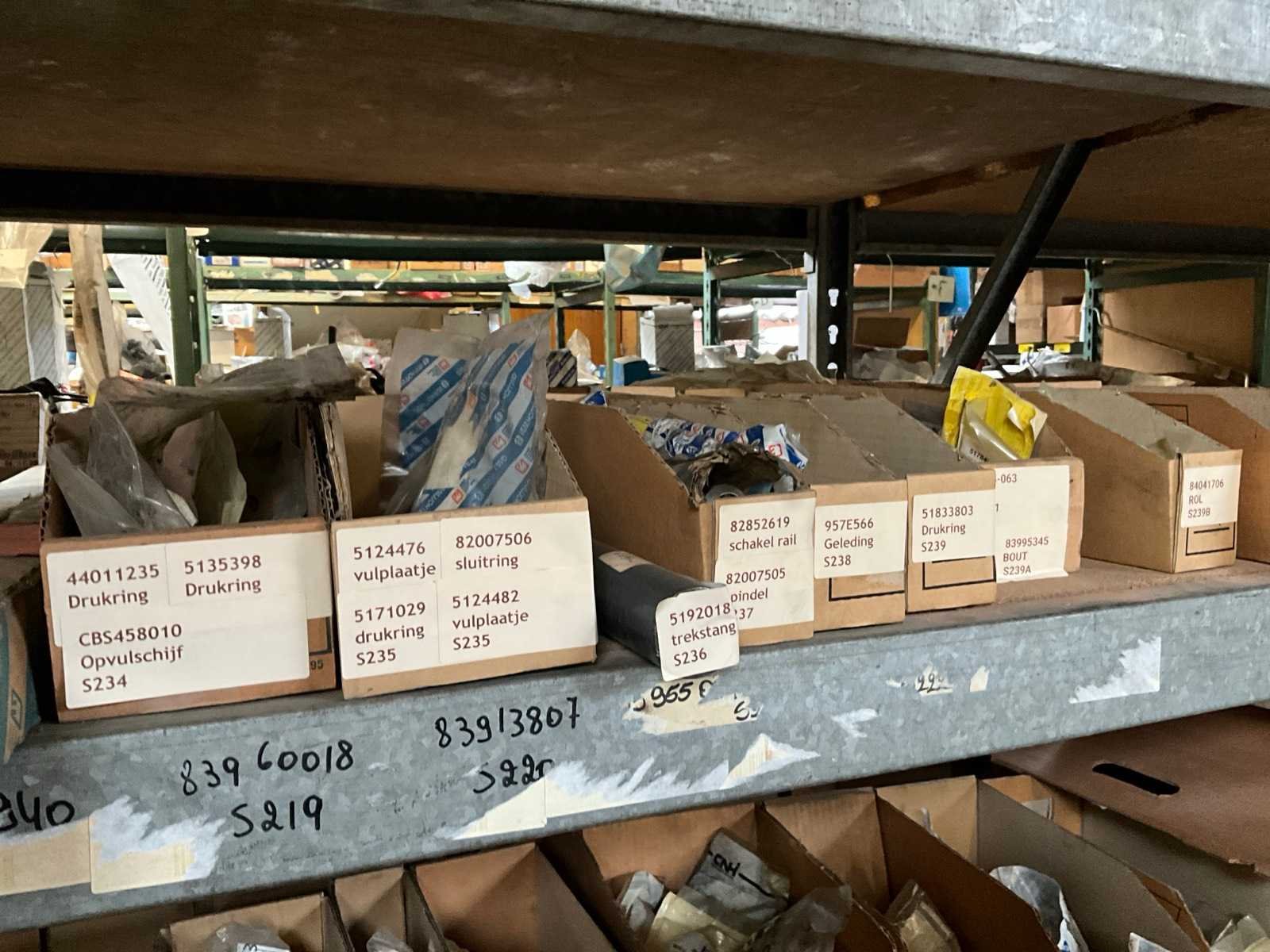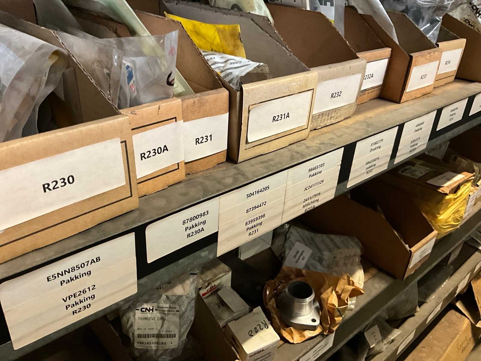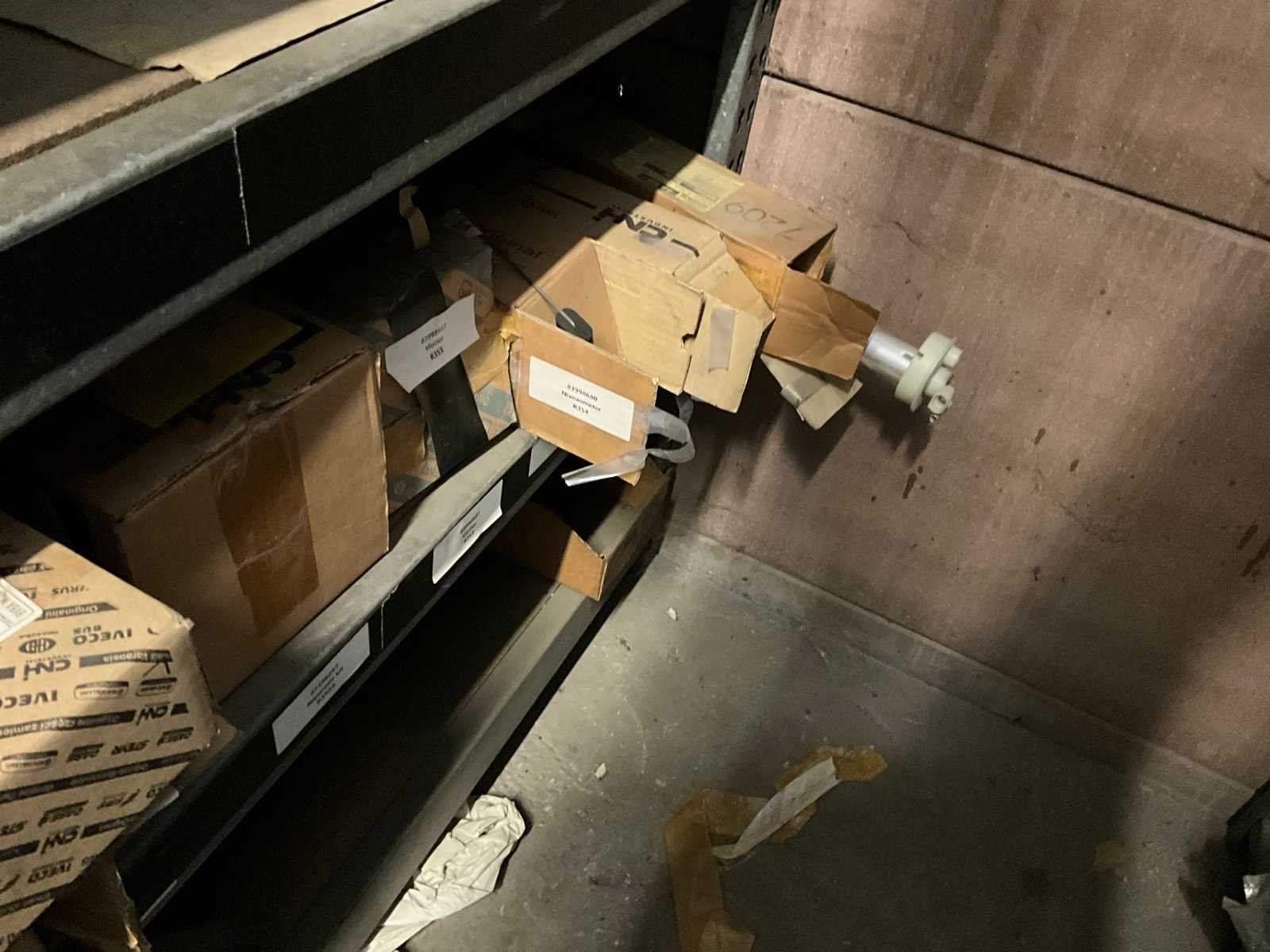 Bestaand uit inhoud 2-delig rek met 15 secties waaronder onderdelen voor brandstof en watercircuit, opvoerpompen, tankdoppen, flenzen, pakkingen, circa 5 radiatoren, naafdoppen, stofkappen, injectiomp, onderdelen voor pakkenpers, hydraulische cilinder enz.. Nee Merk: New Holland