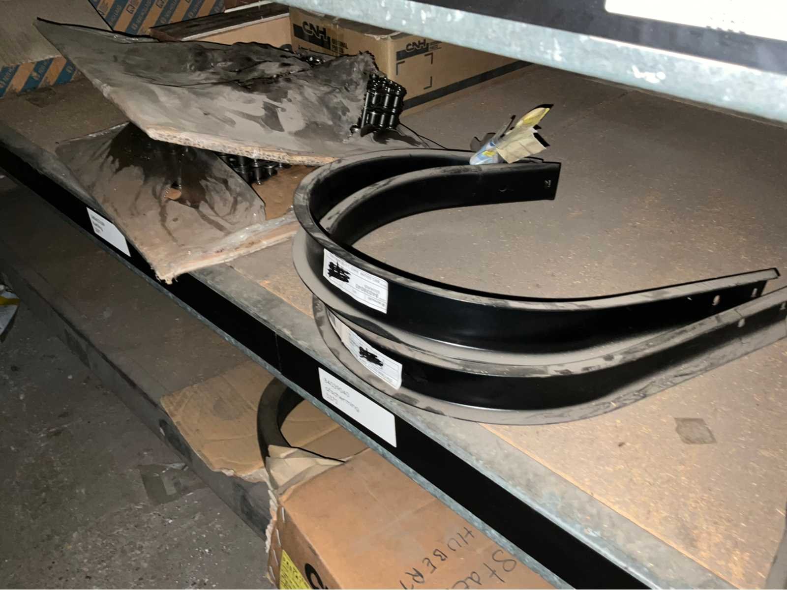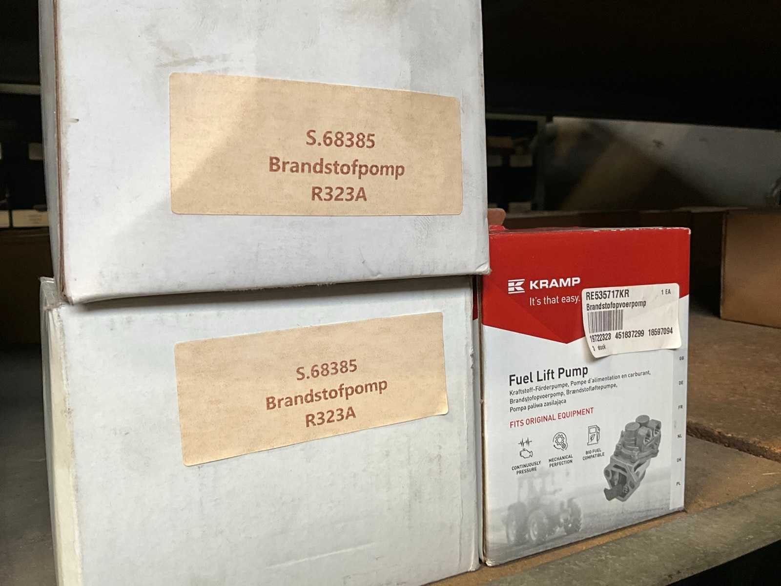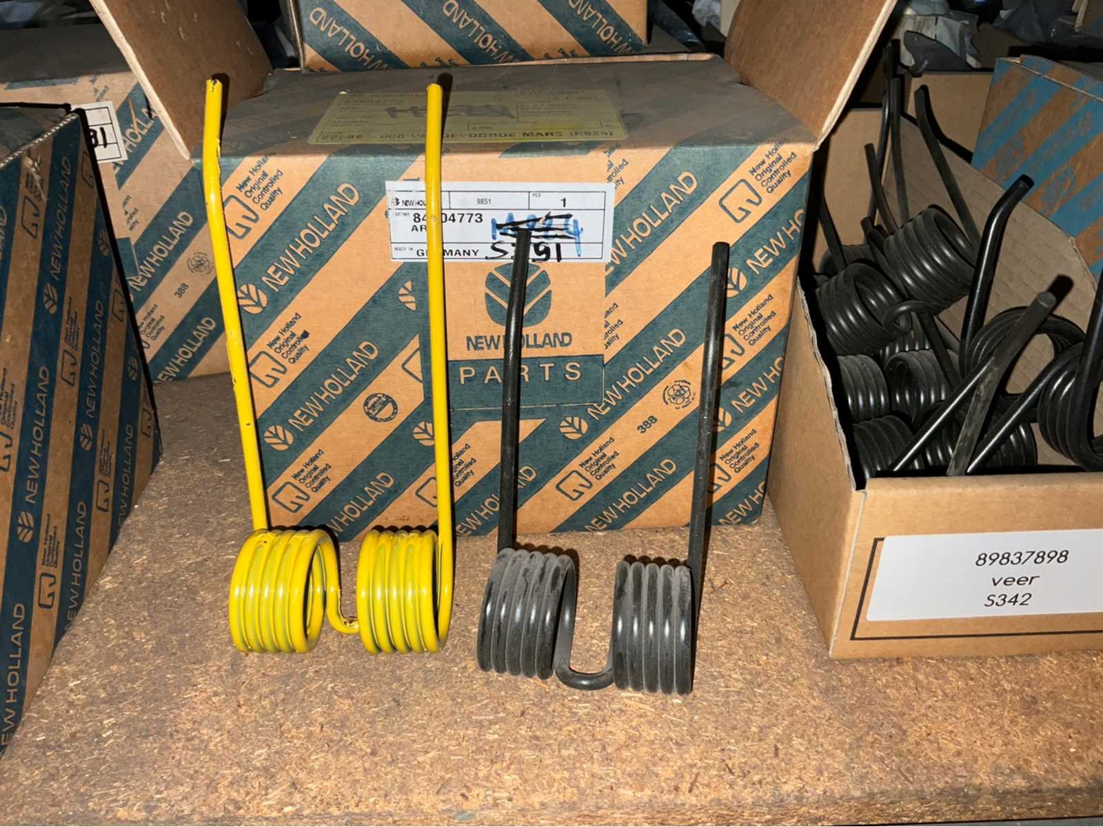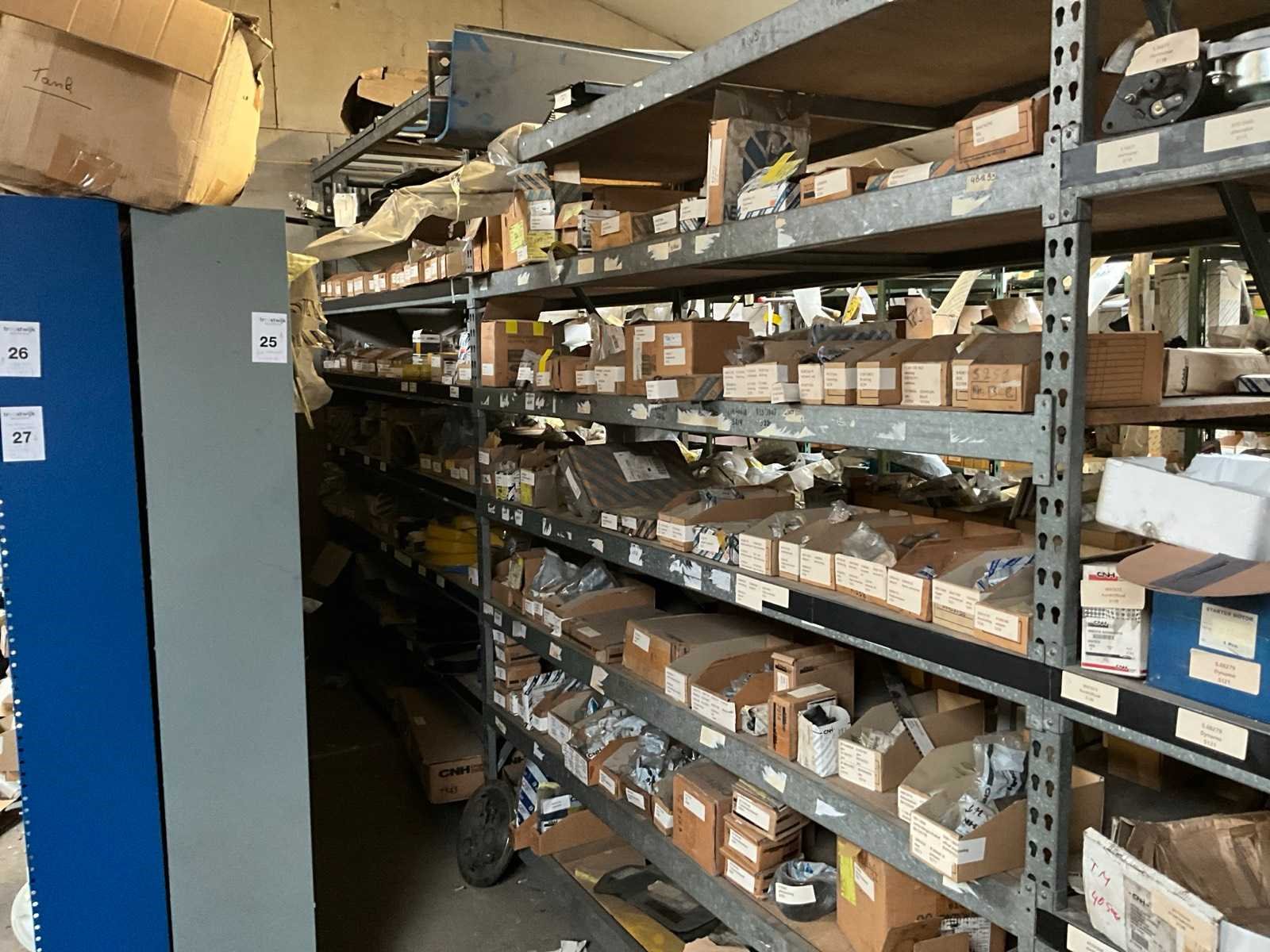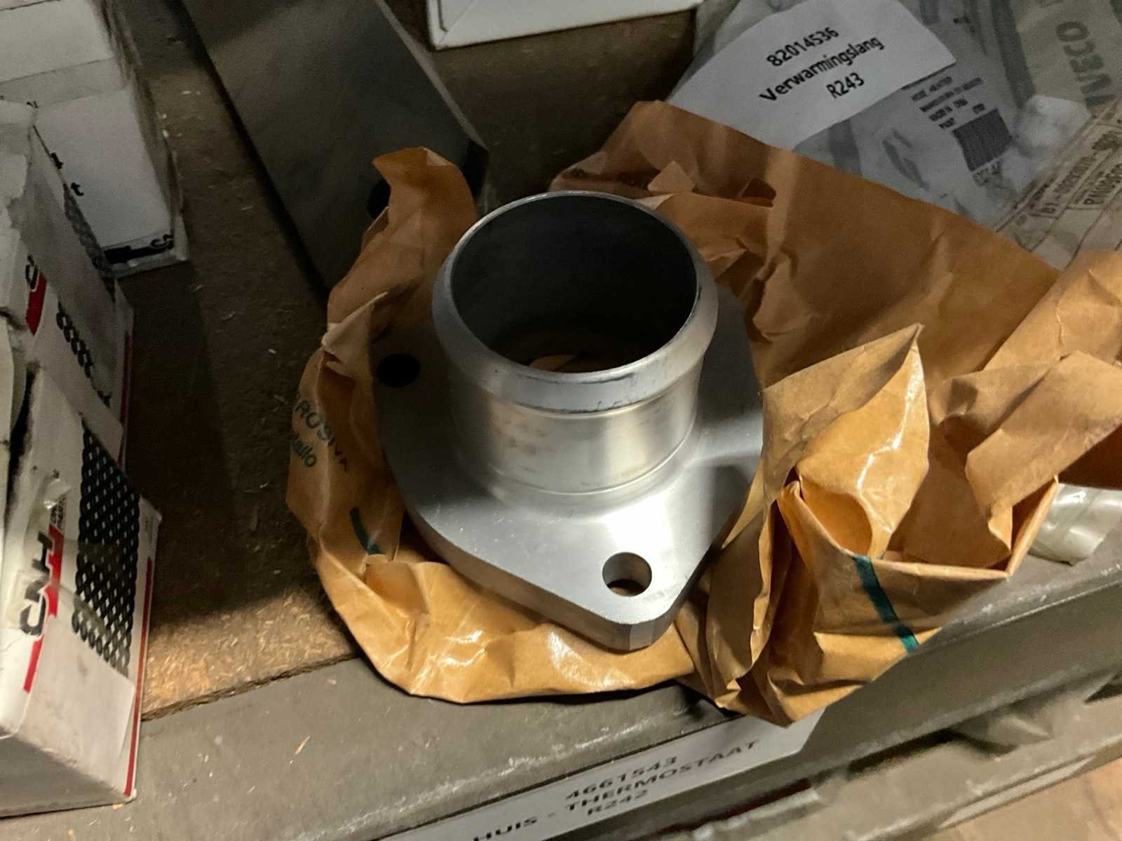 Bestaand uit inhoud 2-delig rek met 15 secties waaronder onderdelen voor brandstof en watercircuit, opvoerpompen, tankdoppen, flenzen, pakkingen, circa 5 radiatoren, naafdoppen, stofkappen, injectiomp, onderdelen voor pakkenpers, hydraulische cilinder enz.. Nee Merk: New Holland