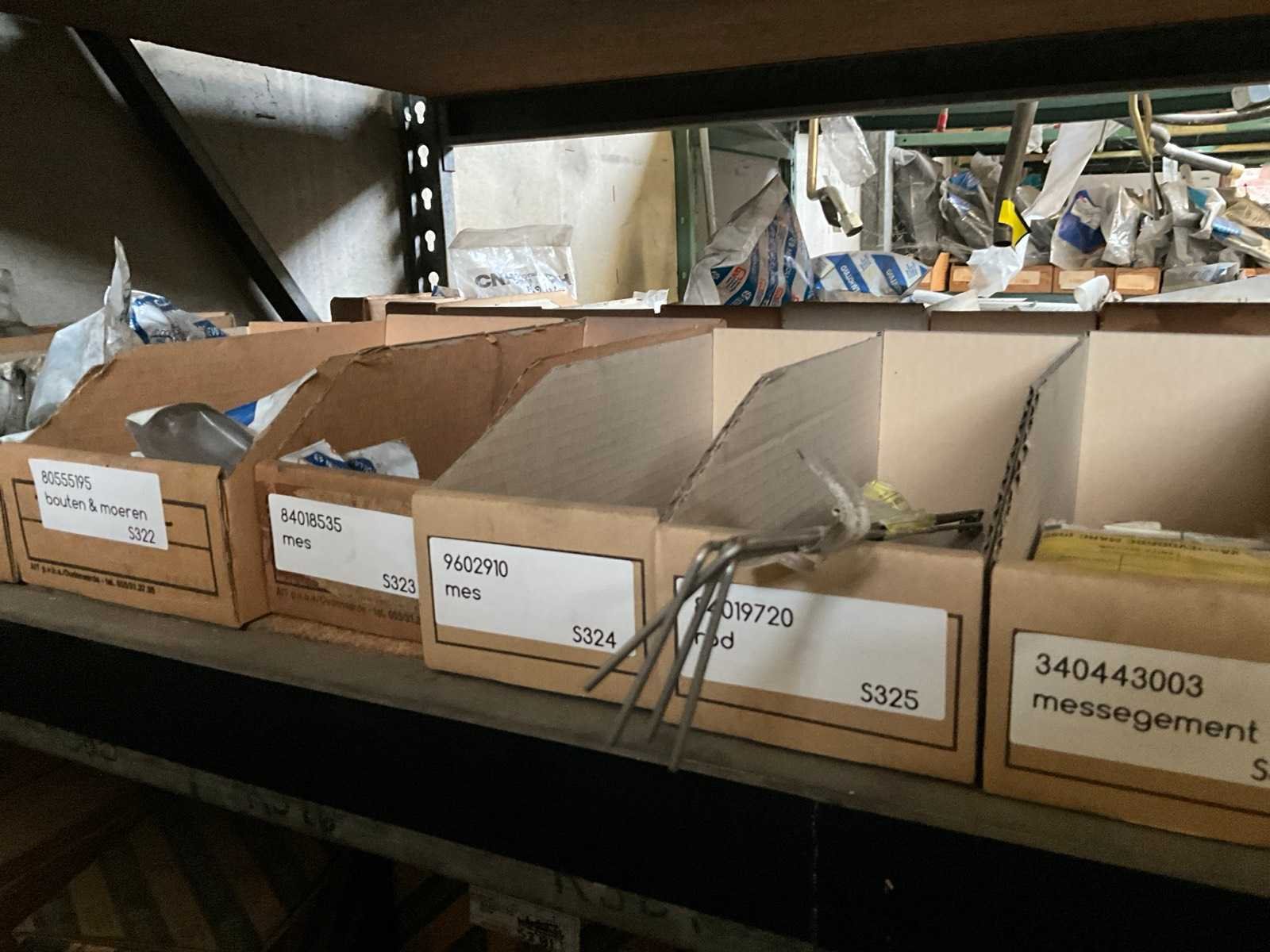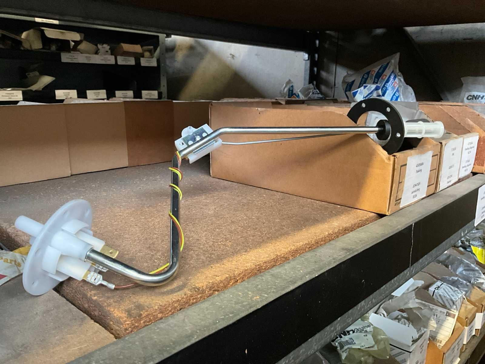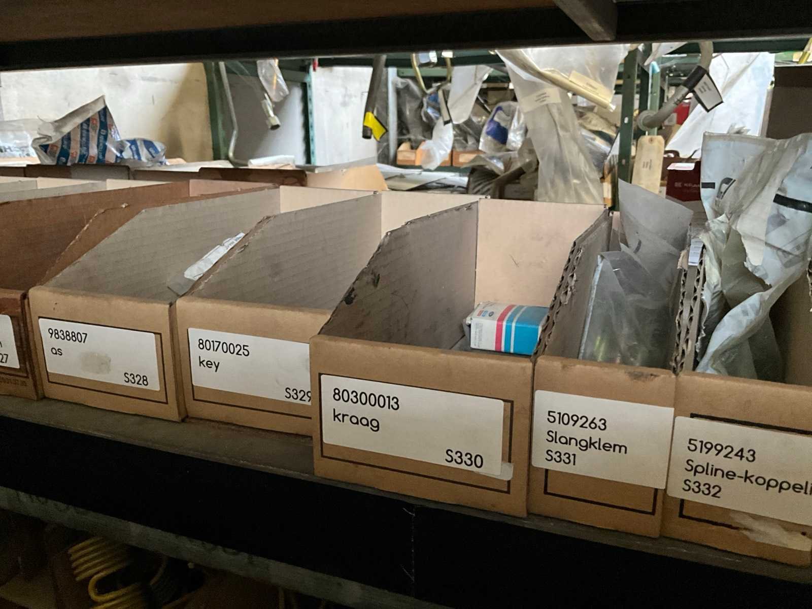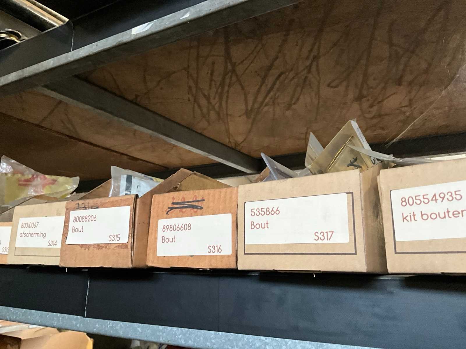 Bestaand uit inhoud 2-delig rek met 15 secties waaronder onderdelen voor brandstof en watercircuit, opvoerpompen, tankdoppen, flenzen, pakkingen, circa 5 radiatoren, naafdoppen, stofkappen, injectiomp, onderdelen voor pakkenpers, hydraulische cilinder enz.. Nee Merk: New Holland