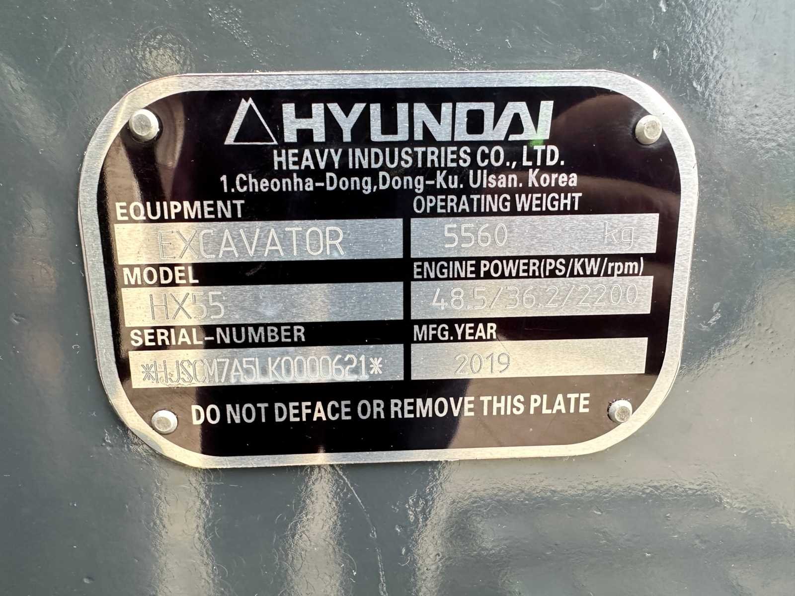 Mechanische snelwissel. Hamerleidingen . Tandenbak. Duwblad. Rupsen met rubber pads. Geen documenten. Nee Merk: Hyundai Type: HX55 Bouwjaar: 2019 Serienummer: HJSCM7A5LK0000621 Merk motor: Yanmar Motorvermogen (kW): 36.2kW Aantal cilinders: 4 Brandstof: Diesel Graafbak afm. b: 650mm Rups breedte: 400mm Afgelezen urenstand: 3711 Eigen gewicht: 5560kg Totale afmeting L: 5900mm Totale afmeting Breedte: 2000mm Totale afmeting Hoogte: 2600mm GS Code: 8429521200