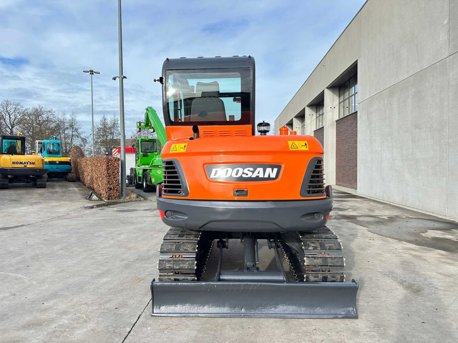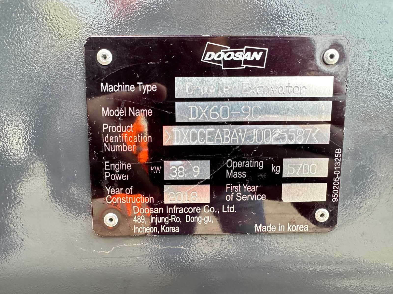 Mechanische snelwissel Hamerleidingen Tandenbak Duwblad Rupsen met rubber pads Geen documenten Nee Merk: Doosan Type: DX60-9 Bouwjaar: 2018 Serienummer: DXCCEABAVJ0025587 Merk motor: Yanmar Motorvermogen (kW): 38.9kW Aantal cilinders: 4 Brandstof: Diesel Graafbak afm. b: 650mm Rups breedte: 380mm Afgelezen urenstand: 4908 Eigen gewicht: 5700kg Totale afmeting L: 5700mm Totale afmeting Breedte: 2000mm Totale afmeting Hoogte: 2600mm GS Code: 8429521200