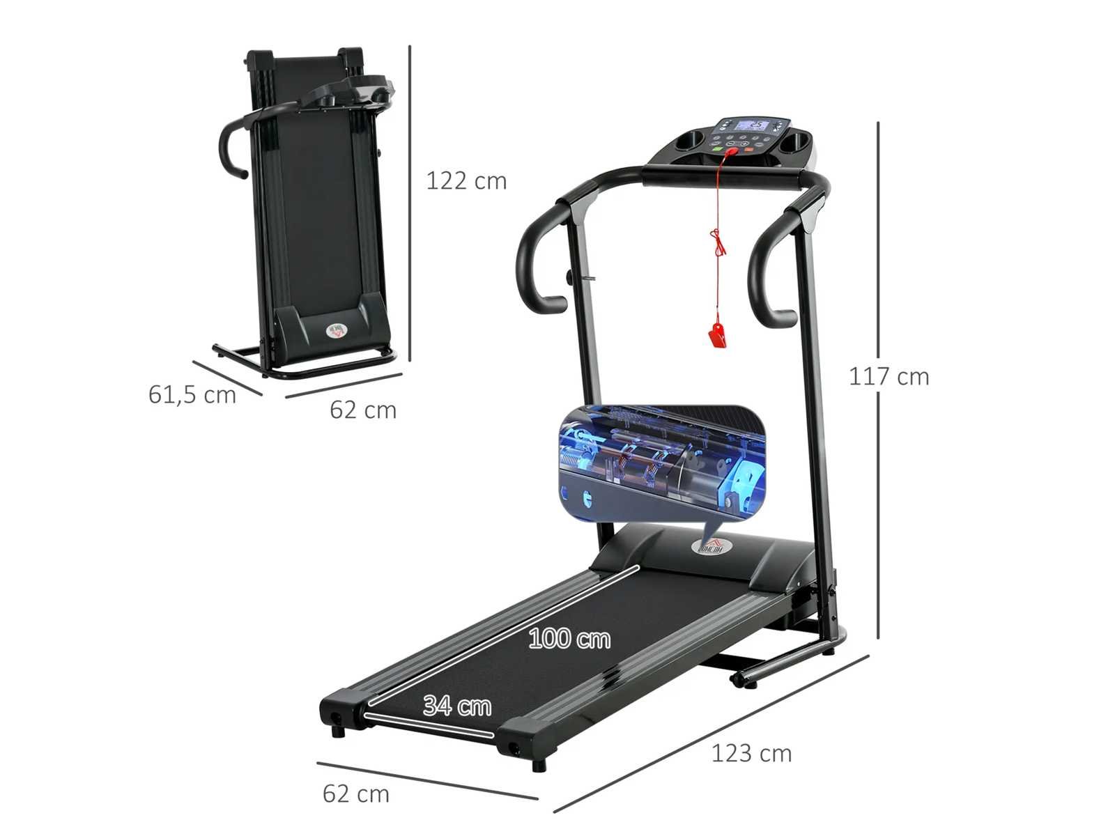 Specificaties: - Kleur: zwart - Materialen: staal, EVA, PP, ABS - Totale afmetingen: 123L x 62B x 117H cm - Opgevouwen afmetingen: 61,5L x 62B x 122H cm - Loopoppervlak: 100L x 34l cm - Vermogen: 550 W - Spanning: 220V - 230V - Frequentie: 50 Hz - Aanbevolen maximale belasting: 100 kg Non