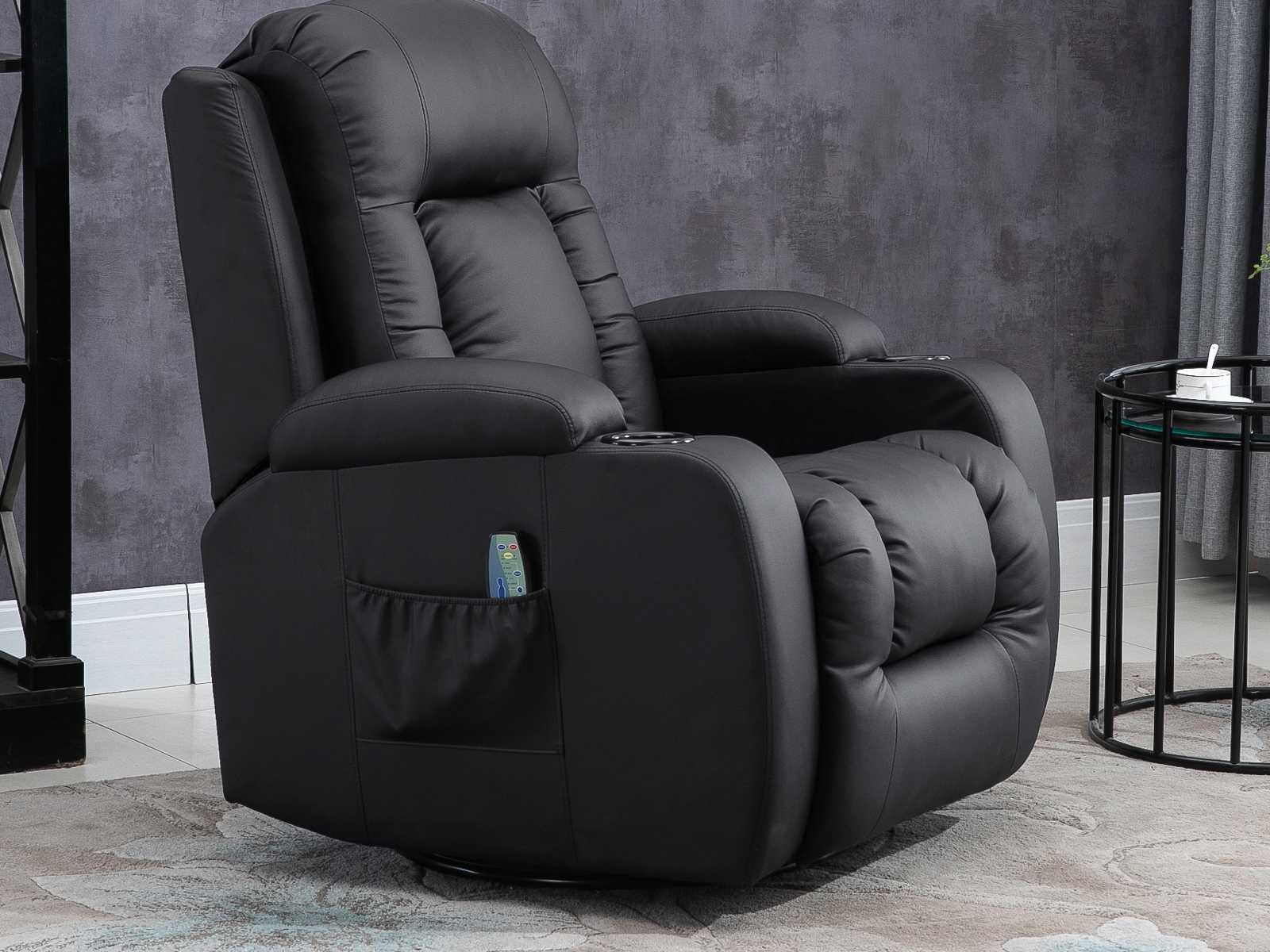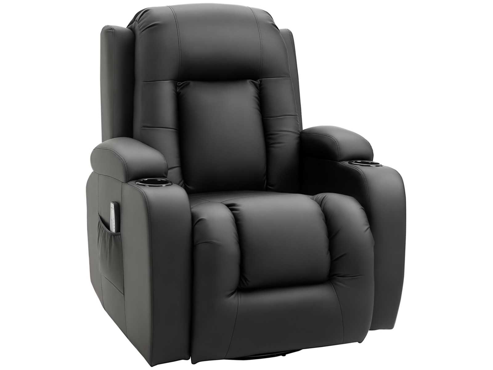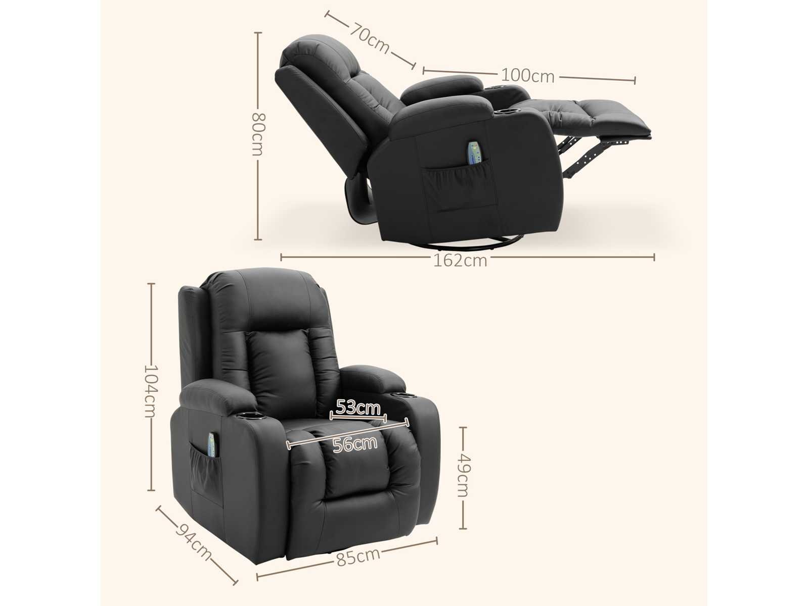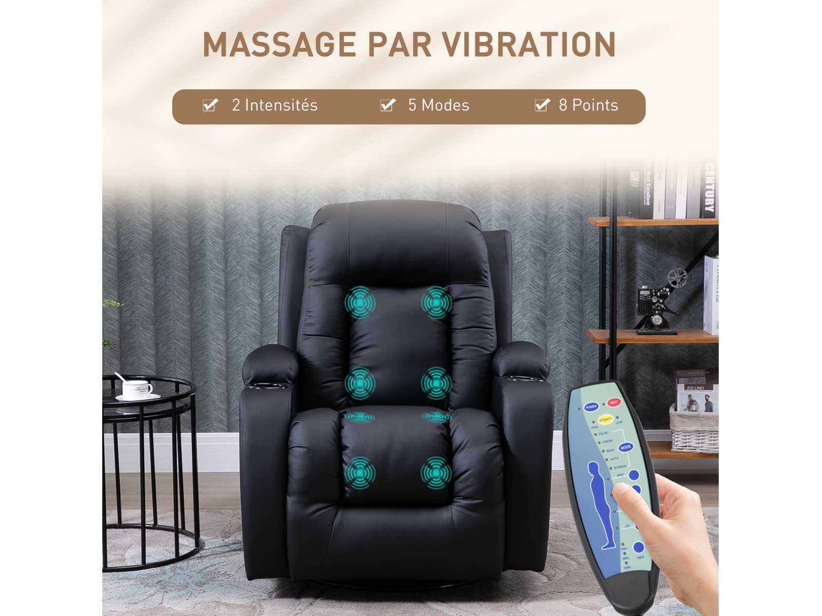 Kenmerken: - 8 vibratiemassagepunten: 2 voor de rug, 2 voor de lumbale, 2 voor de dijen en 2 voor de kuiten - Ingebouwde rugverwarming om je rugpijn verder te verminderen - Relaxstoel met een handmatige achterleuning in 2 posities: 90° of 150° 360° draaistoel handmatig - Massagestoel met 2 geïntegreerde bekerhouders (diameter 9 cm) aan elk uiteinde van de armleuningen - Verstelbare voetsteun om je benen te ontlasten - Gemakkelijke onderhouds- en reiniging voor langdurig gebruik - CE- en ROHS-certificeringen Specificaties: - Kleur: zwart - Hoofdmaterialen: synthetische coating, staal, schuim - Sun. fauteuil: ca. 90L × 93L ×103H cm in liggende positie: 90L x 111B x 84H cm - Sun. zitplaats: ca. 56 x 80 cm (L x W) - Zithoogte: ca. 49 cm - Armleuninghoogte: 63 cm - Bekerhouder Ø: 9 cm - Spanning: 110 - 240 V, 50 - 60 Hz en 14,4 W vermogen - Aanbevolen maximale belasting: 150 kg Non
