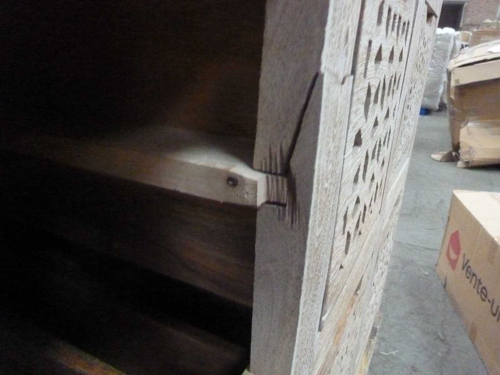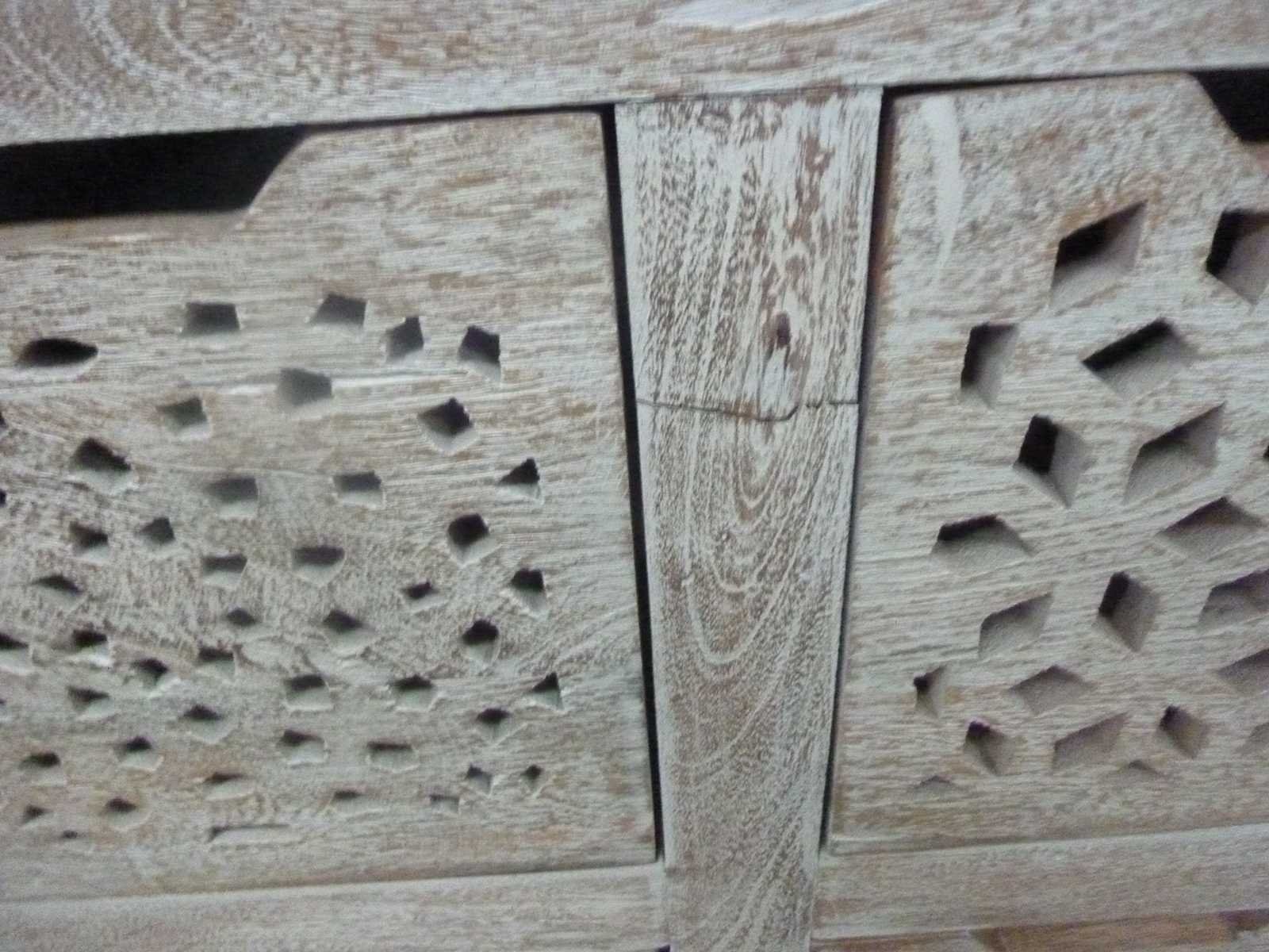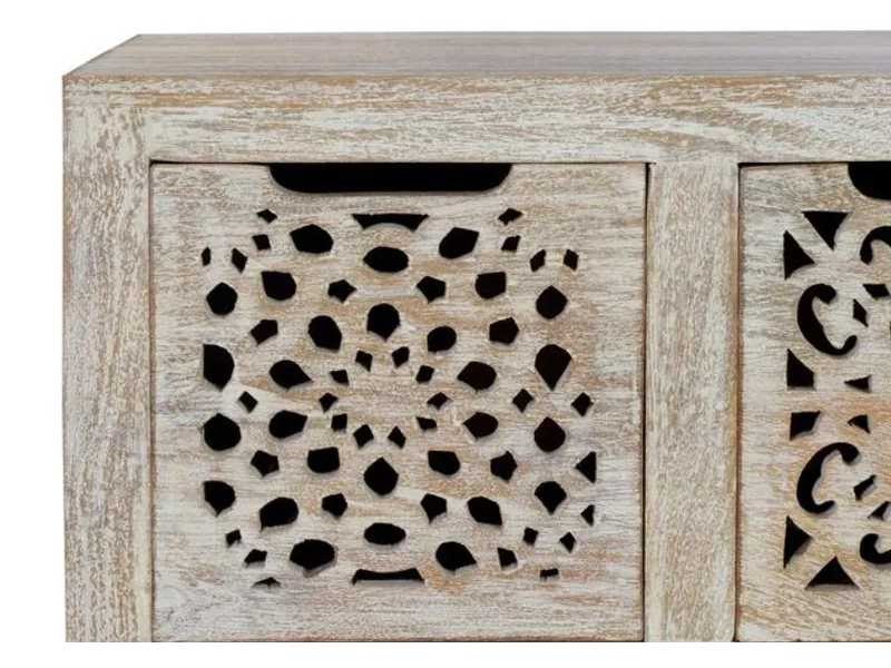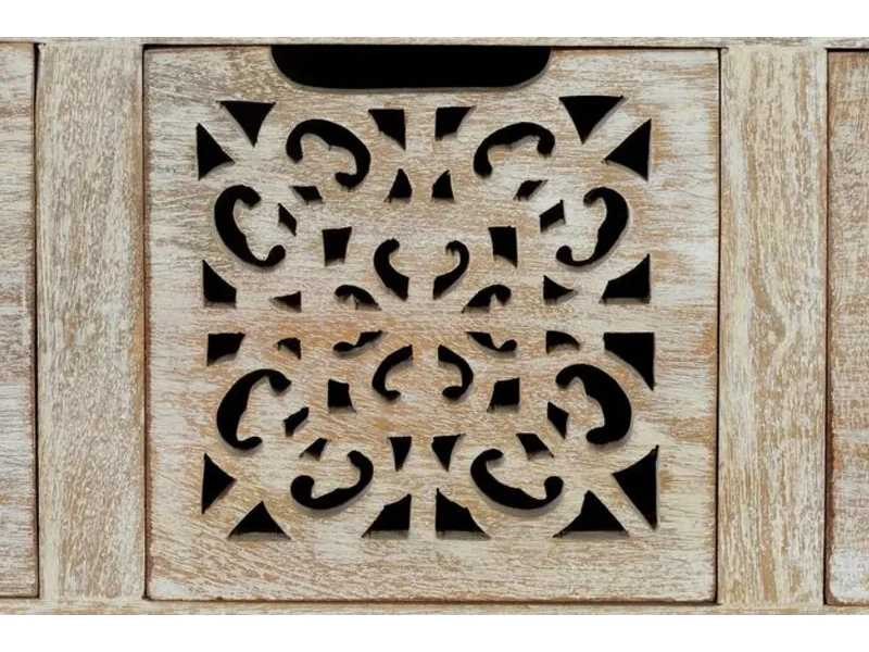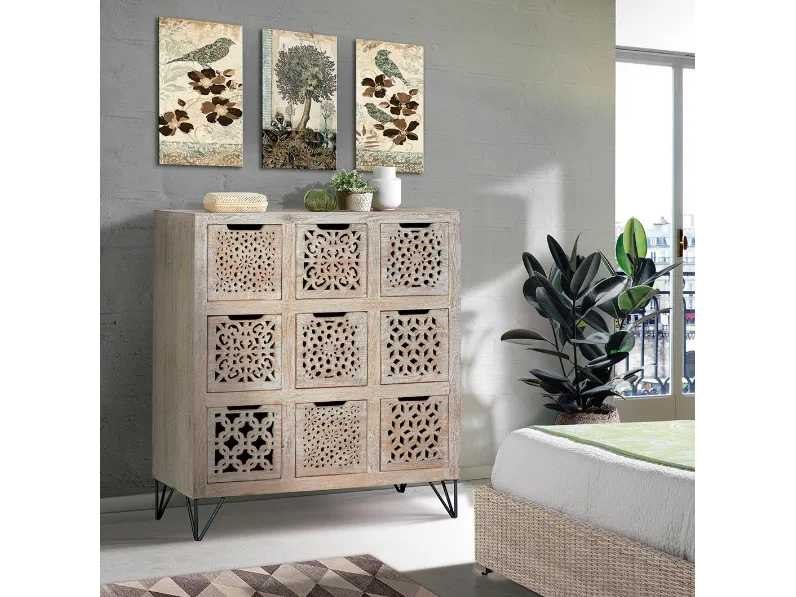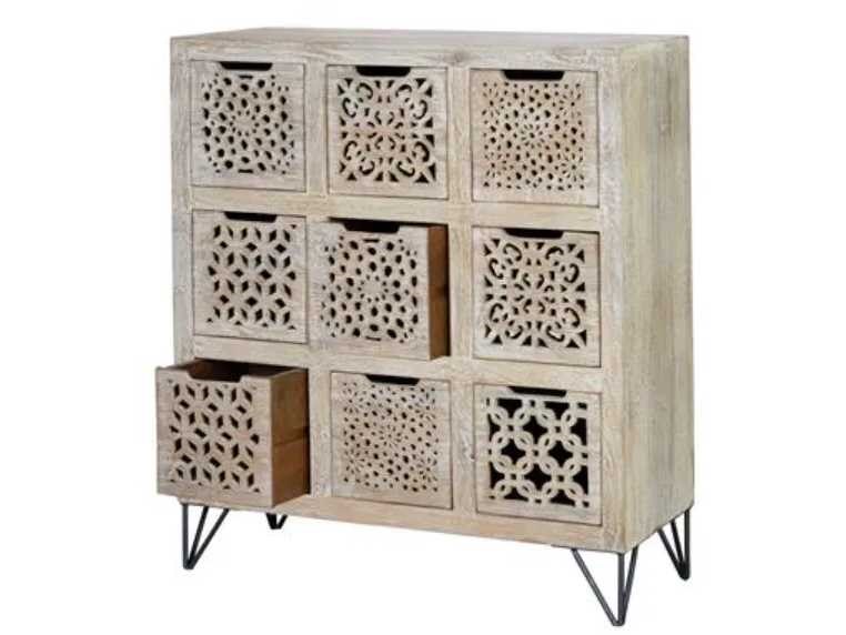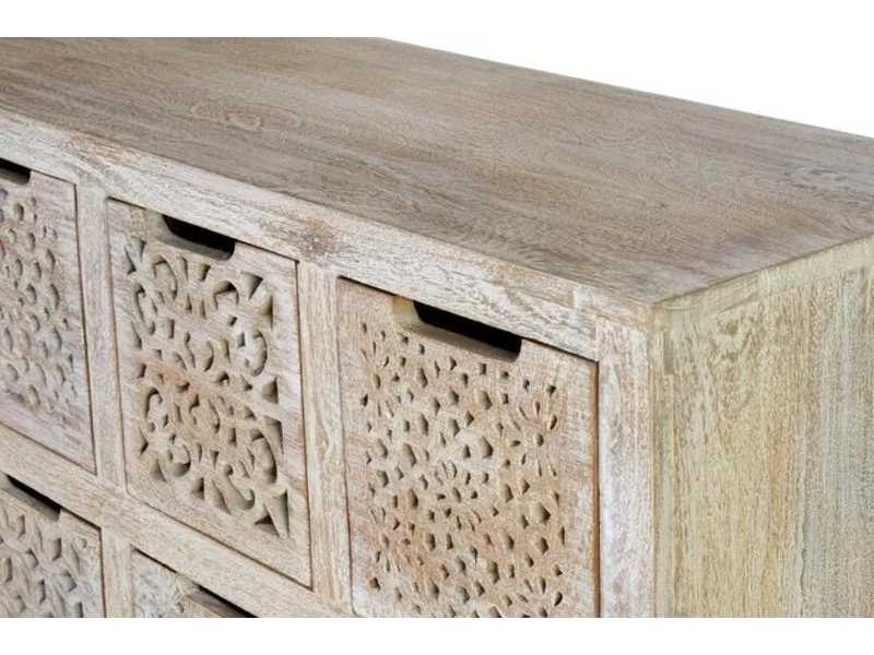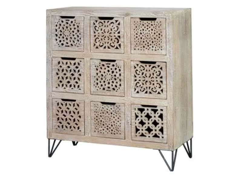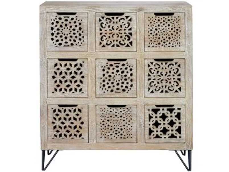 Productbeschrijving: Ladekast met 9 lades. Gemaakt van gerijpt wit mangohout. De poten zijn gemaakt van zwart ijzer. De ladefronten zijn versierd met verschillende motieven. De hoogte van de poten is 13 cm. De binnenkant van de lades meet 20 cm breed x 21 cm hoog x 30 cm diep. De totale afmetingen zijn 88 cm breed x 102 cm hoog x 38 cm diep. Het gewicht van het product is 50 kg. Non