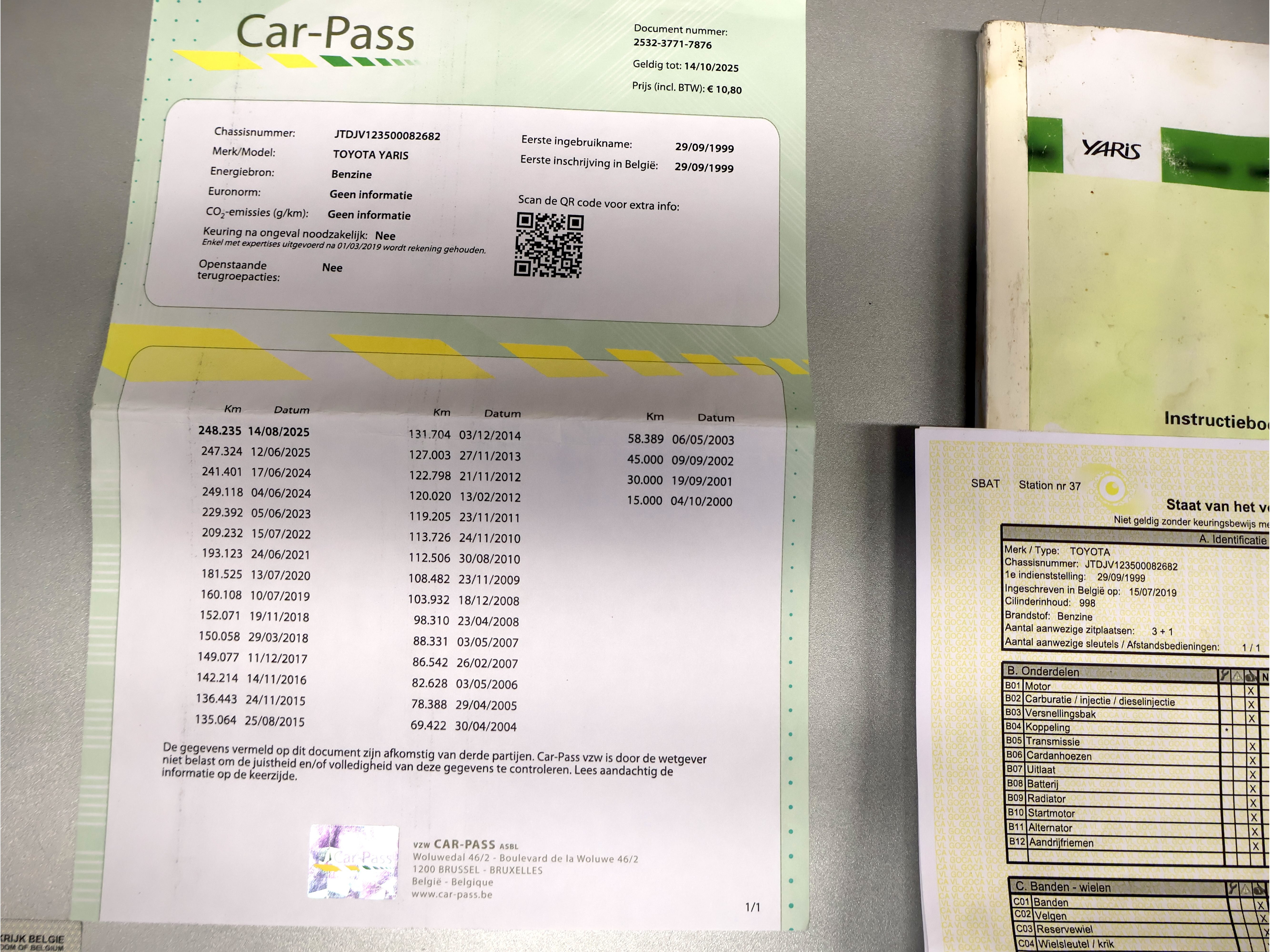 Toyota Yaris - Laatst opgenomen kilometerstand op 14/08/2025: 248.235km - Motorinhoud: 998 - Motorvermogen: 50,00kW - Benzine - Milieuklasse: niet vermeld