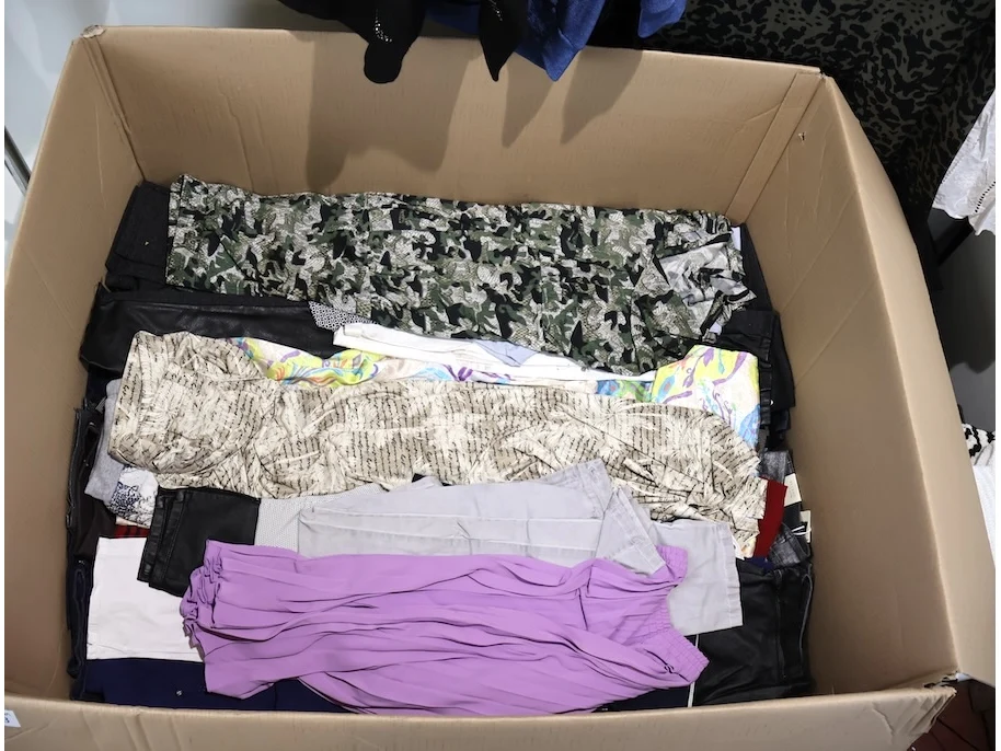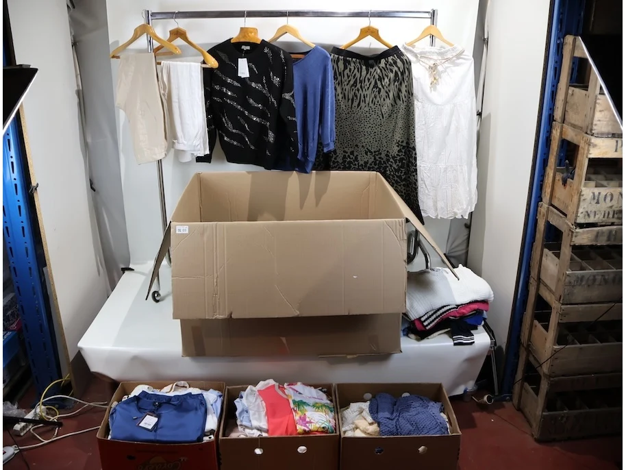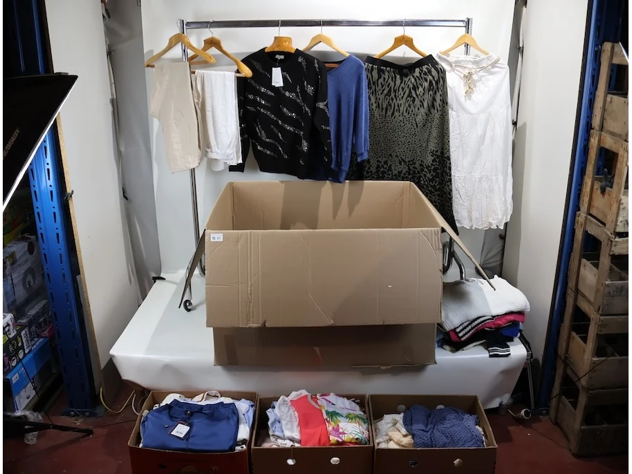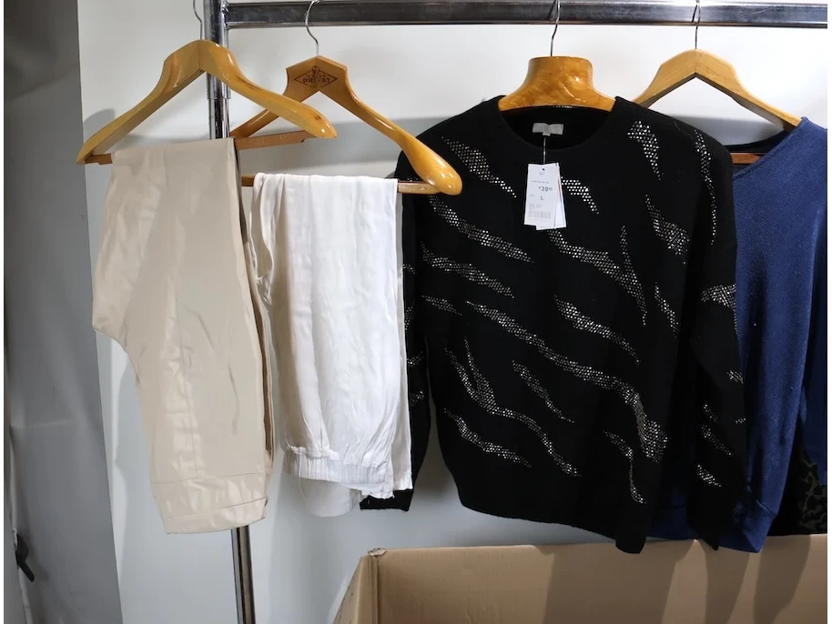 Voornamelijk broeken, T-shirts en blouses, Verschillende maten en modellen, Plm 300 stuks, Exclusief kledingrek en kapstokken