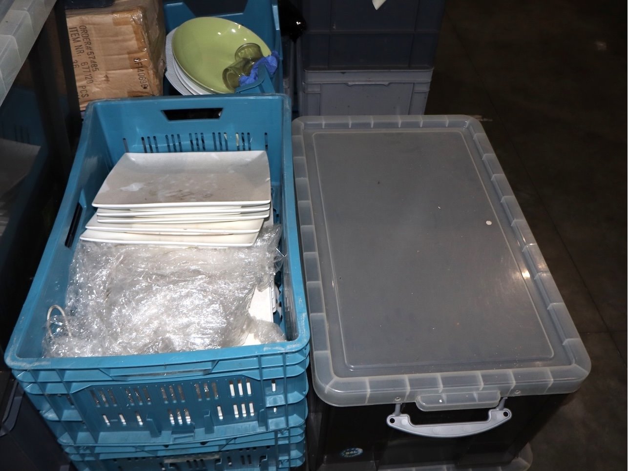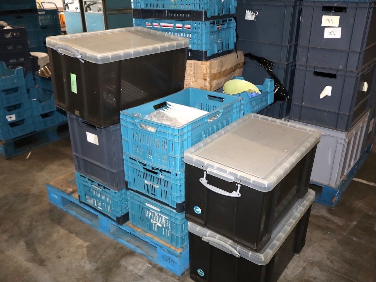 ONGEWASSEN!!! Inhoud Pallet, Inclusief Bakken. Borden, Curverboxen