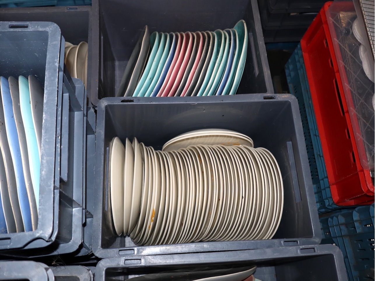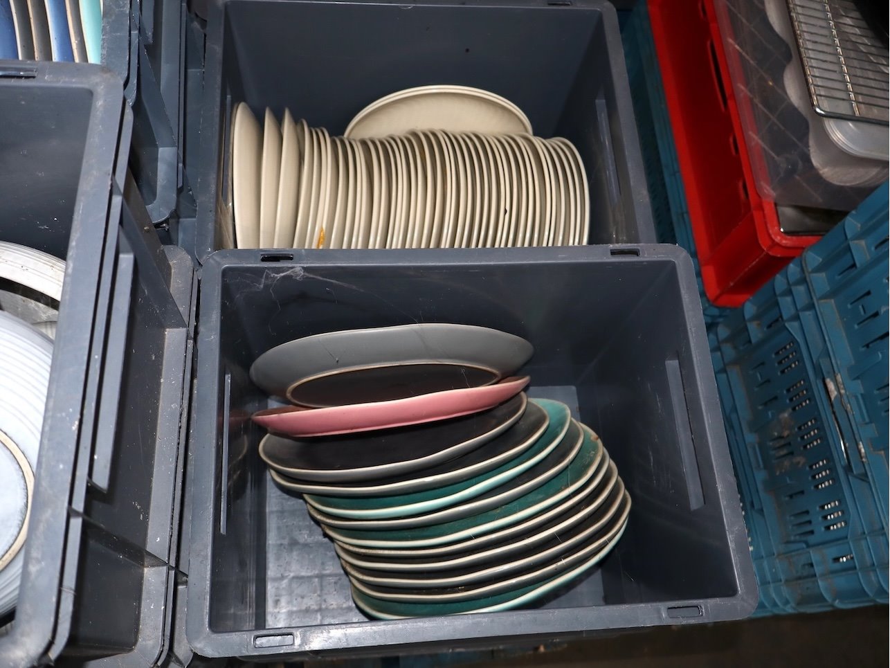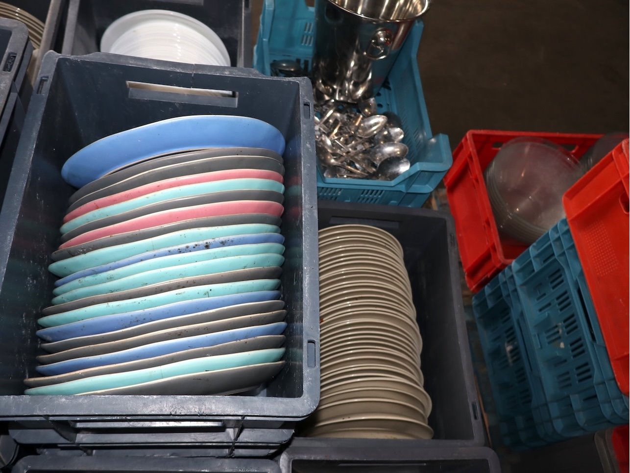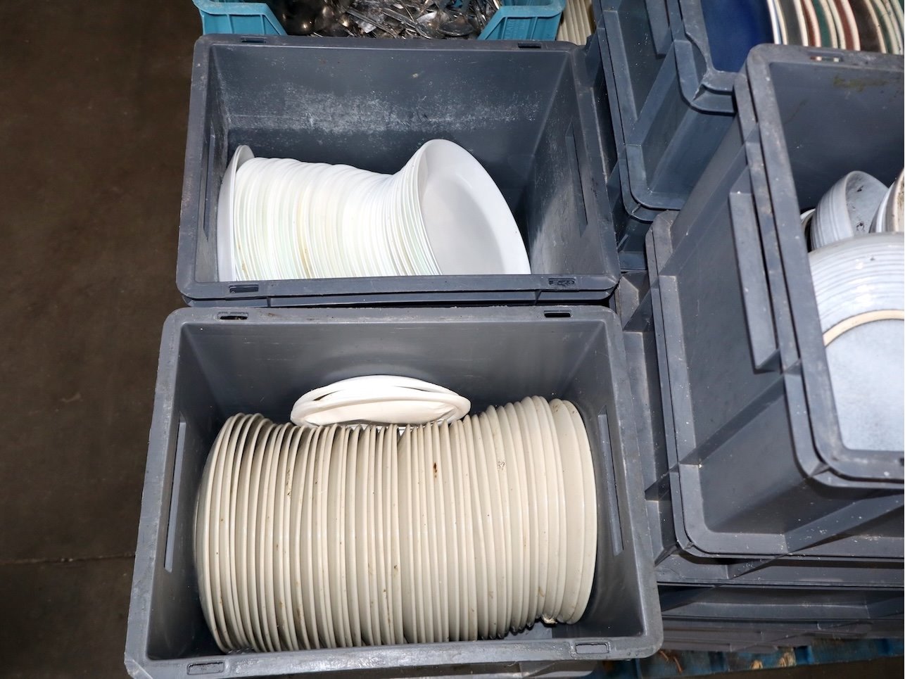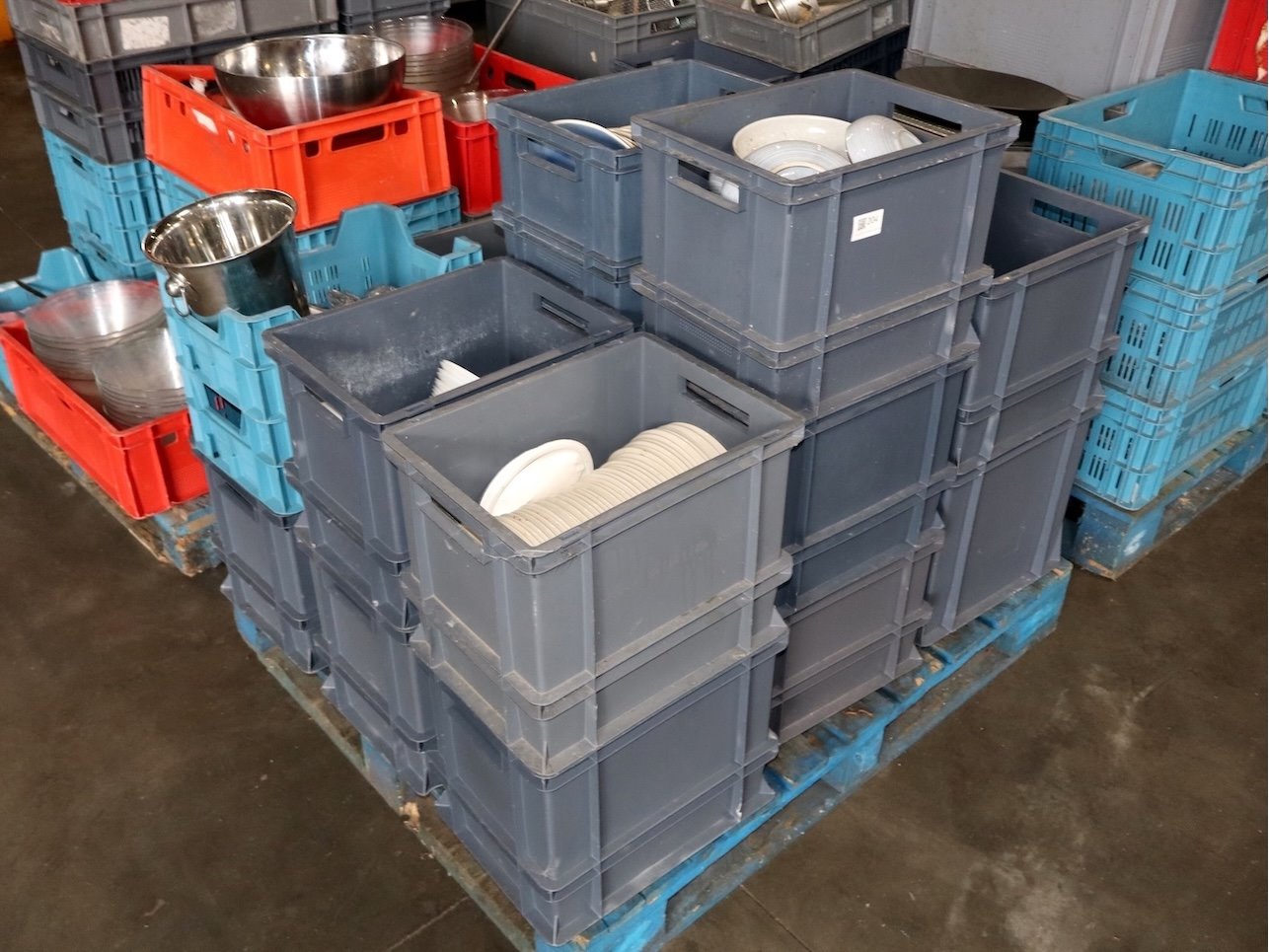 ONGEWASSEN!!! Inhoud Pallet, Inclusief Bakken. Borden, Bestek,...