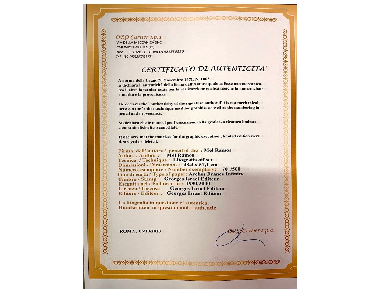 Afmeting: plm 57x38cm, 70/500, Certificaat aanwezig