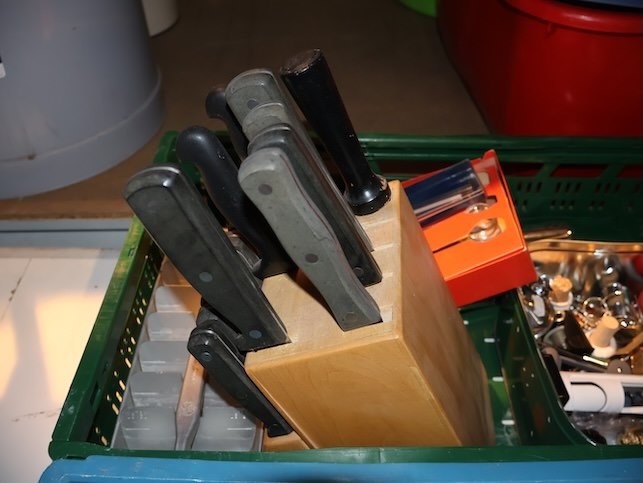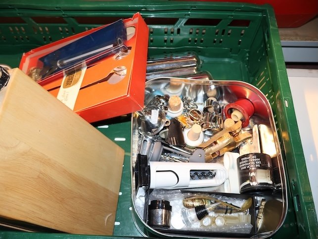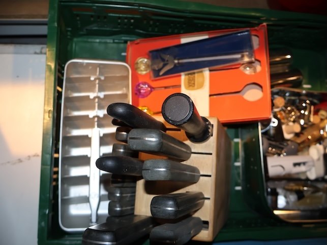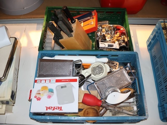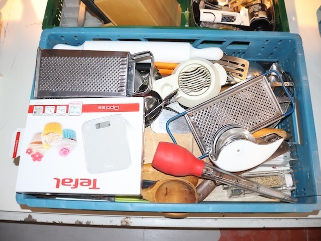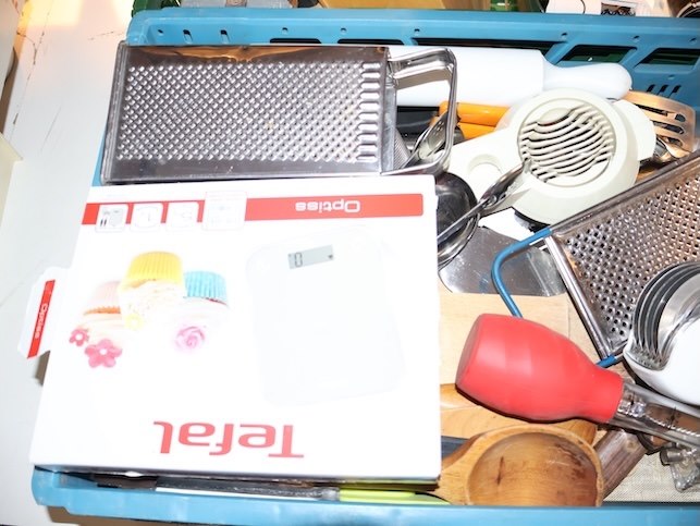 Inhoud 2 bakken, Messenblok, Weegschaal, Pollepels,....Exclusief bakken