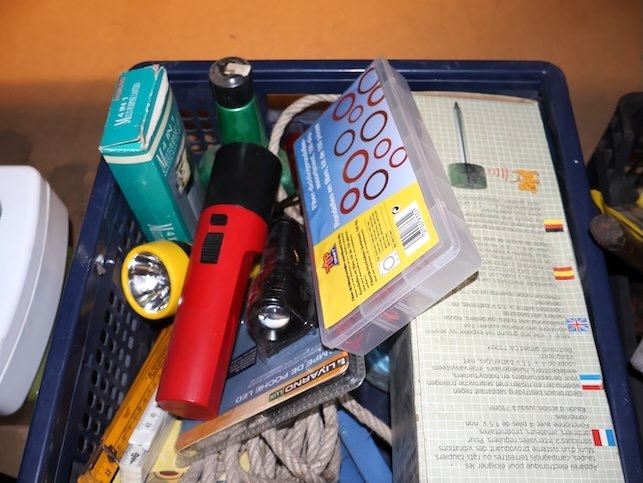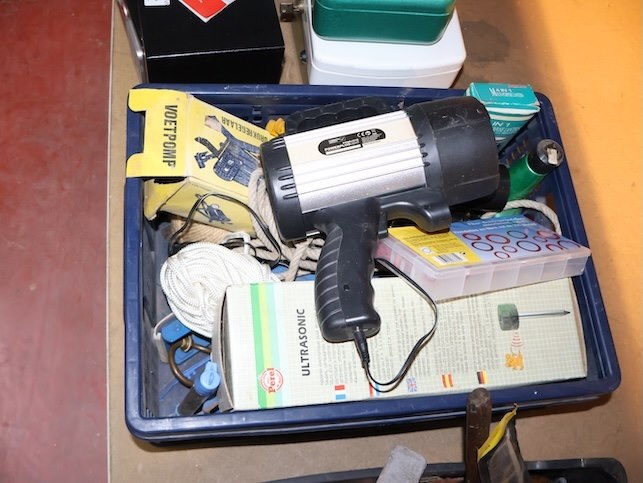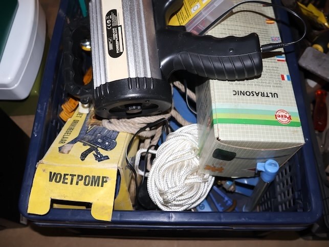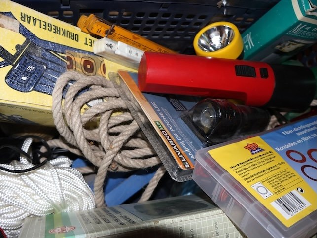 Zware zaklamp, Mollenbestrijding, Voetpomp x2, Diverse touwen,...