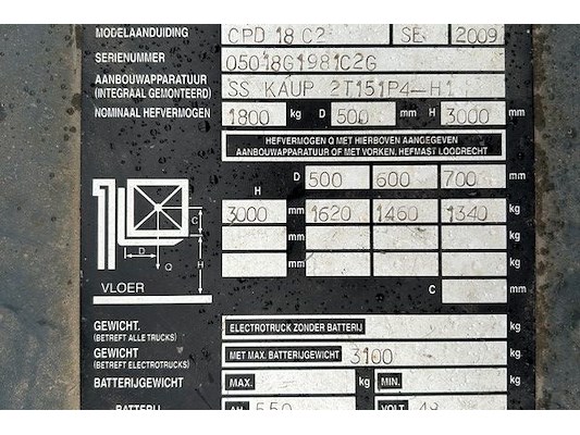 Type 24-D-550, model CPD 18 C2, hefvermogen 1800 kg, bouwjaar 2009, vorklengte 107 cm, doorrijhoogt...