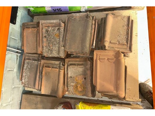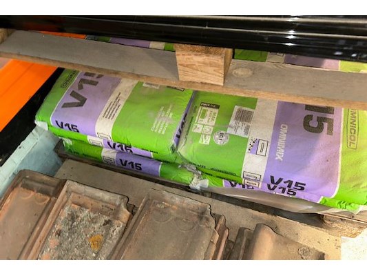Inhoud gedeelte rek zoals 12 zakken vloeregalisatie omnicol V15 grijs, dakpannen, hout