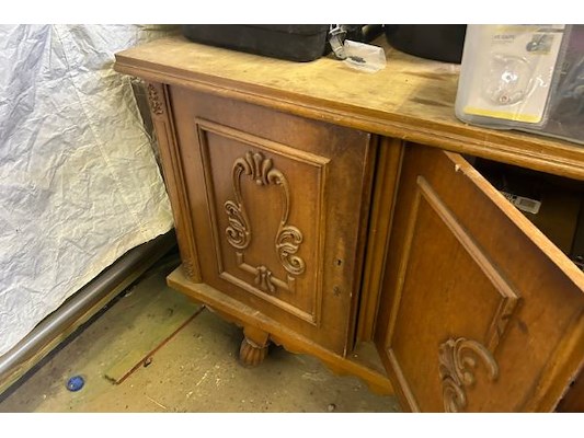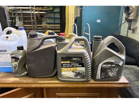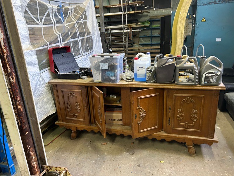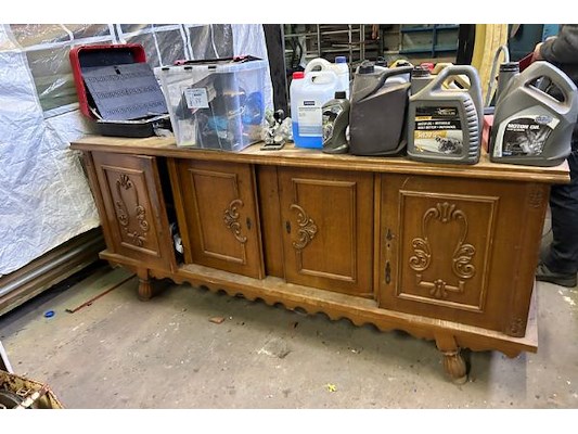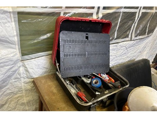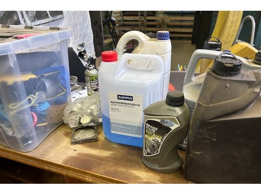 Kast 217 x 53.5 x 90.5 cm hoog, met inhoud als poetsmateriaal auto, motorolie, handgereedschap, ...