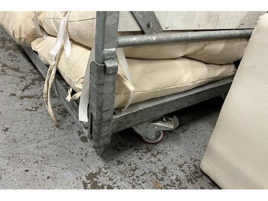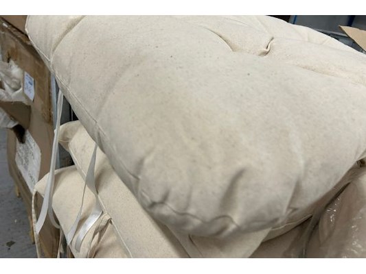 Ongeveer 20 stoelkussens, waaronder 50 x 85 cm, 78 x 65 cm, 60 x 45 cm, + kar 157 x 77 x 123 cm