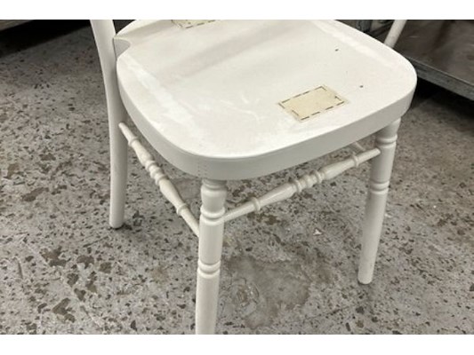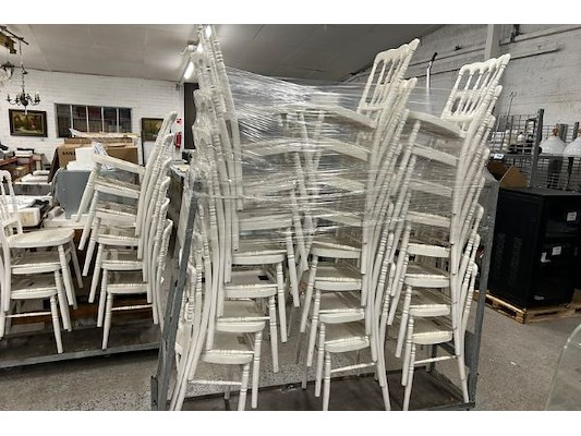 24 witte houten stoelen, zithoogte 46 cm, kar 187 x 45 x 147 cm hoog