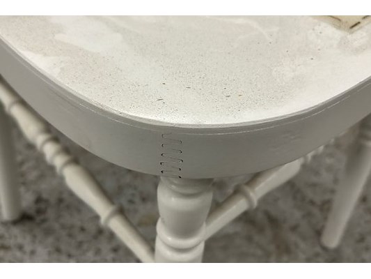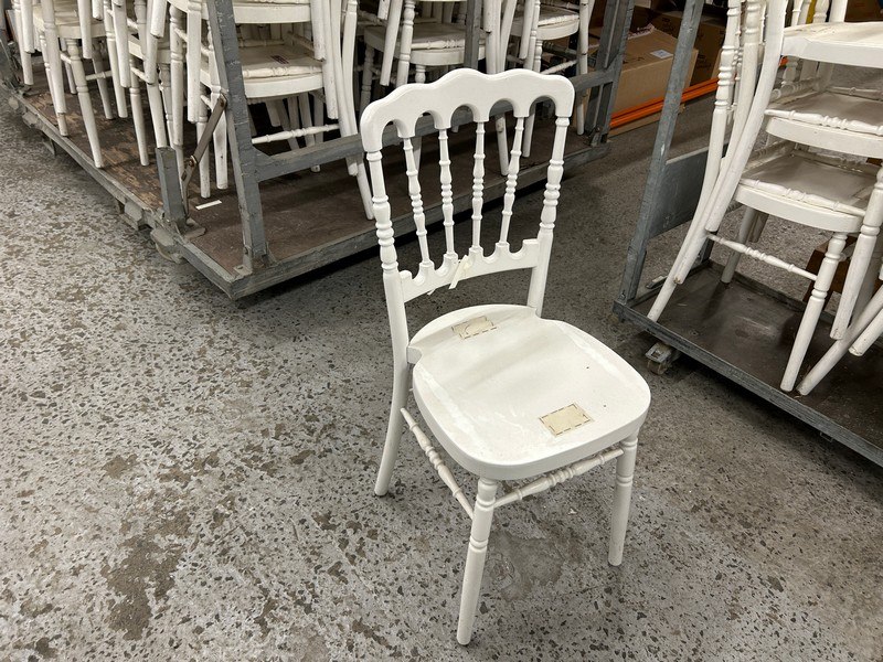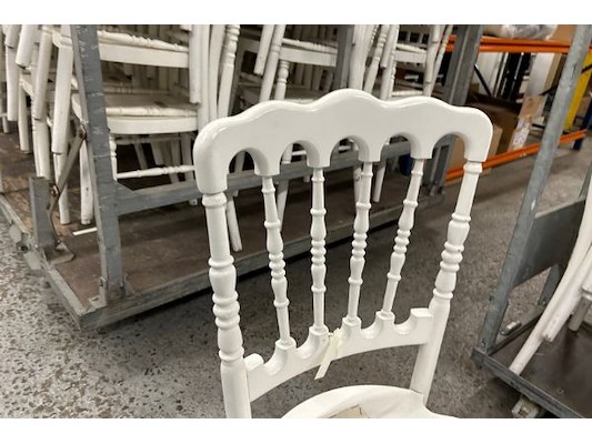 12 witte houten stoelen, zithoogte 46 cm, kar 187 x 45 x 147 cm hoog