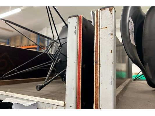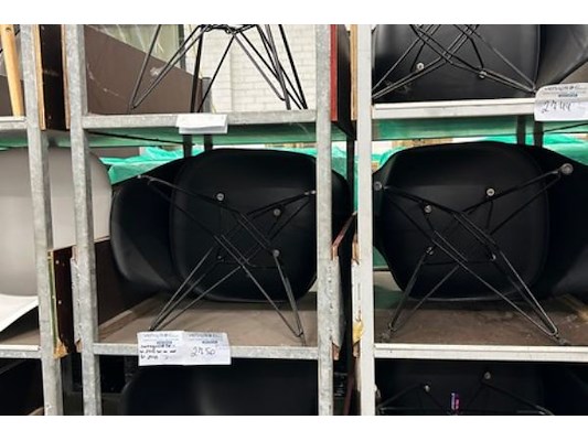 6 zwarte stoelen, zithoogte 45 cm, kar 60 x 99.5 x 188 cm hoog, 4 verdiepingen, zit ook in lot 2750