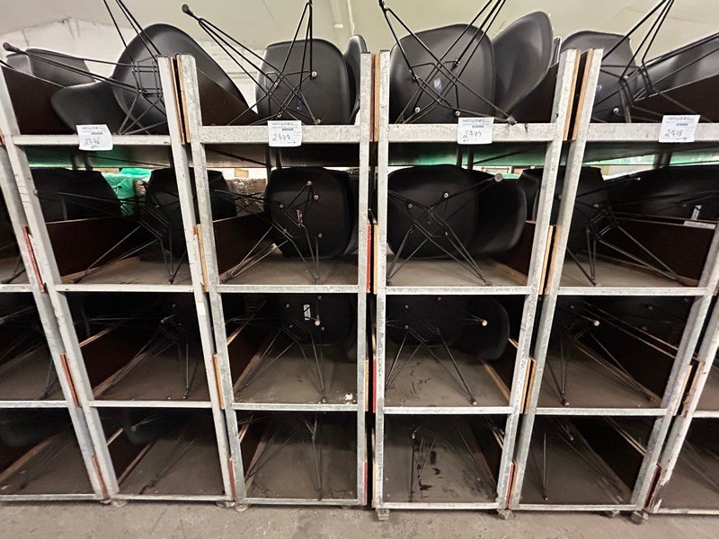 16 zwarte stoelen, zithoogte 45 cm, 2 karren 60 x 99.5 x 188 cm hoog, 4 verdiepingen, zit ook in lot 2750