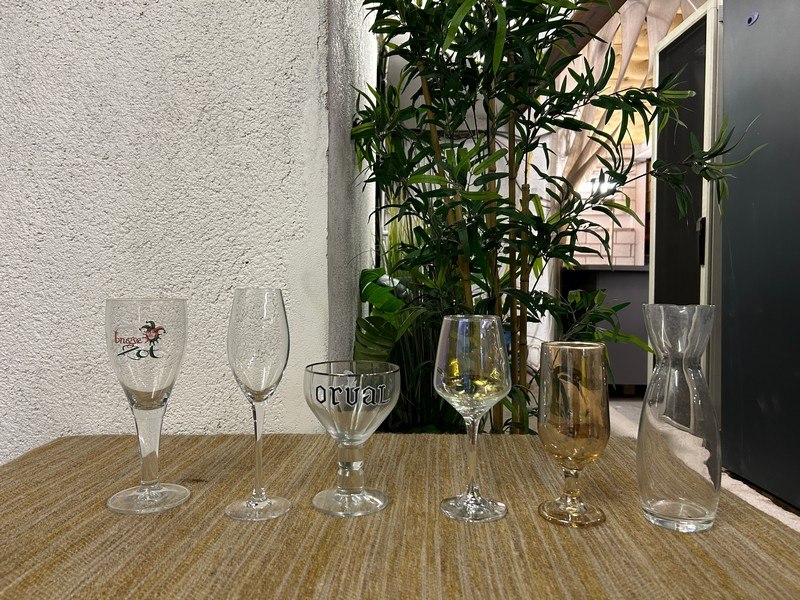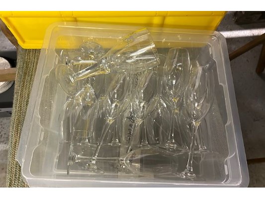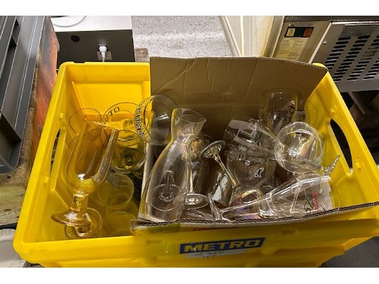 Ongeveer 35 diverse glazen, diverse maten, + bak