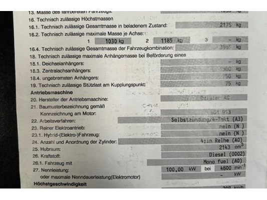 TTM 2175 kg, motorinhoud 2143 cm³, vermogen 100 kW, milieuklasse euro 5, 1ste inschrijving 01/09/2010, die...