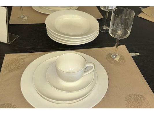 Set Eurofashioon, waaronder wit, diverse maten, borden, kopjes, glazen, kommen, onderleggers