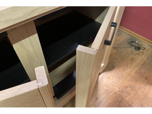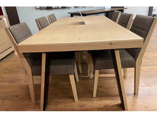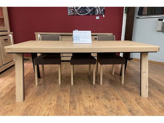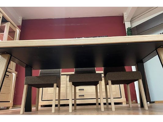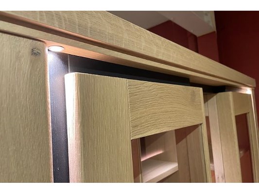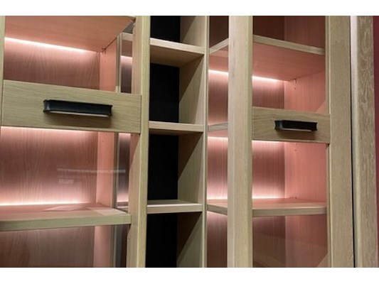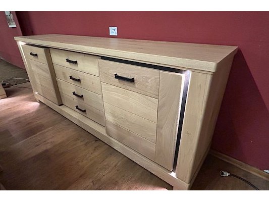 Dressoir 230 x 90 x 50 cm met verlichting, vitrine 135 x 215 x 50 cm met verlichting, tafel 200 x 98 x 78 cm hoog, 6 stoe...