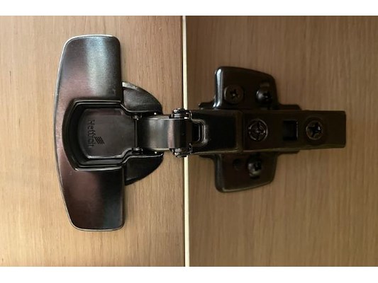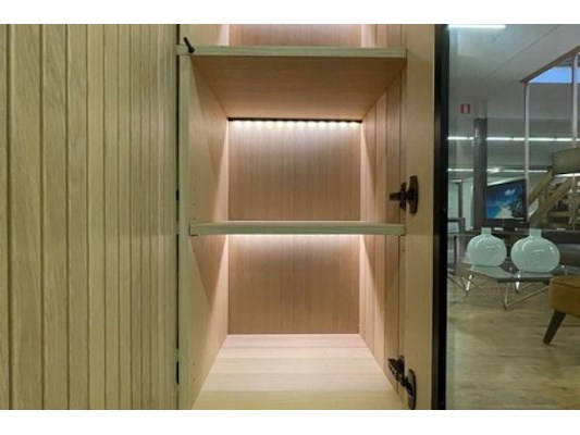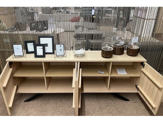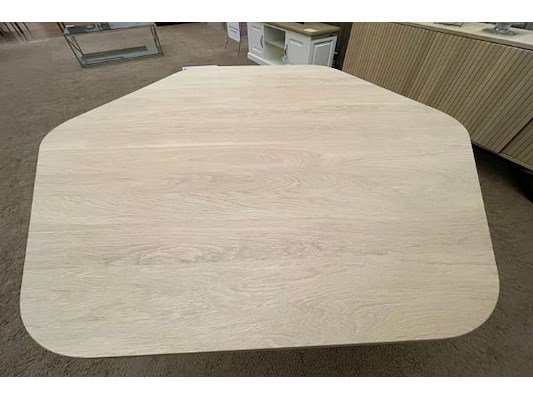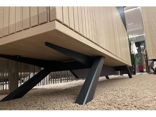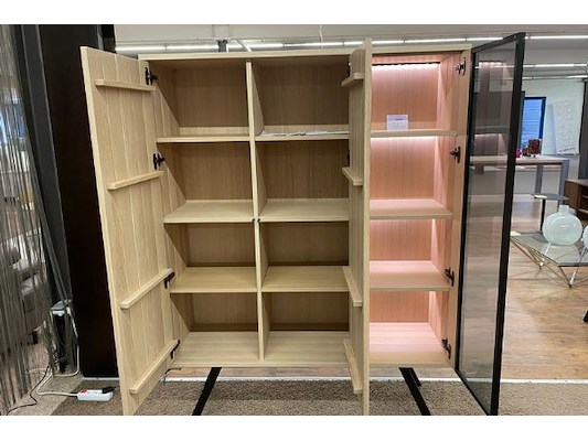 Dressoir 216 x 83 x 45 cm, vitrine 135 x 177 x 45 cm met verlichting, 6-hoekige tafel 15 x 76 x 150 cm, winkelwaarde 6048...