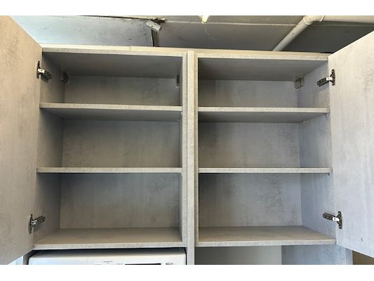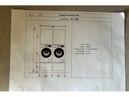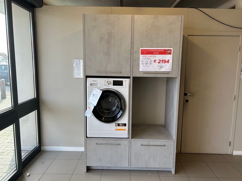 Wasplaats 128.1 x 65 x 217 cm hoog, nieuwprijs 2194 euro, front en corpus cloud, plaatmateriaal 27mm laminaat plinth...