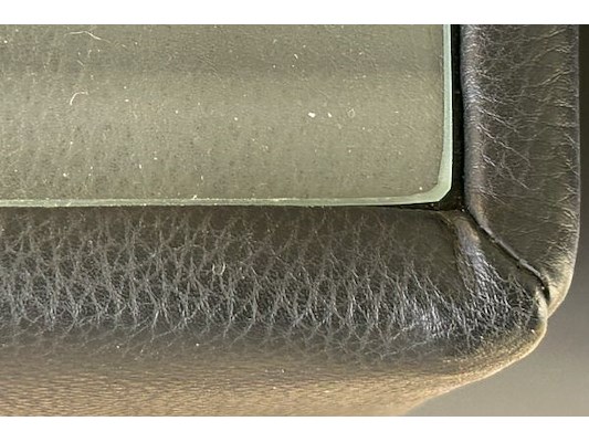 40 x 40 x 45 cm hoog, zwart leder met glazen blad, winkelprijs 215 euro/stuk
