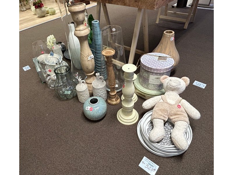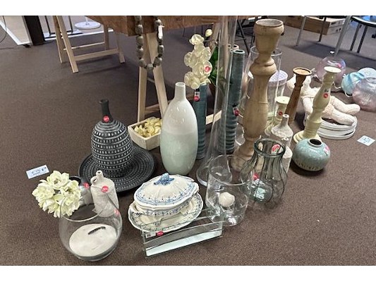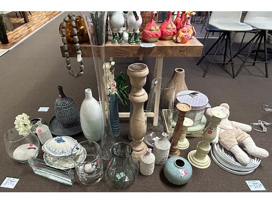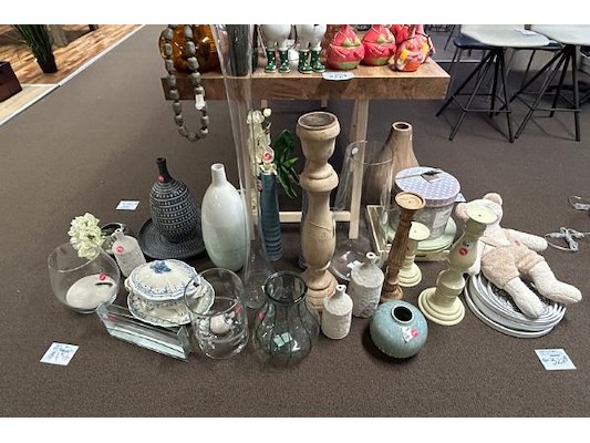 Ongeveer 30 stuks decoratie waaronder diverse vazen en schalen, winkelwaarde van 13.20 tot 76.90