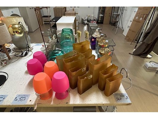 40 stuks decoratie waaronder kaarshouder, vazen, tafellampen, beeldjes, kopjes, ..., winkelwaarde van 3.50 tot 40 euro pe...