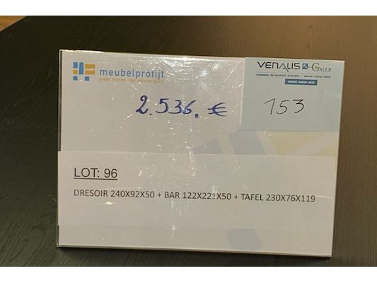 Dressoir 240 x 92 x 50 cm, barkast 122 x 221 x 50 cm hoog met verlichting, tafel 230 x 76x 119 cm, winkelwaarde 2536 euro